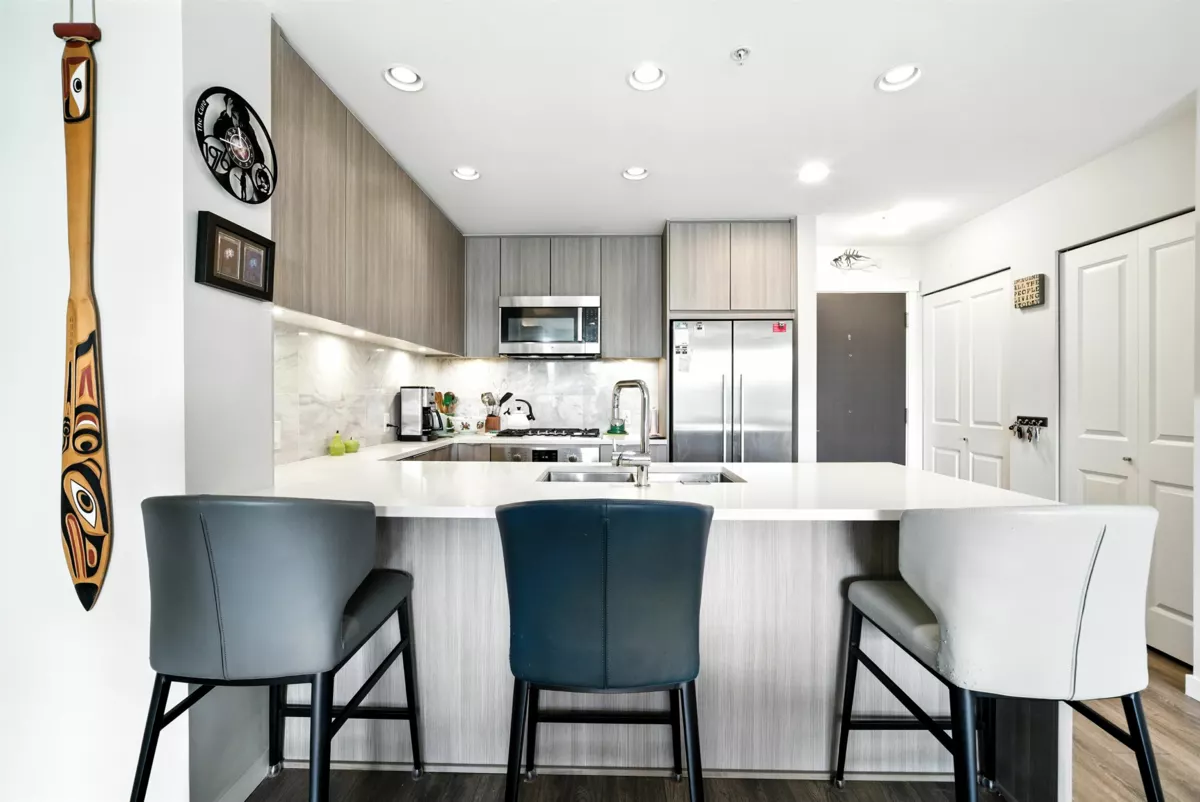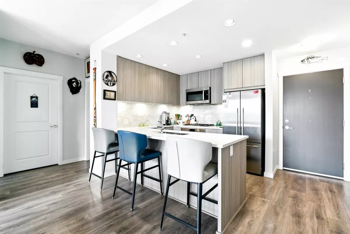 R+R by Polygon is a beautiful 944 sqft, 2-bedroom, 2-bathroom home located in Vancouver's River District. The home has an open layout, in-floor radiant heating, and laminate flooring throughout. The gourmet kitchen features stainless steel appliances, a gas range, and quartz countertops with an island which is great for entertaining. The primary bedroom easily fits a king-sized bed and has a walk-in closet and a spa-like ensuite with double vanities. This unit has great California Closets built ins added by the Sellers. The pet-friendly building offers a fully equipped fitness center, parking, and storage. It is located within a master-planned community with a future elementary school and community center and is steps from scenic trails, parks, a grocery store, restaurants, and banks.