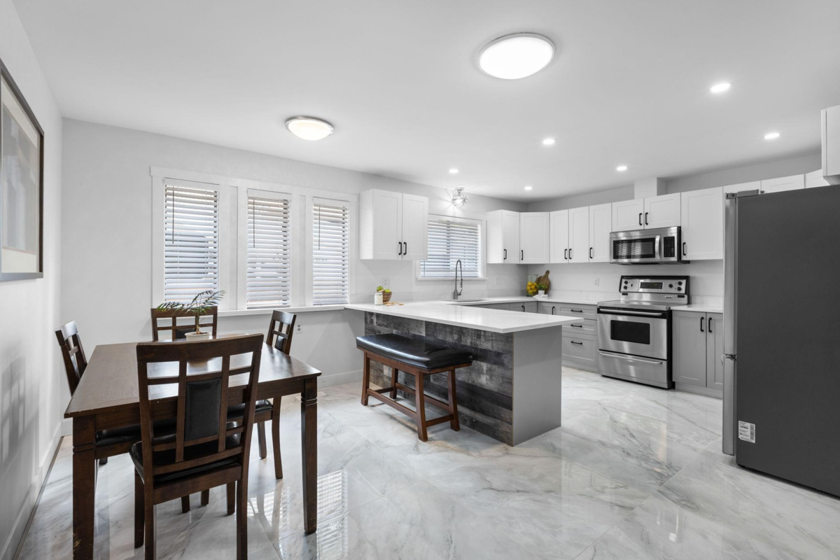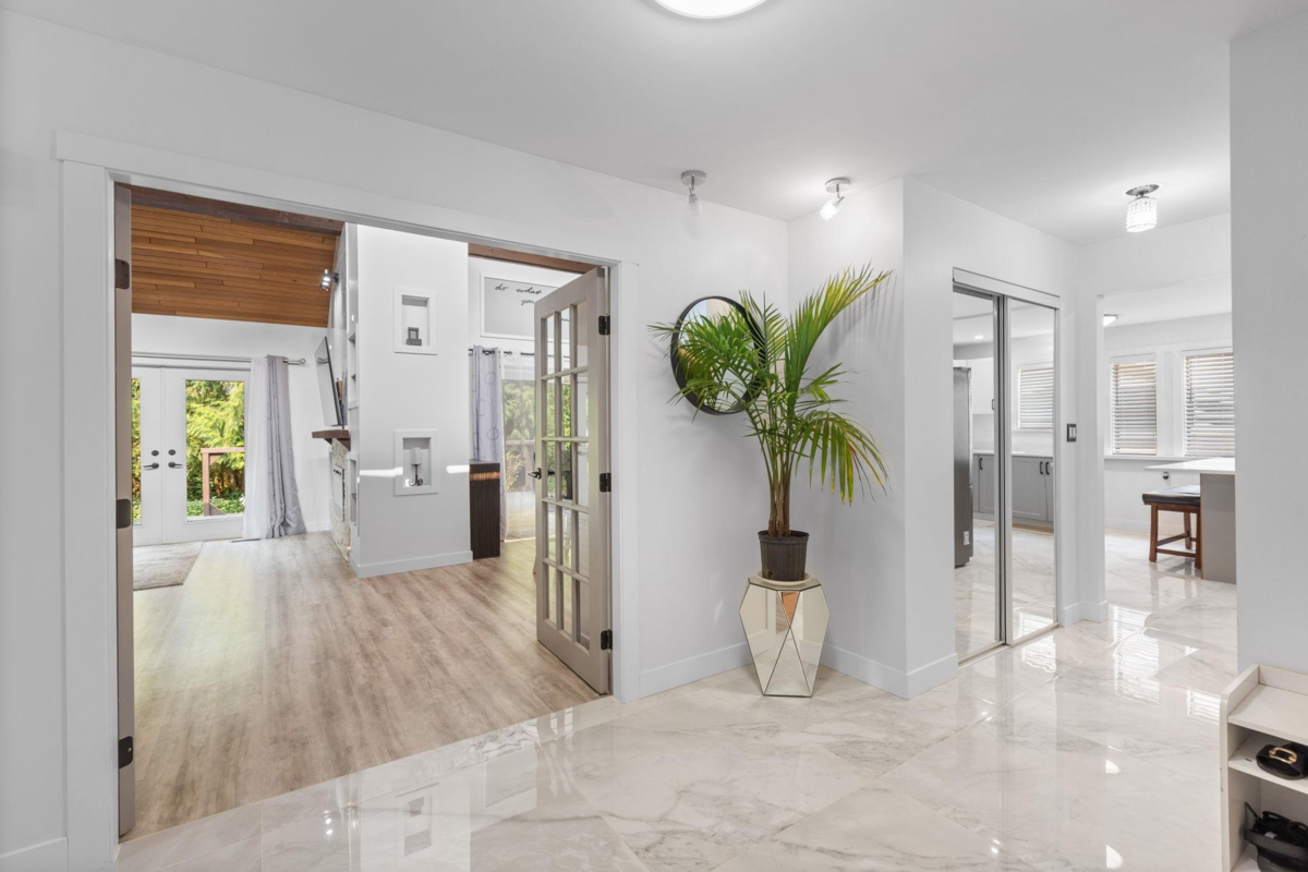 Welcome to Mossey Estates! Set on a private 9,500+ sq ft lot with great curb appeal, this home offers 4 bedrooms including a spacious primary with W/I closet and 2 renovated bathrooms. A large foyer opens to soaring 16-ft vaulted ceilings in the living and dining area, complete with a built-in bar, sleek electric fireplace, and French doors to the deck. The updated kitchen has new cabinetry, quartz counters, stainless steel appliances, and a convenient pantry. Sliding doors off the family room lead to a private backyard framed by mature trees. Updates include a new roof, fresh paint, new lighting, hot water tank, and A/C throughout. Outdoors enjoy a two-car garage and a quiet neighbourhood near top schools, shopping, and amenities. Move-in ready and truly a rare find.