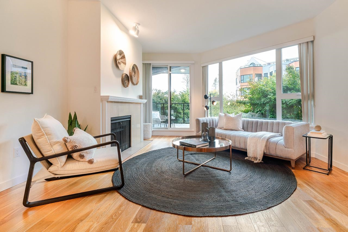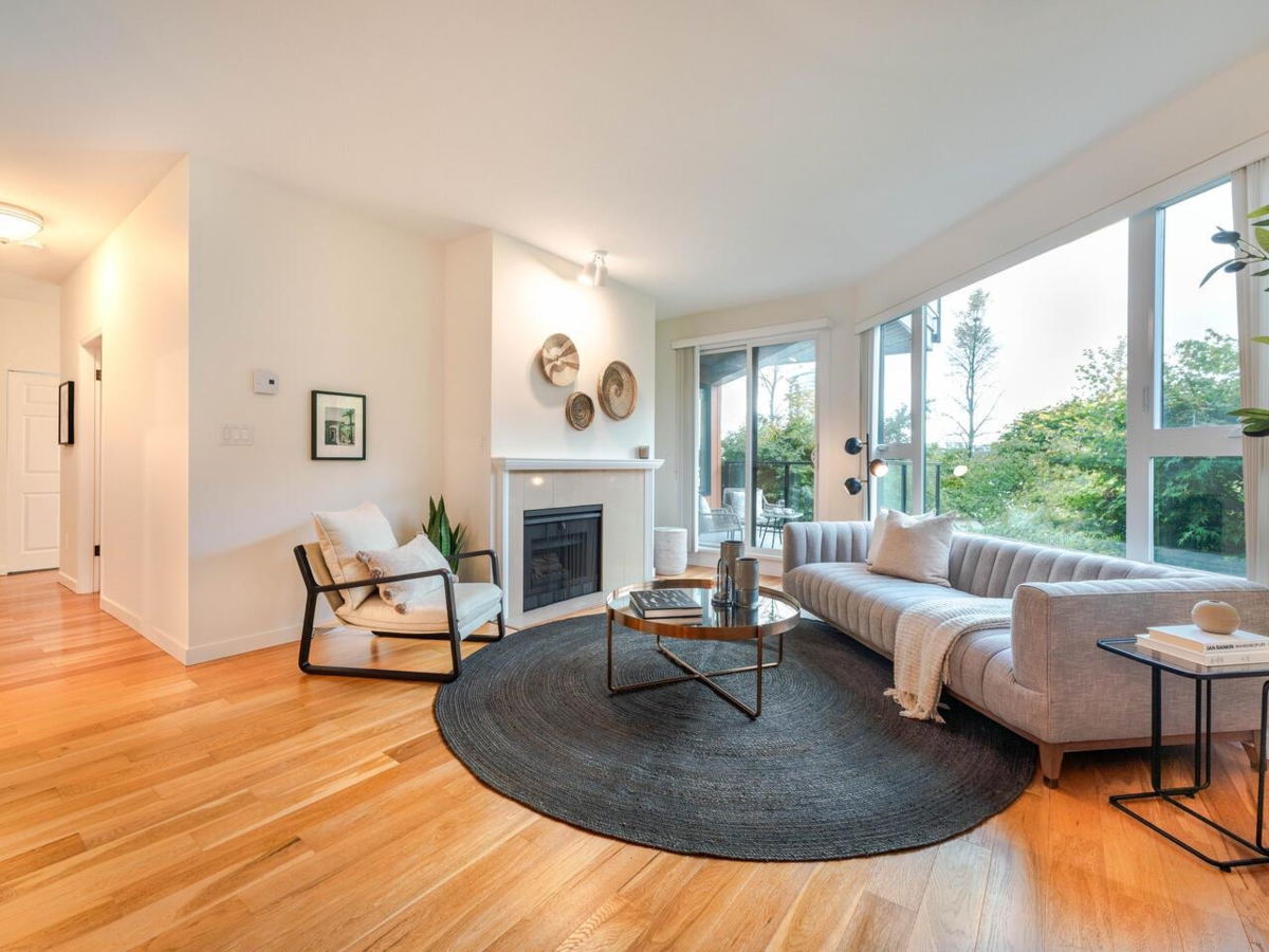 SPACIOUS 2BR/2BATH condo in Westport! Building has undergone a total Rainscreen with fibre-cement board, new Roof & Windows, giving you peace of mind. Features Engineered HW floors, cosy Gas F/P, large kitchen, high 8'11 ceilings in most rooms, HotWater tank, some River views. Enjoy dinner and drinks on your large 104sf deck as you watch the sunset over the beautiful gardens. Take an afternoon stroll/bike along the Boardwalk; enjoy entertainment, cinemas, shopping & great food just 700m away. If you need to zip to Vancouver you're just 500m from Skytrain. 2 Pets OK with some restrictions. Longtime resident Caretaker; Library. Measured at 1139sf by BC Floor Plans; Strata Plan = 103.0 sqm (1108.7sf). AC/Heat Pumps & EV chargers ok w/SC permission. 3D Matterport!