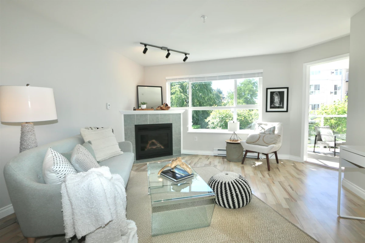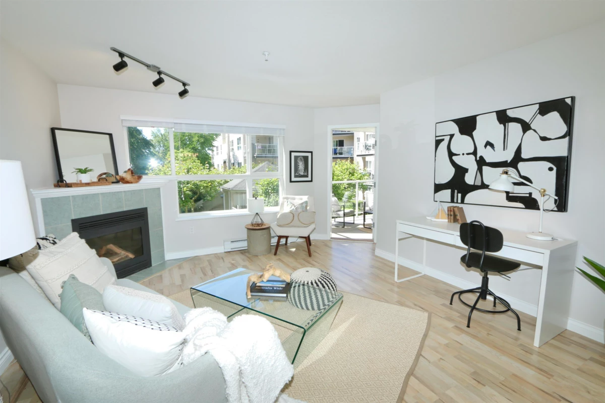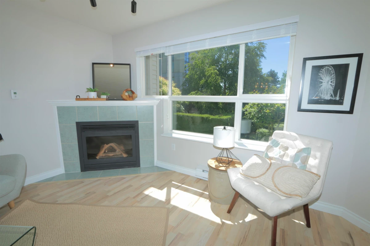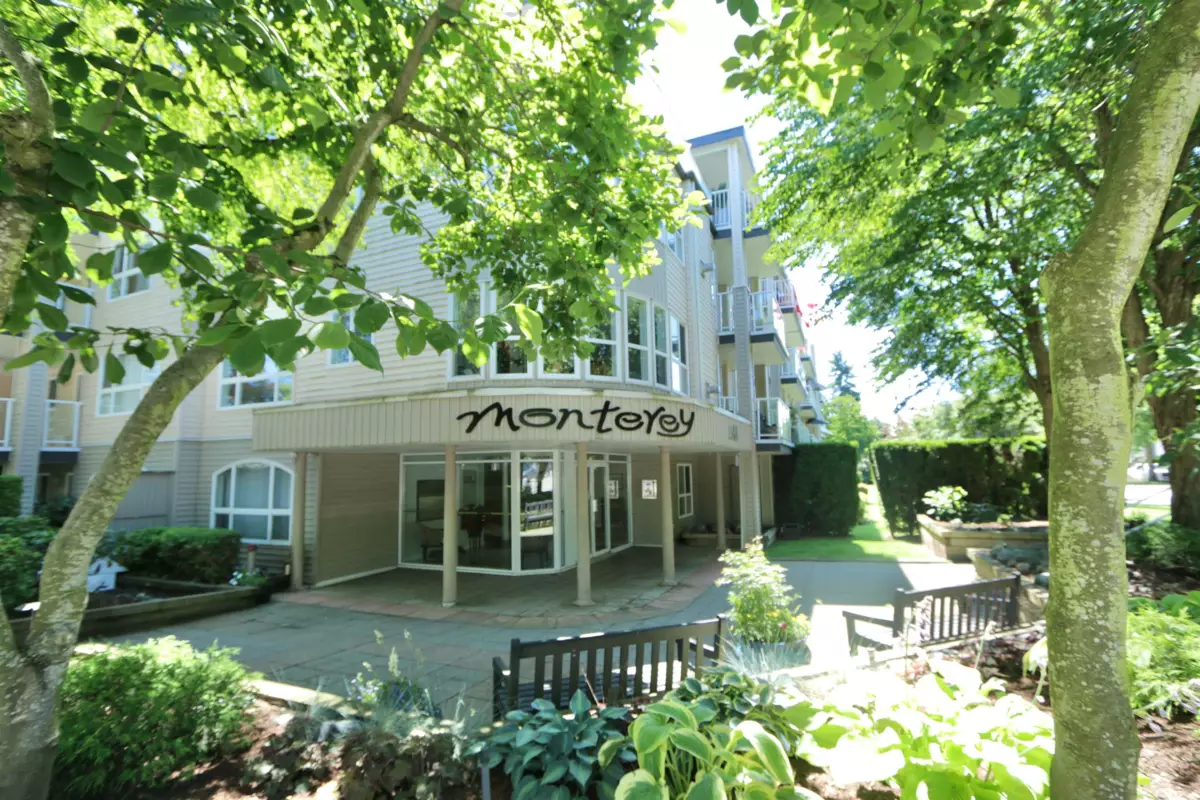 Beautiful spacious one bedroom condo at the Monterey. Bright and airy w large windows overlooking the lush quiet courtyard. Move-in ready w many updates: laminate floor, neutral paint, lights, blinds, updated kitchen w newer stainless steel appliances. In-suite laundry w newer washer / dryer & storage. Huge primary bedroom easily accommodates a king-sized bed & furniture. Snuggle by the cozy gas fireplace. Relax & bbq on the large sunny south facing balcony. Fantastic location: easy level walk to town centre, shopping, Peace Arch Hospital, transit and parks. Highly sought after complex, Monterey is pet friendly (one dog up to 25lb or 2 cats) & has no age restrictions. Lovely amenities: rooftop deck, gym, meeting room, courtyard gardens & gazebo. Gas, water and hot water included in strata
