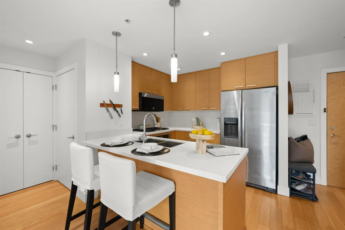 The Locarno – A boutique concrete residence featuring geothermal Heating and Air Conditioning, in an unbeatable West Kits location. A short stroll to Jericho Beach, the Tennis Club, Brock House, and the best of 4th Avenue. High quality finishings; white oak plank hardwood floors, Bosch appliances, gas range, quartz countertops, in-floor bathroom heating. The open kitchen and spacious living/dining area with soaring ceilings and a wall of windows create the perfect space for entertaining. With a flexible layout that easily accommodates a nursery or guest room and a separate office. 1 parking, large storage locker. Pets and rentals allowed. Accepted Offer, sub rem June 25th.