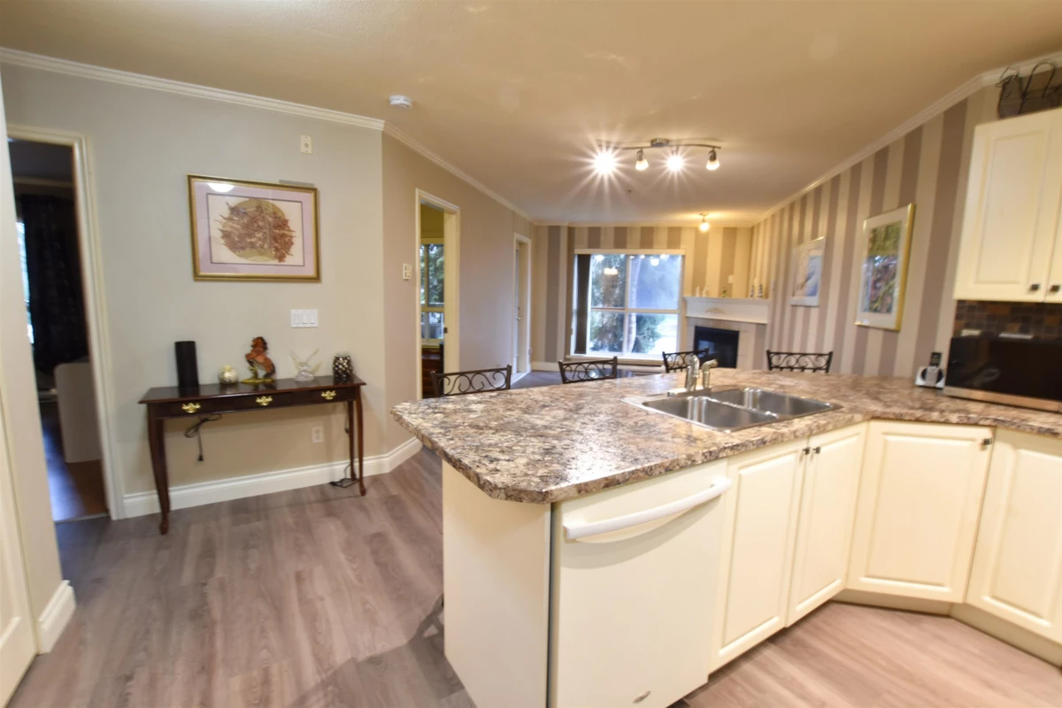 Welcome to Southridge Terrace. This bright corner two bedroom, two bathroom home offers an open layout and one of the largest patios in the building, perfect for relaxing or entertaining. Wide plank laminate flooring runs throughout, with crown moulding and granite countertops that add a finished, timeless feel. The spacious living and dining area flows naturally, making the home feel open and comfortable. The kitchen is well laid out with plenty of counter space, while in suite laundry and secure underground parking add everyday convenience. The building is centrally located, yet surrounded by nature. Golden Ears Provincial Park and Alouette Lake are just minutes away, offering endless outdoor recreation. At the same time, the walkable town centre nearby is filled with shops,