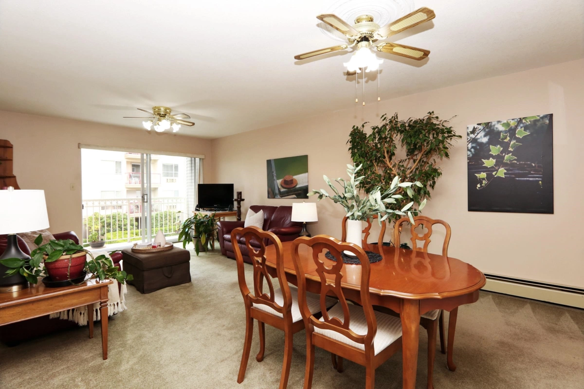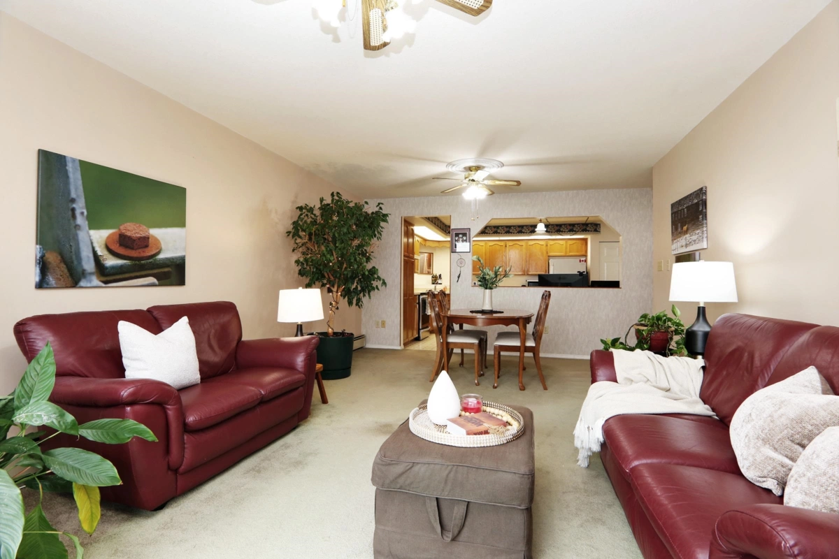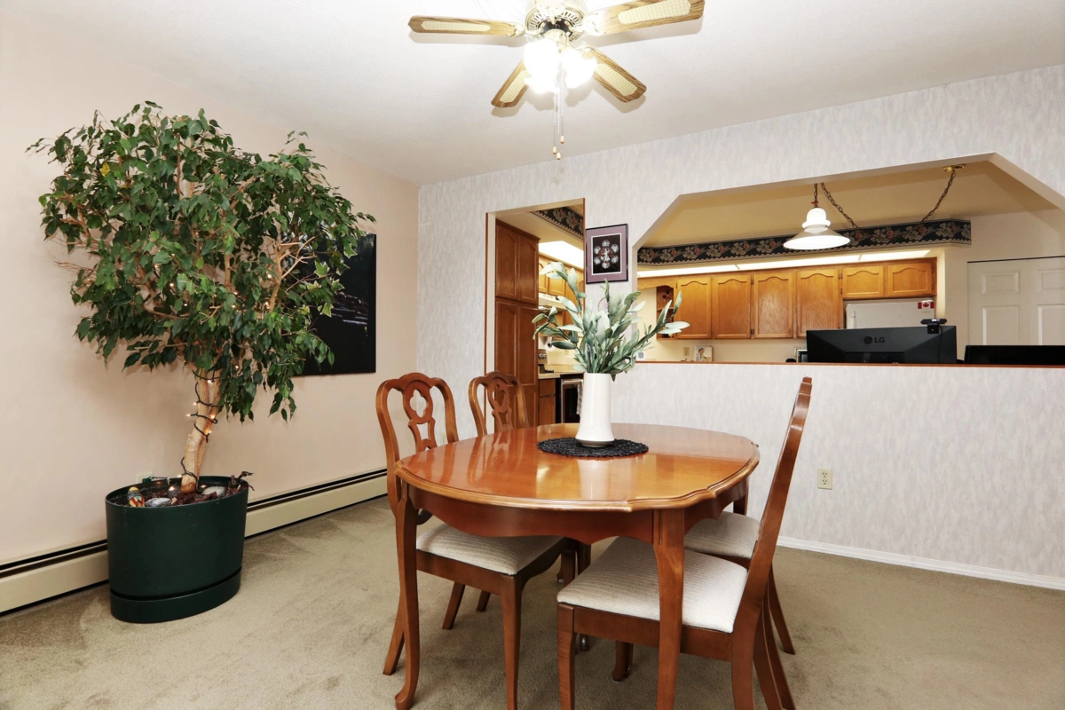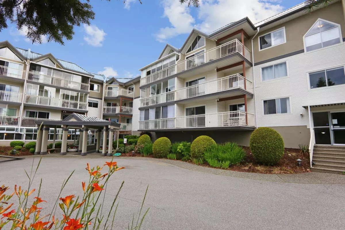 Super condo in the highly desirable Royal Court building in West Abbotsford. Wonderful 1128 sq ft, 2 bed, 2 bath layout gives you an open roomy feel. Over-sized eat in kitchen, dining room & living room. This unit is on quiet side of building overlooking the community garden plots. This location is hard to beat next to Clearbrook Mennonite Brethren Church, and quick walk to shopping, medical, banking & more. This quiet building has workshop/rec room, & is a no smoking, no pet, 55+ complex.