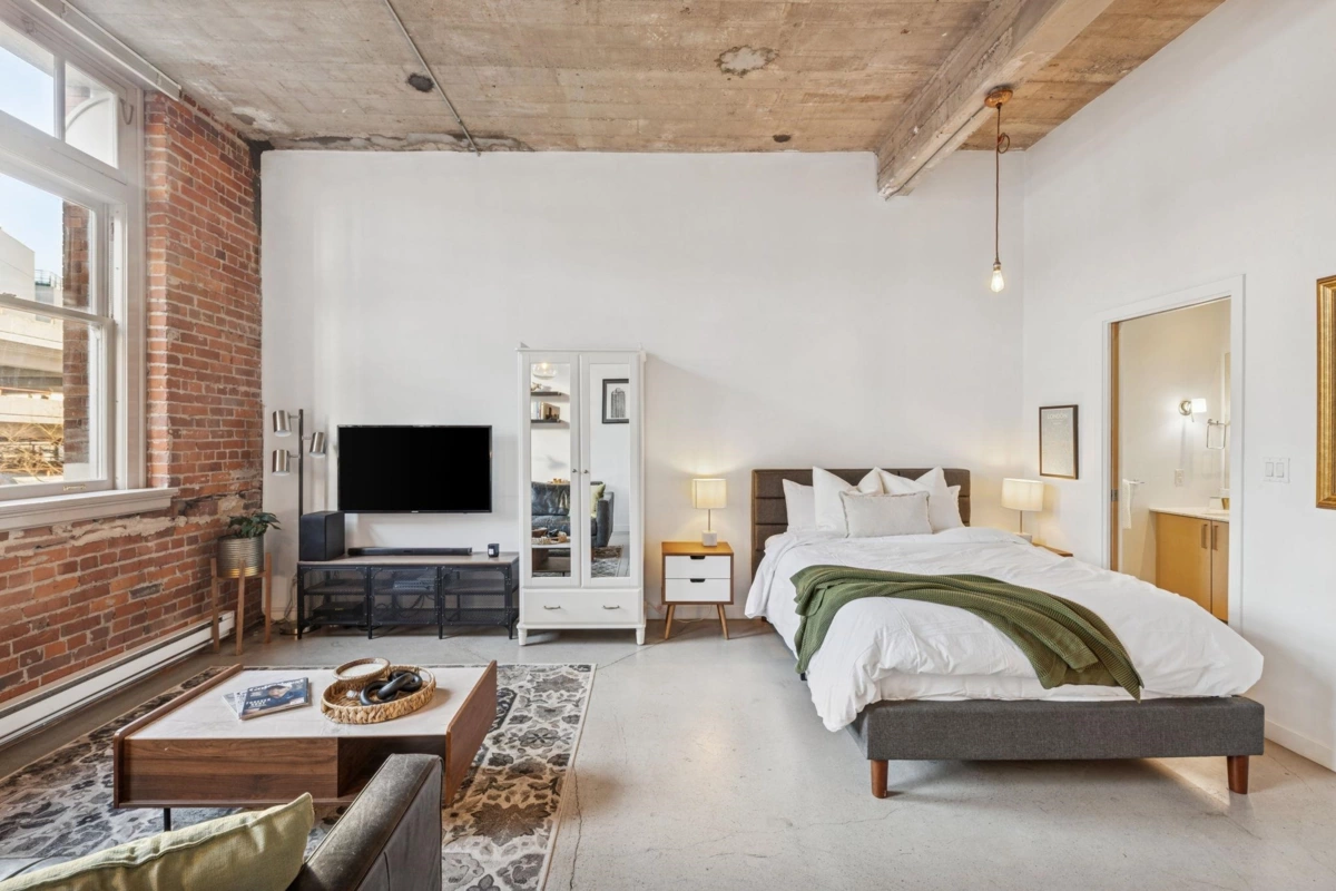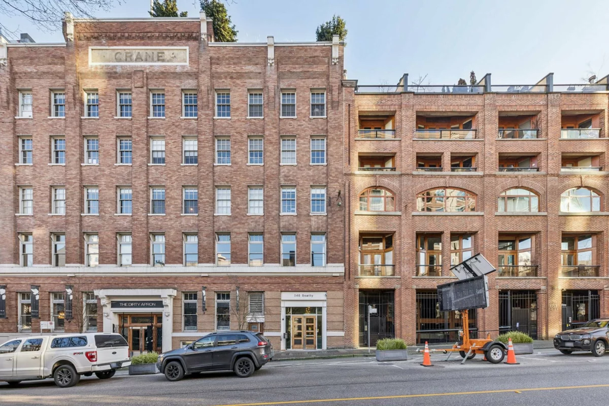 Proudly presenting this rare, timeless, & character-rich NYC style loft at the sought after 'The Crane' building. Rugged elegance meets a prime urban location in this thoughtfully modernized historic space. The home features soaring 11'11" ceilings, authentic exposed brick, polished concrete flooring, striking suspended pendant lights, and oversized industrial windows allowing plenty of light. Perennial chef's kitchen features top rate S/S appliances, 13ft corian/marble counters & plenty of storage. Includes a spacious private storage room and 1 parking with access via car elevator. Situated steps from BC Place, Rogers Arena, Skytrain, & Vancouver's trendy Crosstown restaurants & shops - one of Vancouver's most historic and refined buildings. The suite & building are a must see in person!