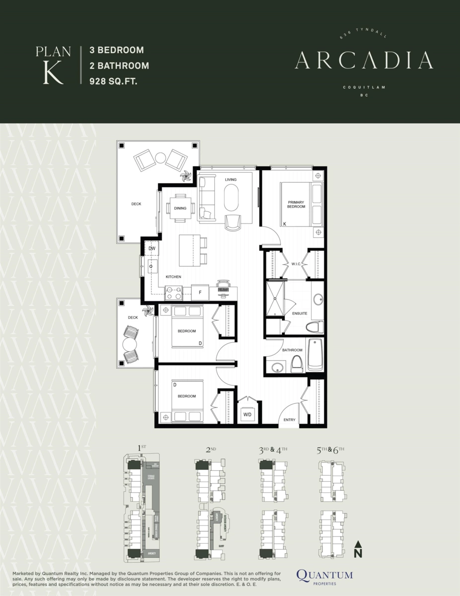 Welcome to Arcadia in Coquitlam West. This 3 bedroom, 2 bathroom home offers 928 sq. ft. of contemporary living with a functional open layout & one secure underground parking stall included. Bright living areas feature 9’ ceilings, laminate flooring, & central A/C. The modern kitchen includes quartz countertops, two-tone cabinetry, stainless steel appliances, & soft-close drawers. The primary bedroom offers a walk-in closet & private ensuite. Spa-inspired bathrooms feature porcelain tile & matte black fixtures. Enjoy private outdoor space plus amenities including a fitness centre, clubhouse, bike room, playground, & storage. Steps to SkyTrain, parks, & shopping. Only 5% deposit required to secure a home. Presentation Centre: 4 – 555 Clarke Road, Coquitlam.