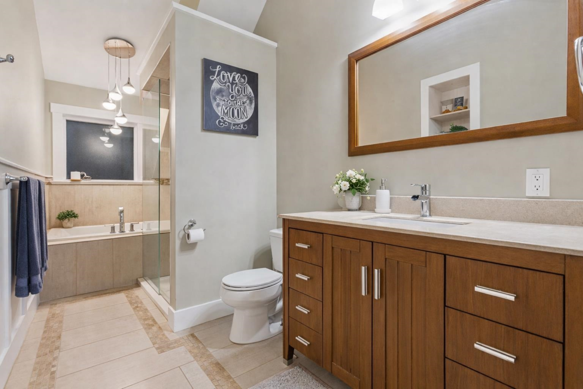 One-of-a-kind, beautifully updated Whistler-inspired home on a large prime corner lot in the heart of Brookswood. Welcoming front veranda leads into a warm, character-filled home with refinished hardwood floors, crown moldings, and spacious living room with cozy gas fireplace. The 2024-renovated kitchen features natural wood cabinetry, quartz counters, dual-drawer DW and new gas range, flowing to the family room and out to a sunny south-facing yard with covered deck—perfect for year-round entertaining. Main offers a generous bedroom plus den. Upstairs showcases high ceilings, dormers, hardwood floors, barn doors, and 4 unique bedrooms incl. a stylish primary with 5-pce ensuite. Newer roof, furnace, tankless hot water, gas FP insert & new asphalt driveway. Quiet and very family-friendly!