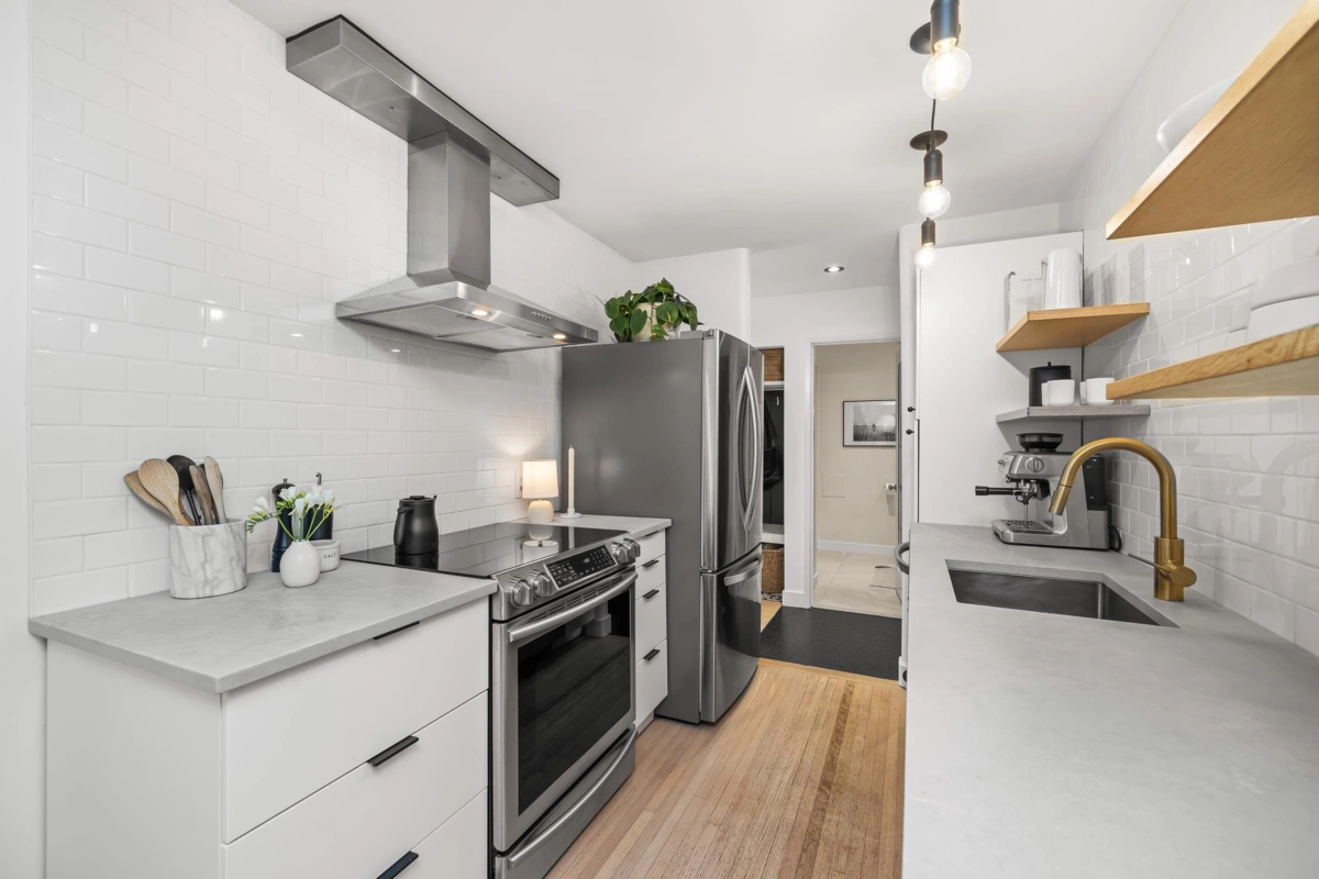 Enjoy this beautifully renovated 1 bed + den, 1 bath condo just steps from Kits Beach. The fully updated kitchen and bathroom set the tone for modern living, while hardwood floors throughout add warmth and style. The versatile den is ideal as a home office, extra storage or nursery, and the bright east-facing living and dining area welcomes morning light and flows to a sunny outdoor space perfect for summer barbecues. One parking stall, your own storage locker and in-suite laundry complete this turnkey home, backed by a proactive, pet-friendly strata. On one of Vancouver’s most charming streets; only a five-minute stroll to the beach and a 12-minute walk to downtown. Open Saturday 2-4 | Sunday 1-3