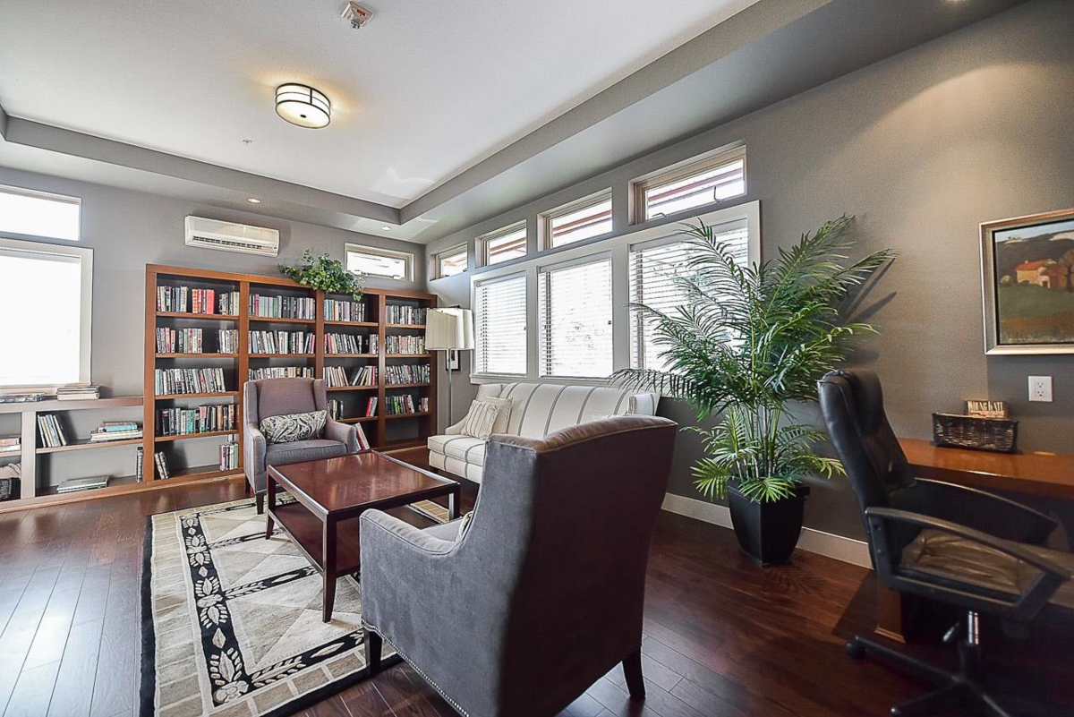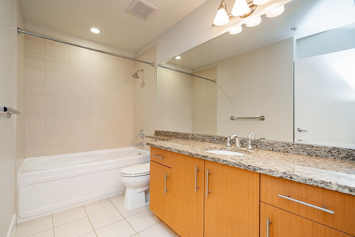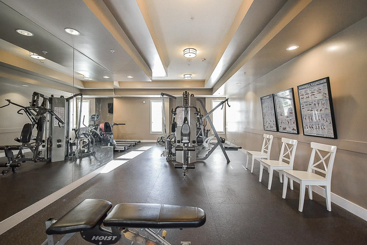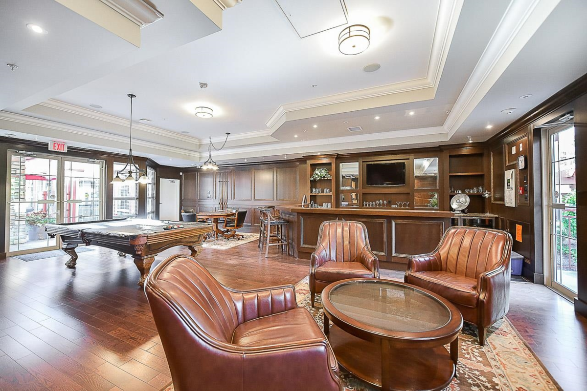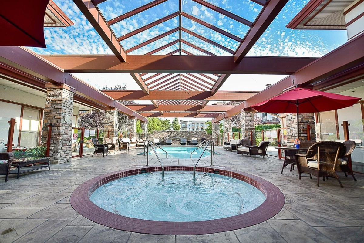 Introducing St. Andrews at Northview Golf Course. This spacious 1,304 sq ft 2 bed, 2 bath & den home offers 9 ft ceilings & bright south-facing exposure. Features include a large kitchen w/ s/s appliances, granite countertops & hidden roll out platform to serve as a coffee bar or baking station. Convenient pantry & storage areas, expansive living & dining areas, primary bedroom with 5-piece ensuite & walk-in closet, built-in storage throughout, in-floor radiant heat & a large laundry room with updated washer & dryer. Enjoy a spacious south-facing, covered balcony with gas hookup & hose bib, 2 parking stalls & resort-style amenities: pool, hot tub, steam room, fitness centre, billiards room, library & 2 guest suites—all within a gated community & close to shopping.