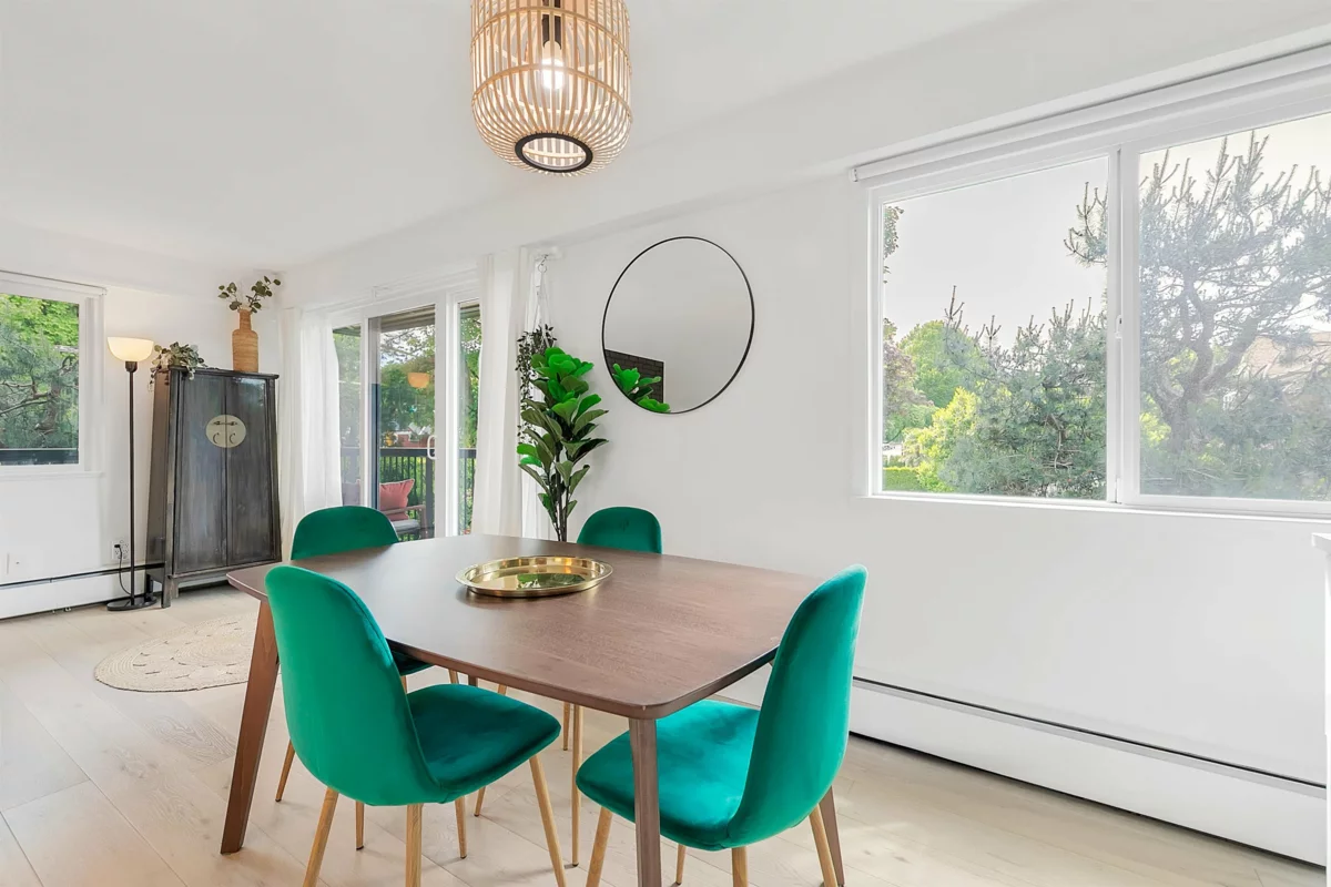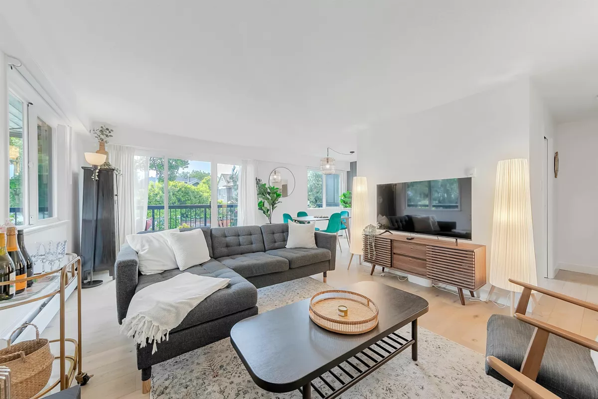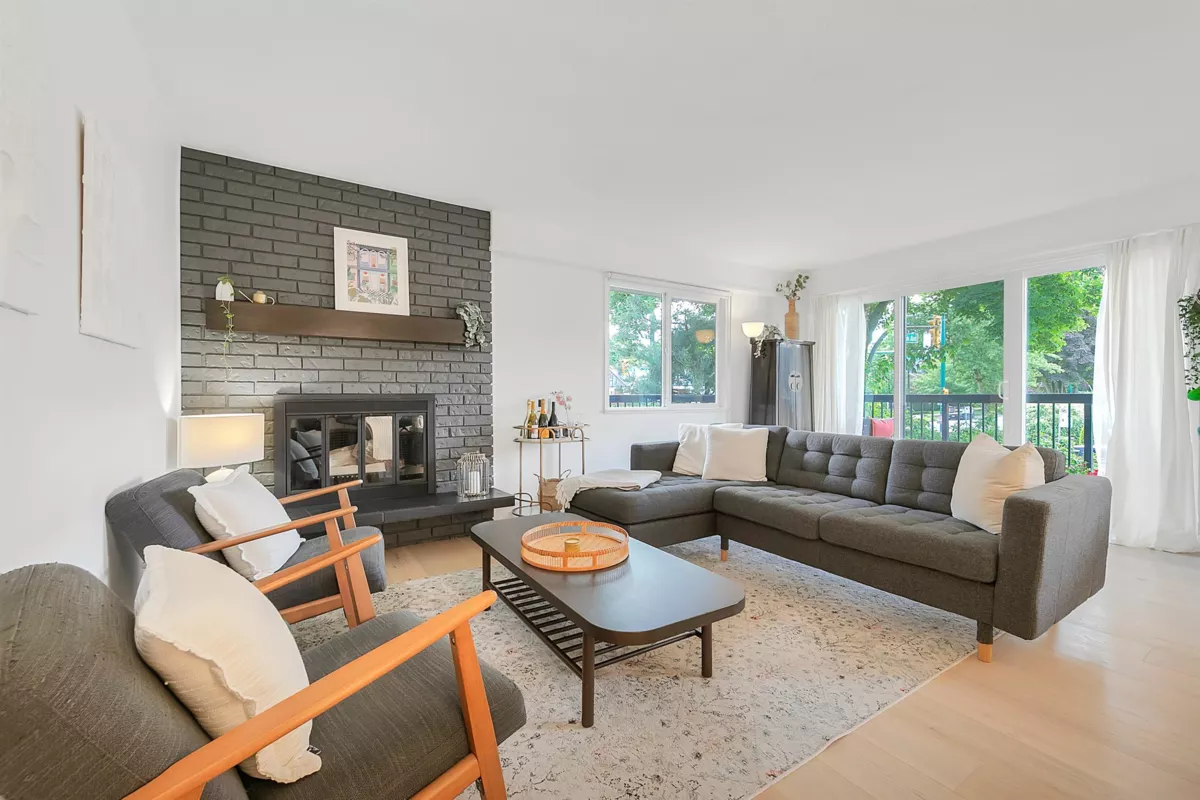 SPACIOUS & RENOVATED! 2 Bed/2Bath w/ in-suite Laundry & RAINSCREENED in a Prime location on the border between Fairview & Kits, steps to W. Broadway & Granville Shops. Bright corner unit, new windows, white oak hardwood, new spa like baths w/quartz, house sized rooms w/ stunning brick woodburning fireplace. A custom modern white Quartz & Stainless Kitchen extends into dining room with a built-in coffee bar. The primary suite enjoys walk through closet, laundry & half bath. Spacious 2nd bdrm. Large Wrap around balconies surround the whole unit & mature trees provide complete privacy. Secure Parking, Locker & Pet Friendly. FULLY RAINSCREENED (2015) w/ New Windows, exterior cladding, balconies, renovated lobby (2018), Roof (2009) & parking membrane (2021).