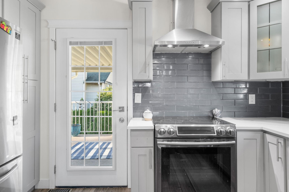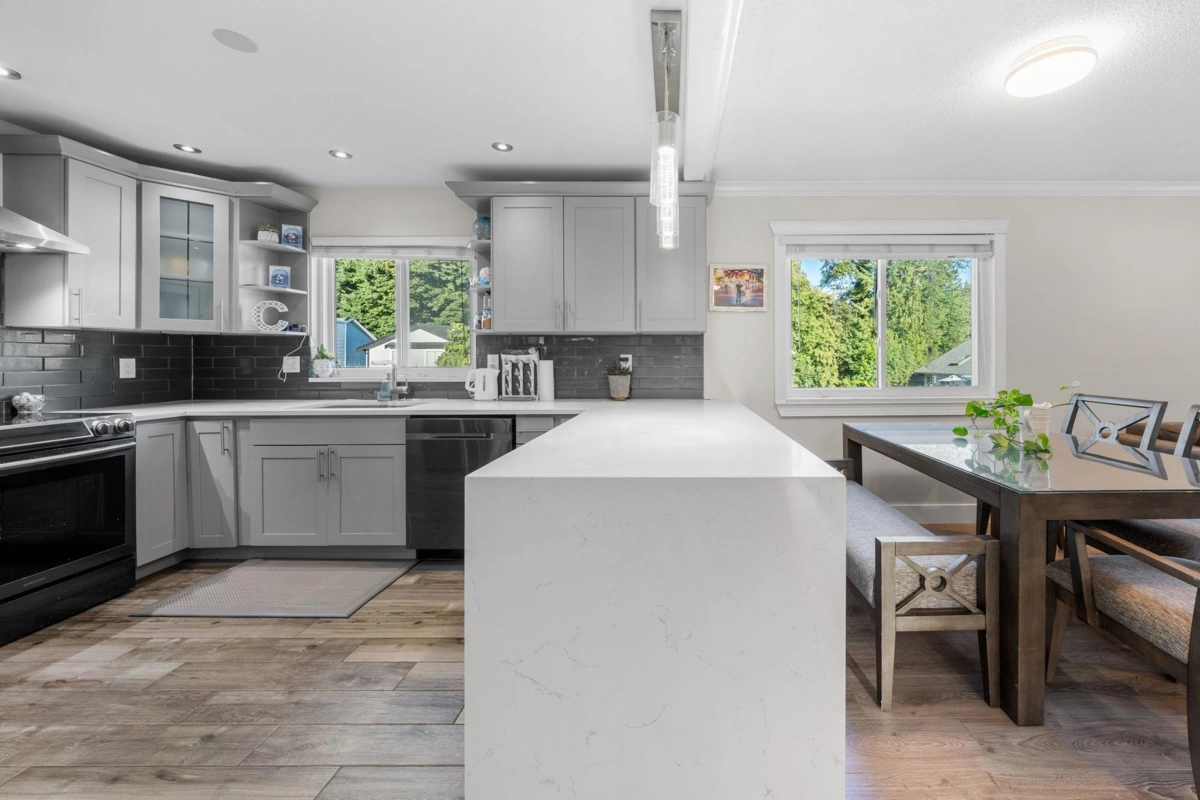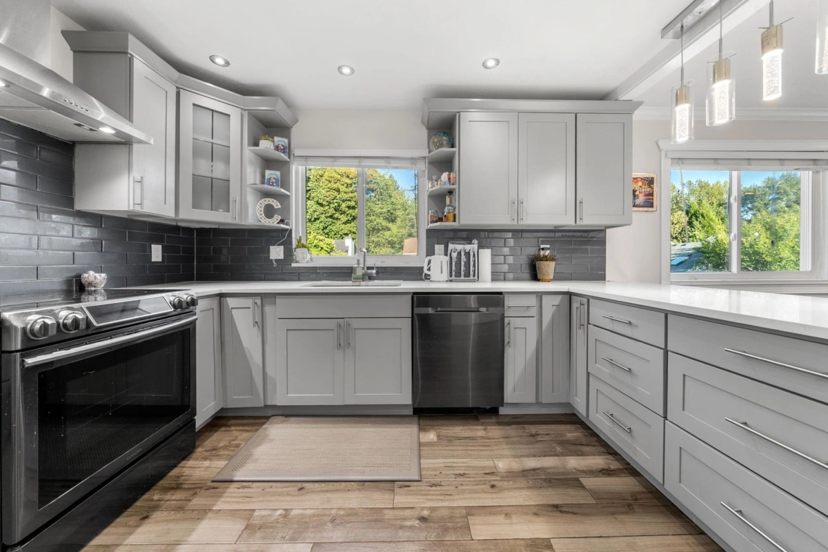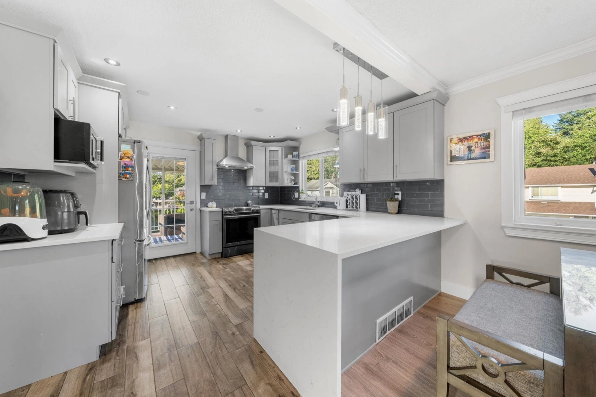 Beautiful fully renovated 5 bedroom home on corner lot in West Maple Ridge, This home is completely redone with new roof, window, gutters, siding, newer furnace, A/C, hot water tank, garage door and opener, flooring, kitchen cabinets/counters, all fixtures, glass handrail, deck & deck cover, exterior finishing and more. 3 generous bedrooms up with a 2 bedroom mortgage helper down with separate laundry and entrance. Huge driveway with room for RV or toys. Large corner lot close to schools, shopping, Westcoast Express and Golden Ears Bridge. Doesn't get much better.