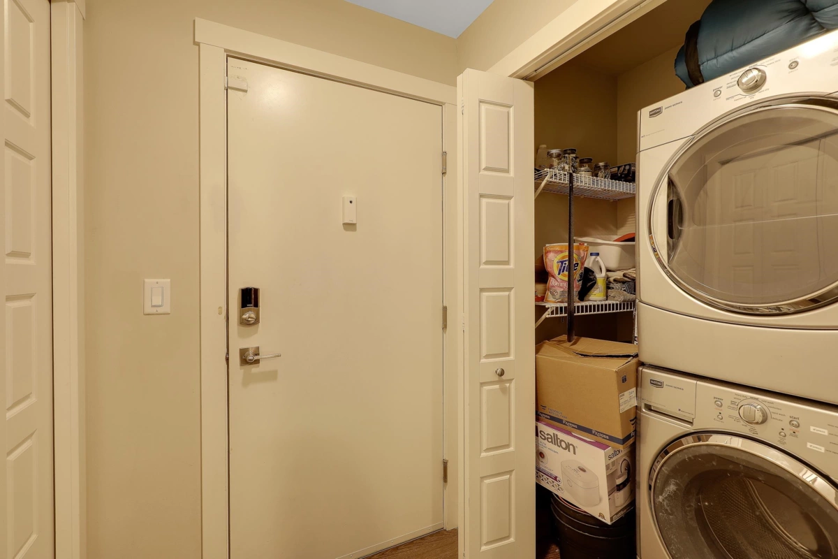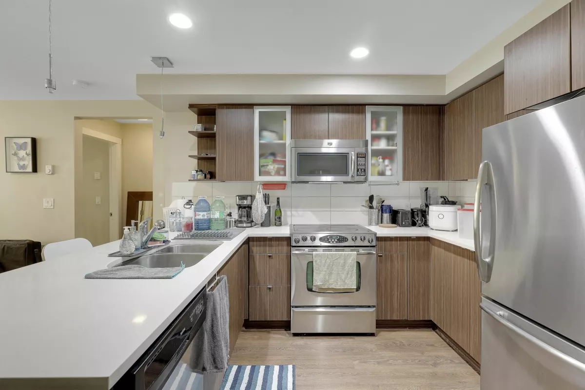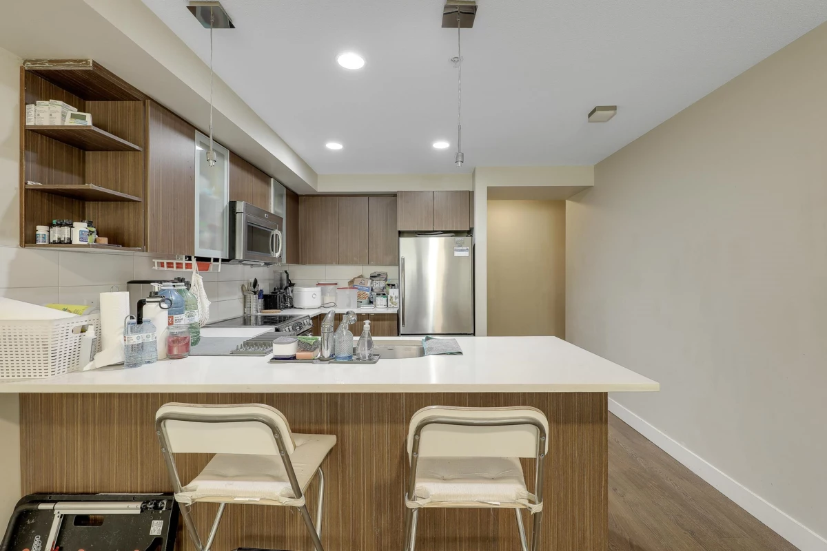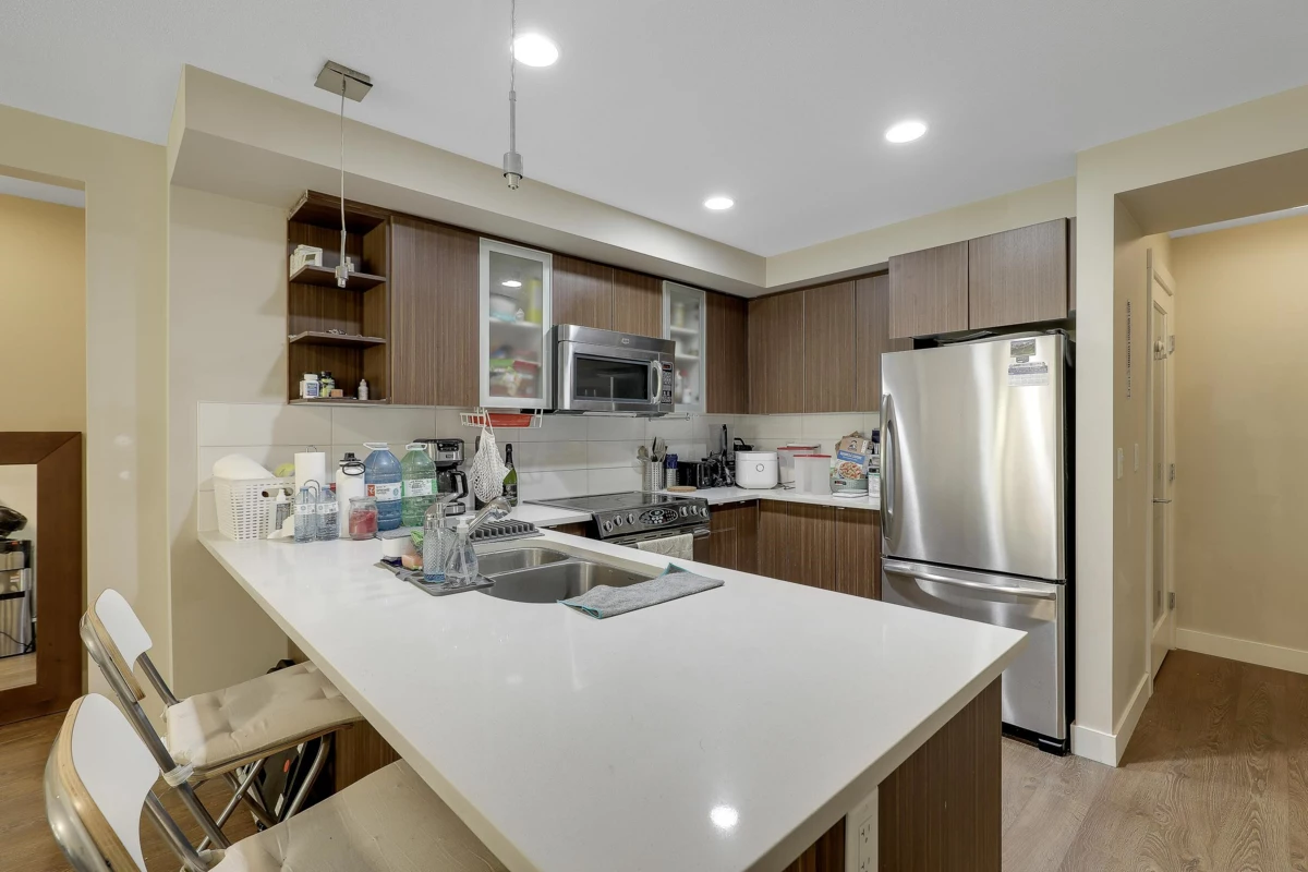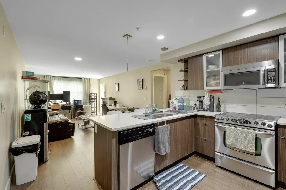 SOUTH-FACING 2 BED 2 BATH CORNER UNIT ON THE QUIET SIDE OF THE BUILDING! This bright, functional layout offers a gourmet kitchen with stainless steel appliances, modern full-wrap cabinets, under-cabinet lighting & Caesarstone counters. Spacious living/dining area with built-in fireplace & covered deck access. Primary bedroom features walk-in closet & 4-pc ensuite. Moen fixtures, ceramic tile & premium finishes throughout. Includes secure parking, storage locker & 2 elevators. Pets & rentals allowed. Beautiful, well-managed building close to shopping, parks & transit.