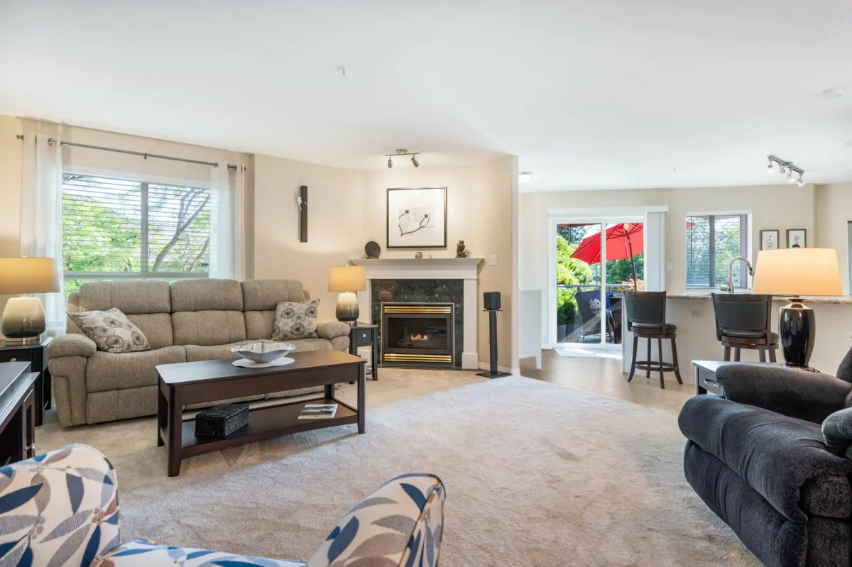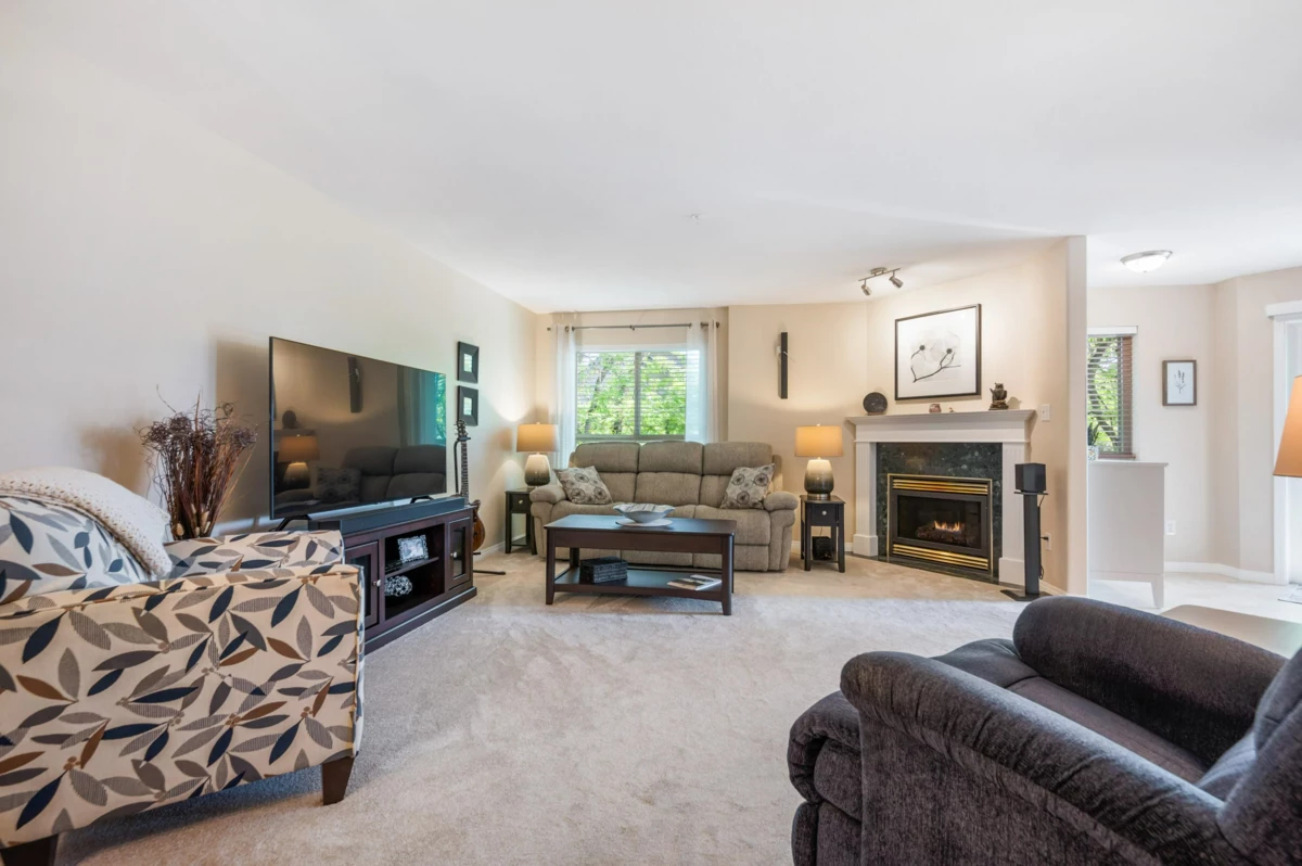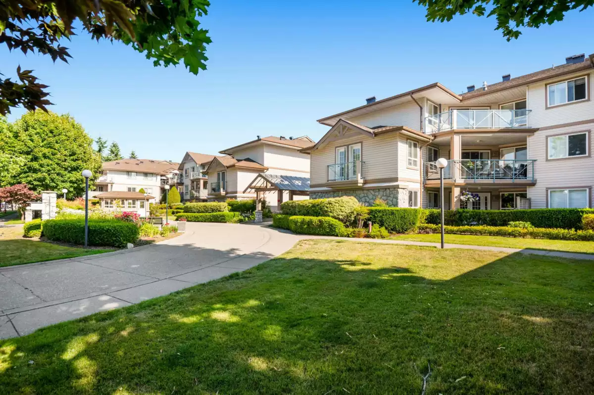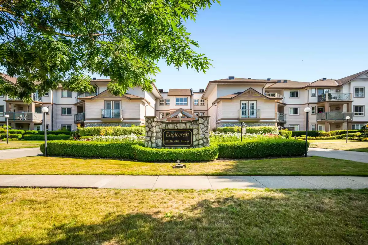 Gorgeous top floor SW corner unit located in Murrayville’s premier Eaglecrest complex. The 2 bd 2 bath condo features 1135 SF of spacious living all updated in the last 2 years! The elegant living/dining rm features a cozy gas FP & open layout suited for entertaining & relaxation! Bright kitchen w/wht cabs, breakfast bar, eating nook & S/S appliances. Spacious balcony on quiet side of the blg. Mbdrm w/3 pc ensuite & 2nd bdrm w/easy access to 4 pc bath. Updates: new appliances, flooring, countertops, kitchen/bath cabs refaced, soft-close hardware, plumbing fixtures, lighting, blinds, paint & patio resurfaced! Well-managed blg! 2 Secure U/G pkg stalls, plenty street pkg, locker, gym, & lg amenities rm. Great location close to shopping, cafes, WC Blair Rec Centre, library, hospital & transit.