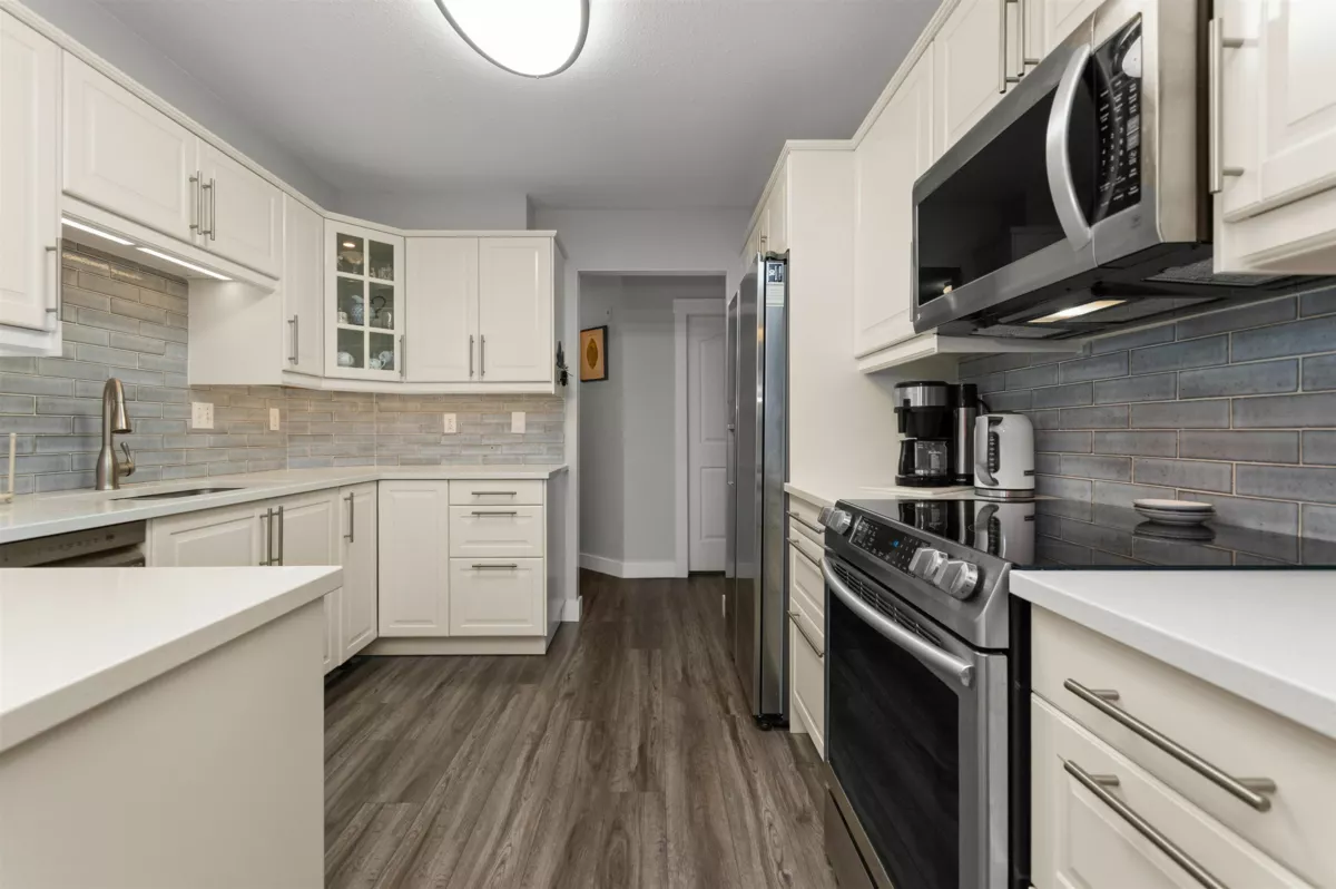 Rarely available home in the 55+ community of Lakewood Gardens. Fantastic central location just steps away from shopping and Mill LakePark. You’ll love this UPDATED spacious 1283sf, 2 bed / 2 bath CORNER UNIT. This home boasts amazing kitchen & bathroom renos. The kitchen has ample cabinetry, generous counter space & newer appliances. Open-concept living & dining area w/ cozy fireplace. Large windows fill the space with natural light. Enjoy the added benefit of a partially enclosed covered balcony. Included storage unit located next to the suite for ease of use. In-suite laundry & large space for pantry. Well managed building with secured entry & elevator access. Amenities include a guest suite, gym & a community lounge. 1 underground parking spot. Hot water heat & gas incl in strata fee.