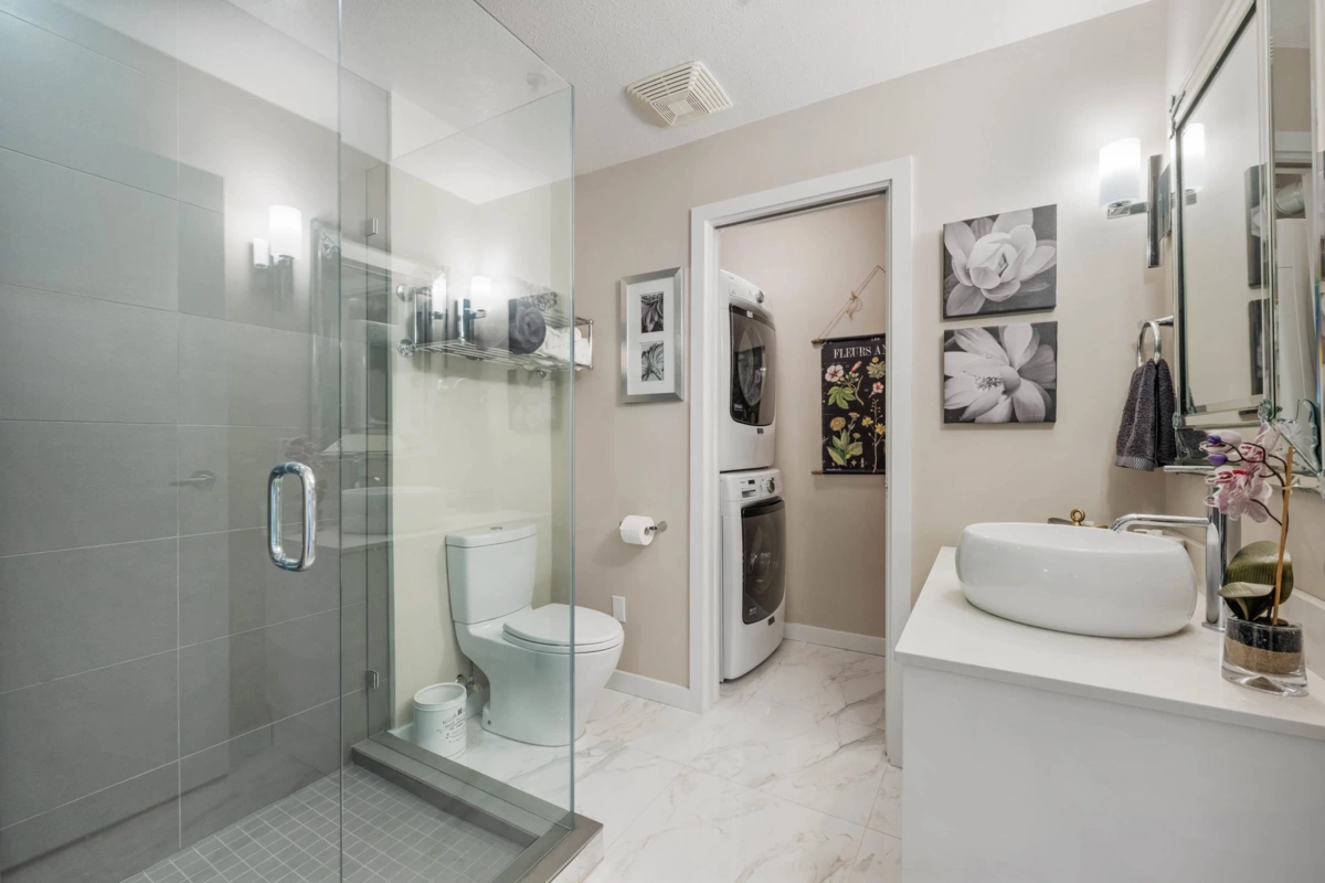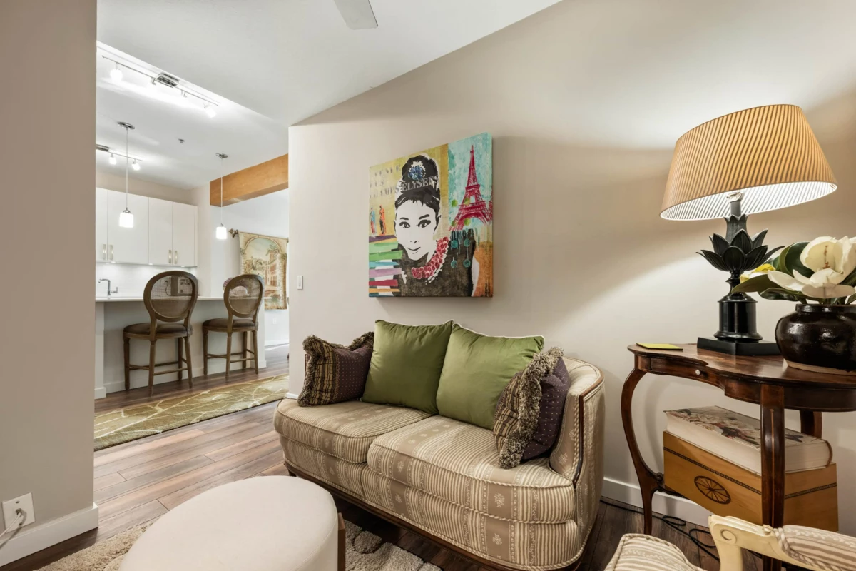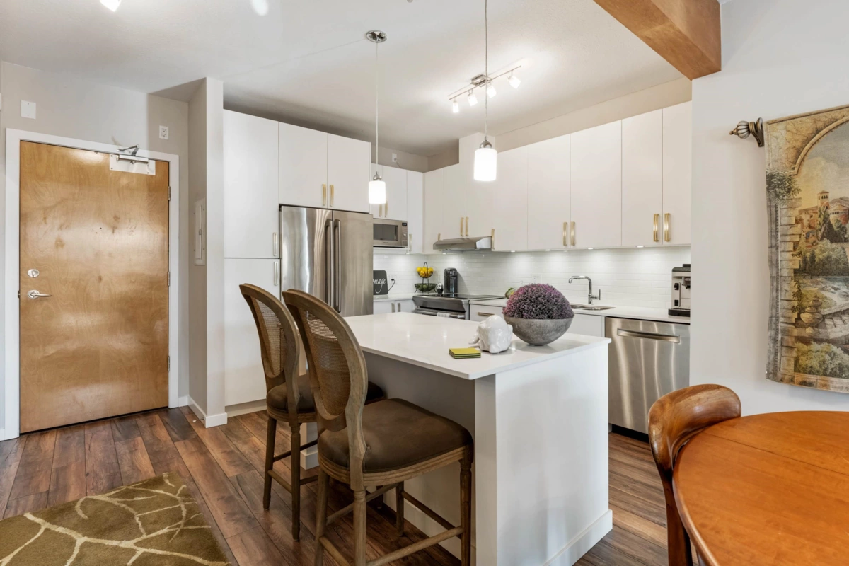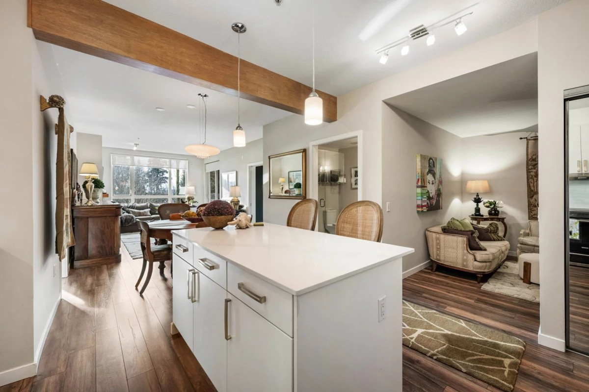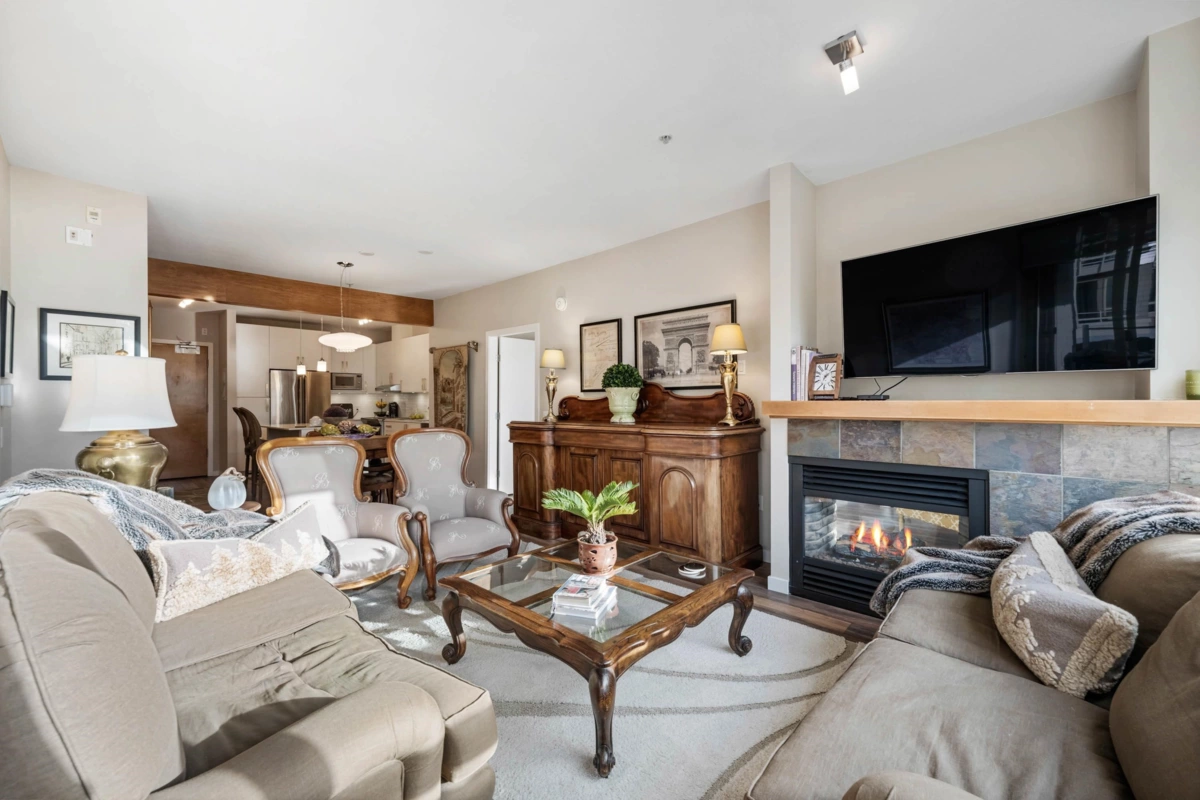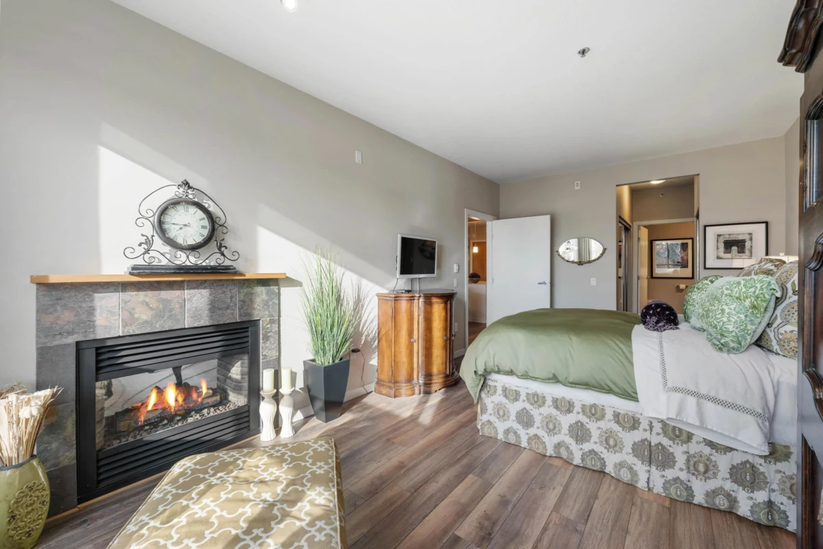 Beautifully updagted 2 bed & den with 2 baths home at Seasons West in the Ravenwoods community. Offering 1206 sqft of bright spacious living this home is filled with natural light and a warm inviting feel. Updates include refreshed countertops, cabinetry, appliances, tile work & modern bathroom lighting creating a timeless move in ready space. The open living area features a two-way natural gas fireplace shared with the spacious primary bedroom. The second bedroom includes a built in Murphy bed ideal for guests while the den offers flexible space for a home office. Enjoy the inlet water views from your covered and peaceful patio space. Includes two parking stalls, one oversized accessible with EV potential plus one storage locker. Open Houses - Both Saturday & Sunday from 2-4PM