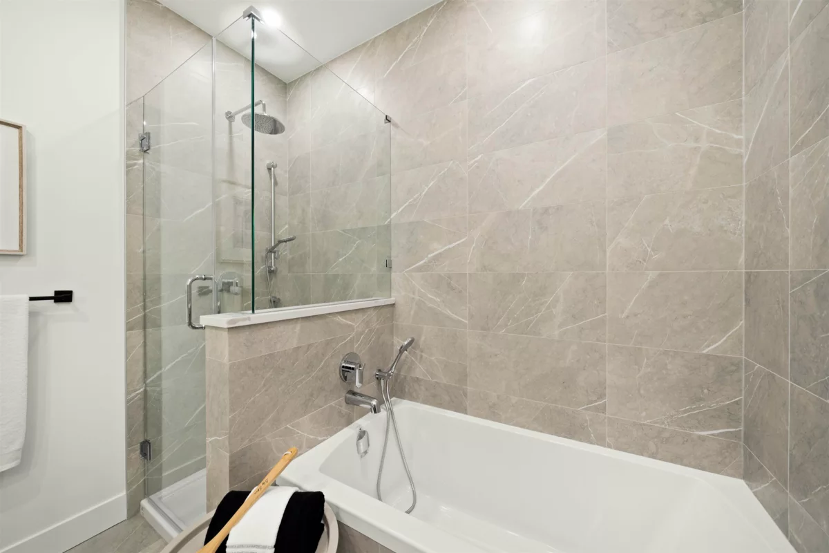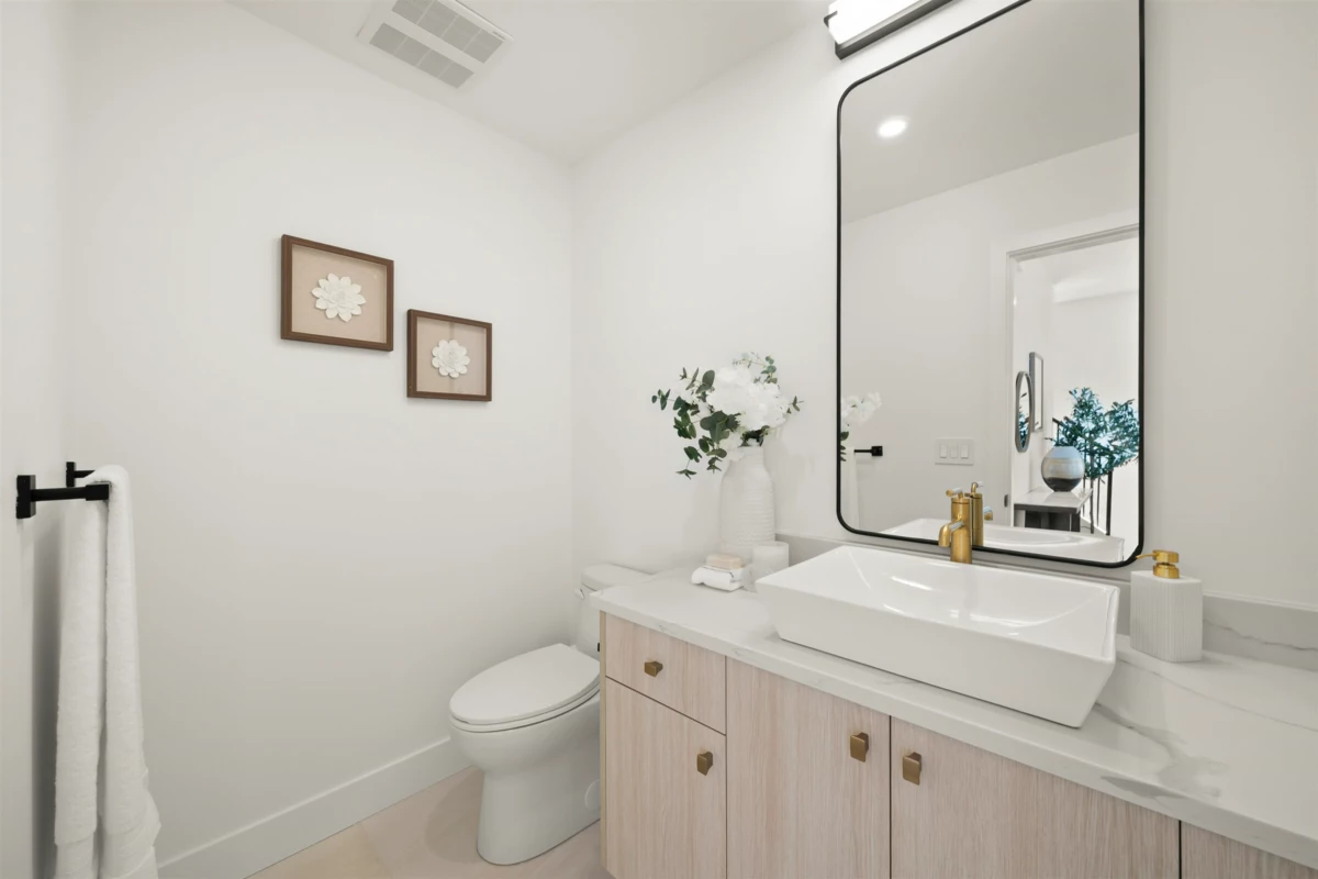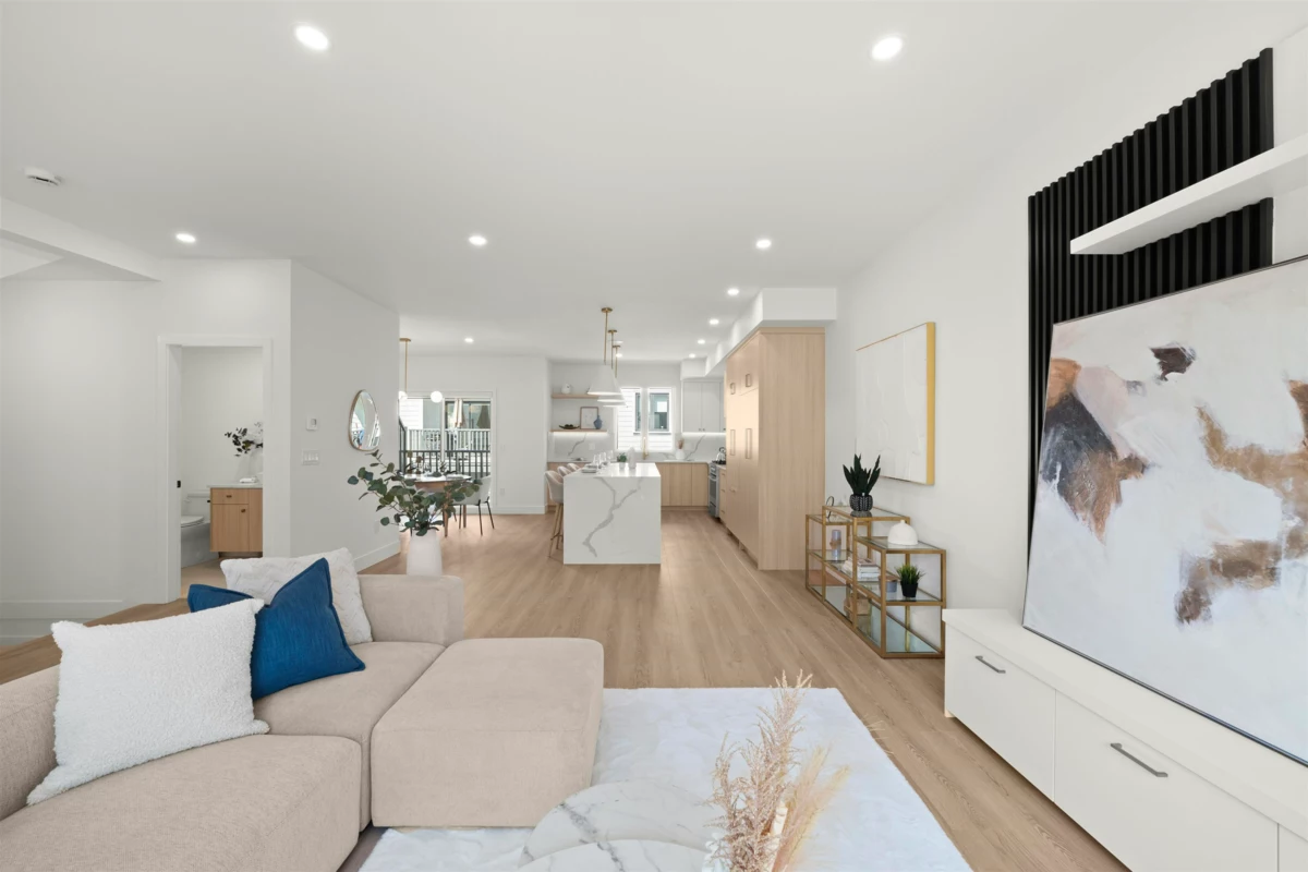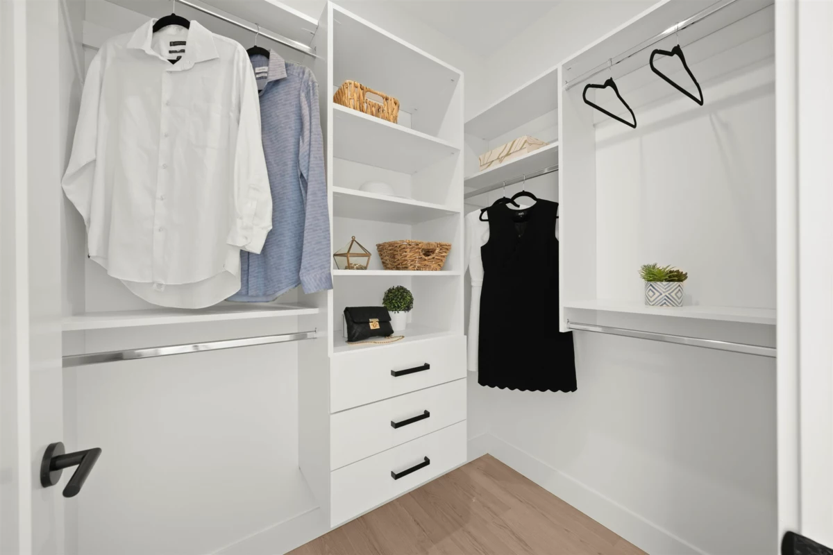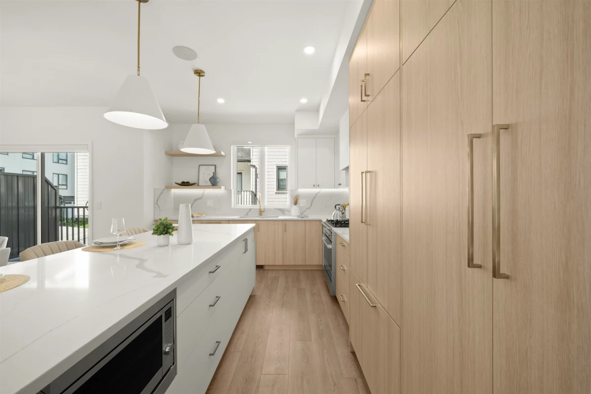 LAST H1 PLAN! 3 bed + flex END townhouse w/ all of the bells & whistles of a detached home! Private on the east side - facing green belt. Dbl garage, low strata fees. Onyx & Ivory: Set in a prestigious neighbourhood, surrounded by greenery. High-end finishes incl: European appliances, gas stove, large island w/ waterfall, quartz counters/backsplash, LED pot lights, designer light fixtures & e-poxy in garage. 3 levels. Open kitchen/living/dining & powder room on main level w/ high ceilings. Dbl garage on 2nd level. 3 beds, 2 baths & laundry upstairs. Wide-plank laminate up & down, forced air, hot water on demand, central A/C, millwork & CUSTOM full-height pantry incl. MOVE IN READY - 5% deposit only! Photos are of E2 Plan but similar kitchen. SHOW HOME OPEN DAILY 12-5PM (except Fridays).