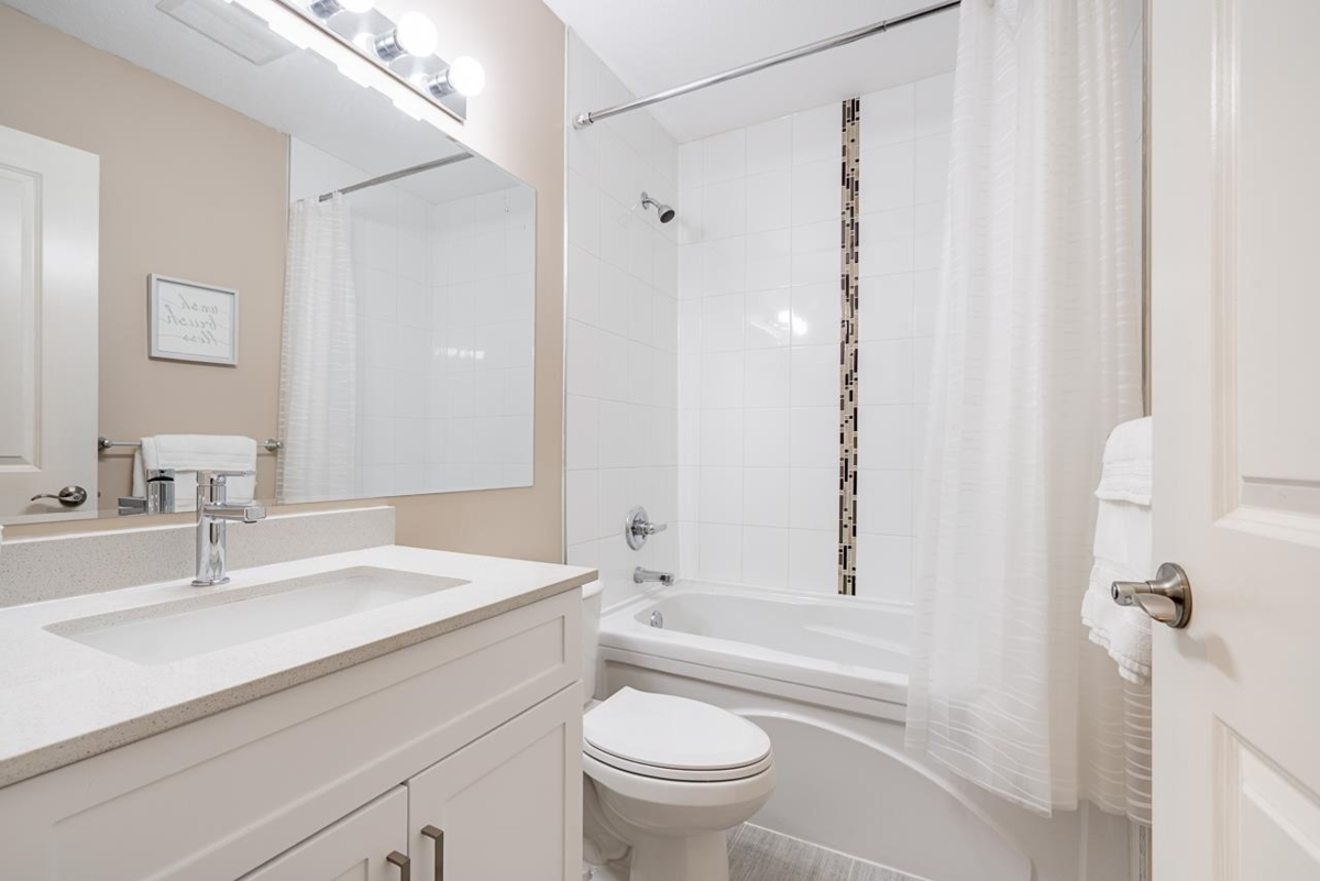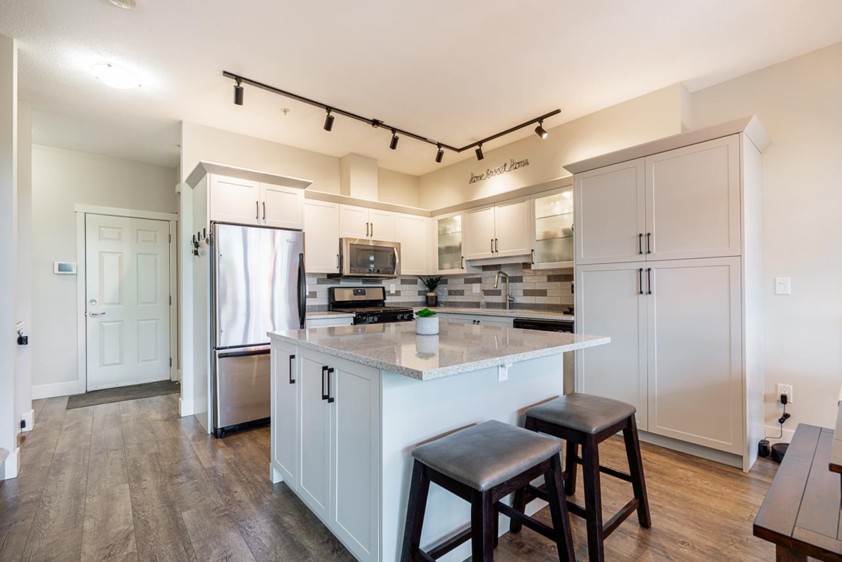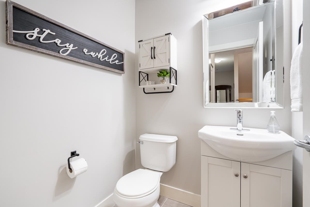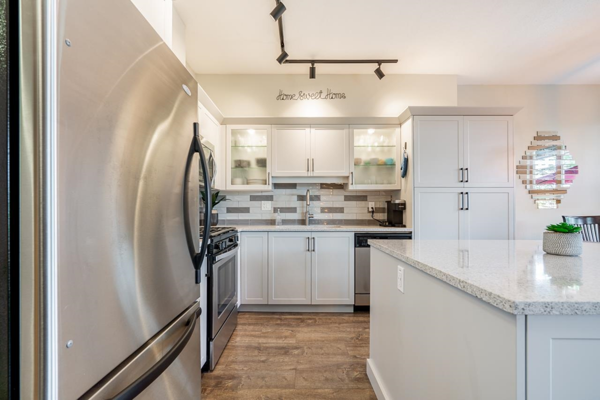 Welcome to Sunpointe! This bright & beautifully maintained townhome offers the feel of a detached home w/open-concept living & no stairs at entry - walk right into the main floor. The living & dining area seamlessly flows out to a private covered balcony, perfect for relaxing or entertaining. The spacious kitchen is built for gathering, featuring granite countertops, a gas range, stainless steel appliances, & a large island. Upstairs, a massive primary suite features its own balcony, walk-in closet, & a spa-inspired 5-piece en-suite w/double sinks, a soaker tub, & a shower, plus 2 generously sized bdrms. Downstairs includes a rec rm, bdrm, full bath, direct access to a lower patio, & great storage throughout - ideal for guests or teens. Close to parks, schools, & shopping.