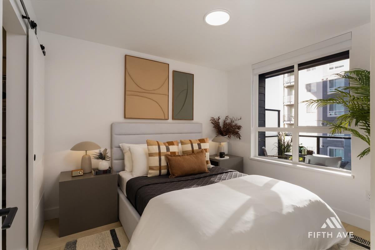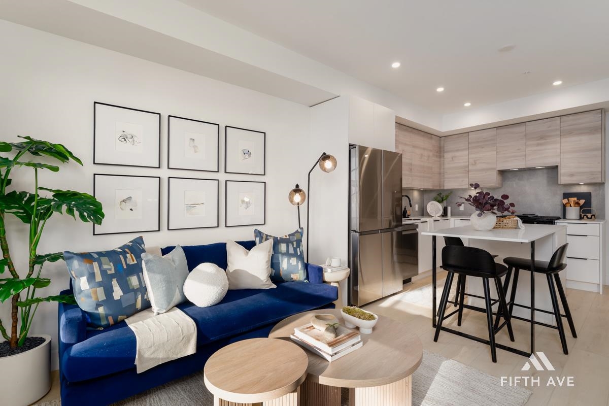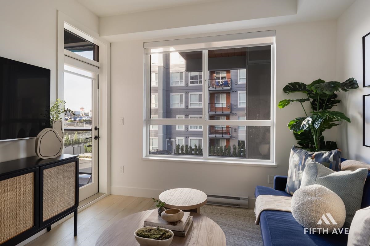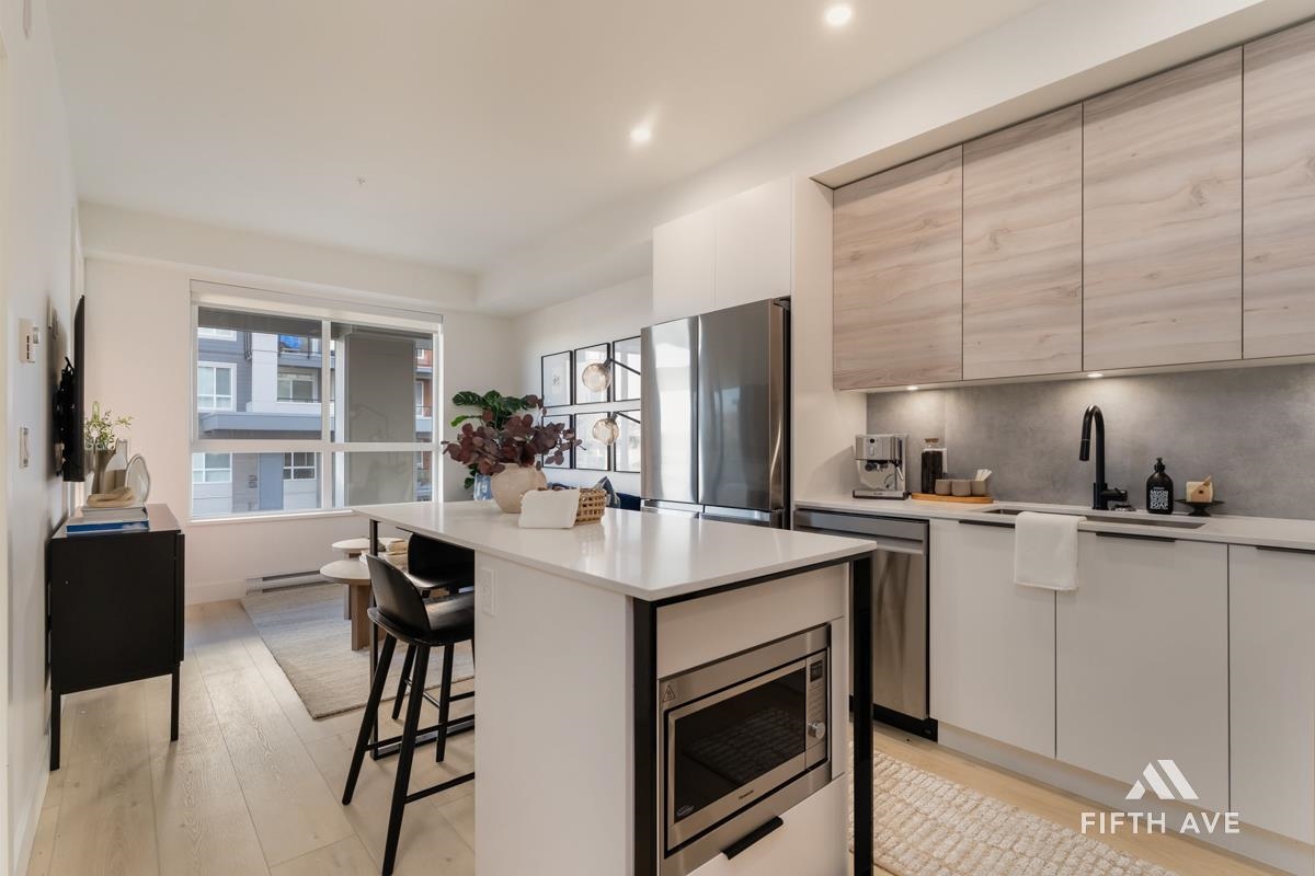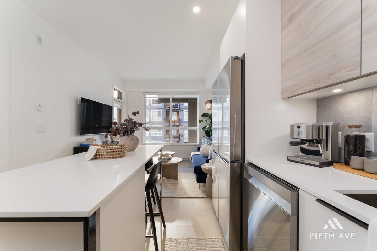 Move in ready at Highstreet Village - Abbotsford's best-selling community. This 1-bed 1-bath home features a modern kitchen, quartz countertops, two-tone cabinetry, stainless steel appliances, including an upgraded smart fridge and gas range. The spa-inspired bathroom includes a frameless glass shower and contemporary finishes. Large covered sundeck. Centrally located next to Highstreet Shopping Centre, Hwy 1, and Abbotsford Airport, all levels of schools and more. 1 parking and 1 storage space included!