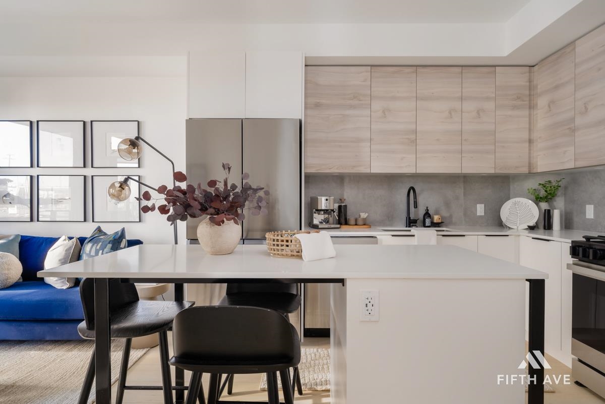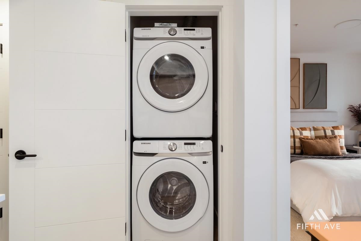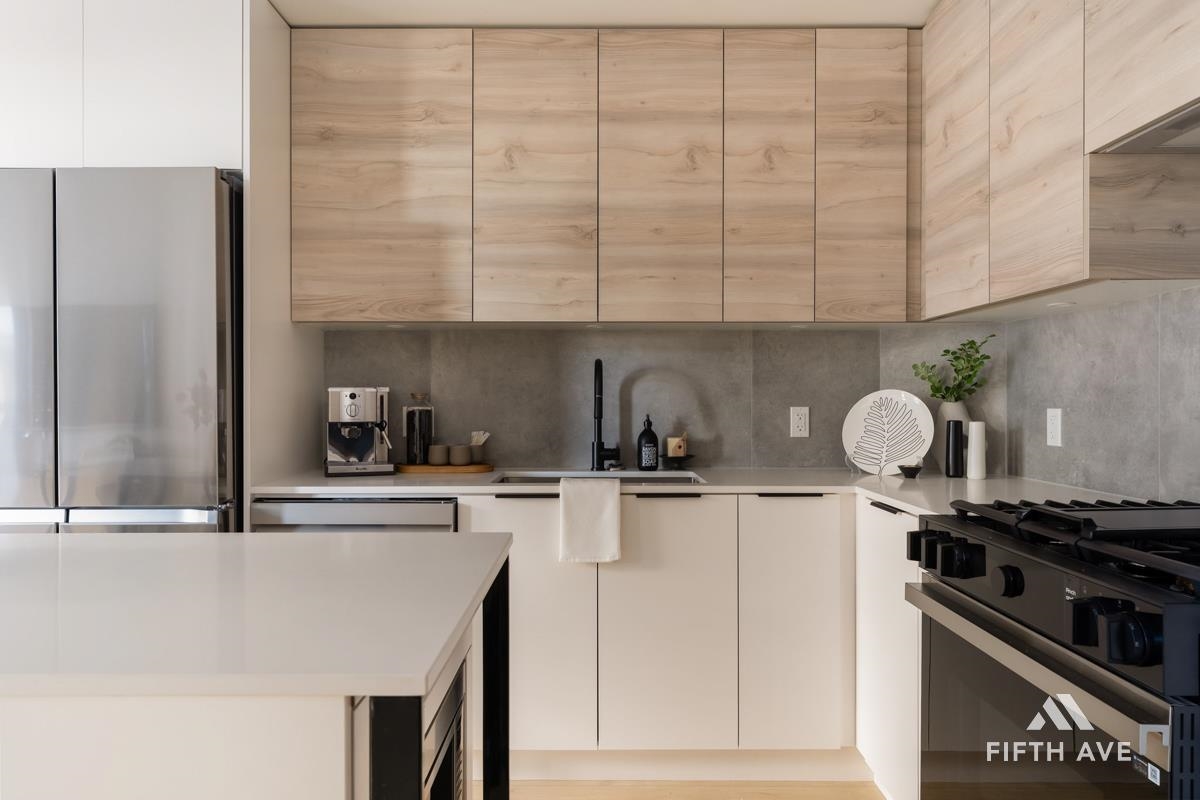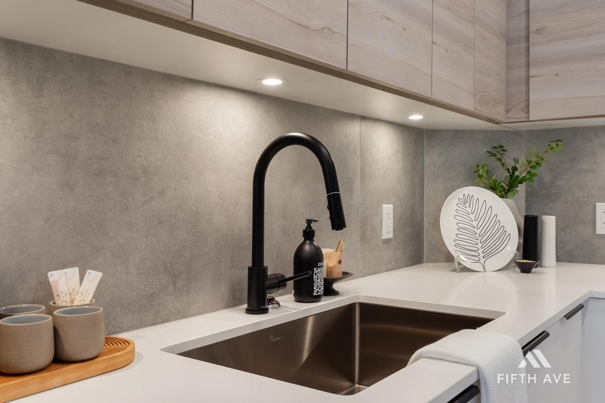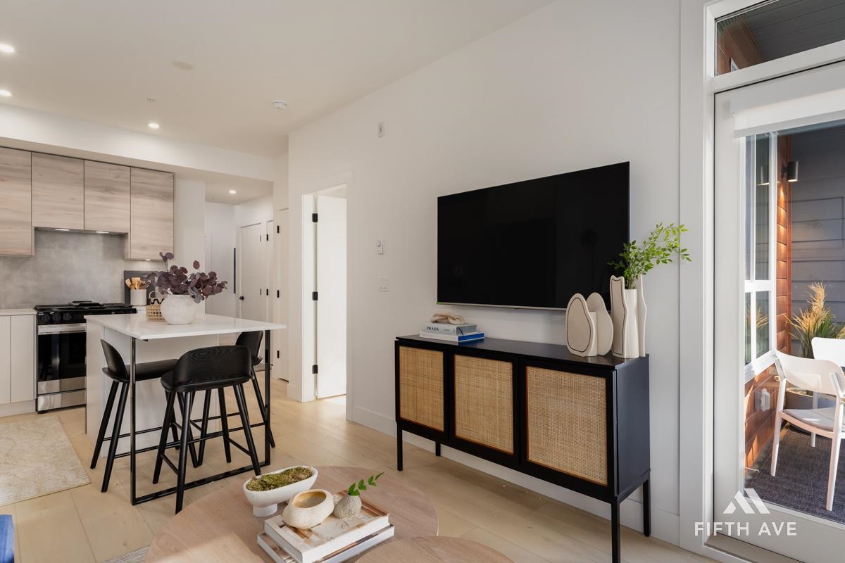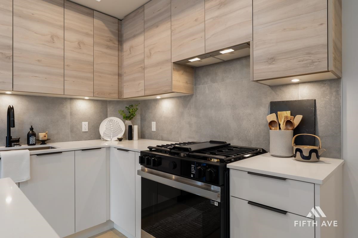 Move in ready at Highstreet Village - Abbotsford's best-selling community. This 1-bed 1-bath home features a modern kitchen, quartz countertops, two-tone cabinetry, stainless steel appliances, including an upgraded smart fridge and gas range. The spa-inspired bathroom includes a frameless glass shower and contemporary finishes. Large covered sundeck. Centrally located next to Highstreet Shopping Centre, Hwy 1, and Abbotsford Airport, all levels of schools and more. 1 parking and 1 storage space included!