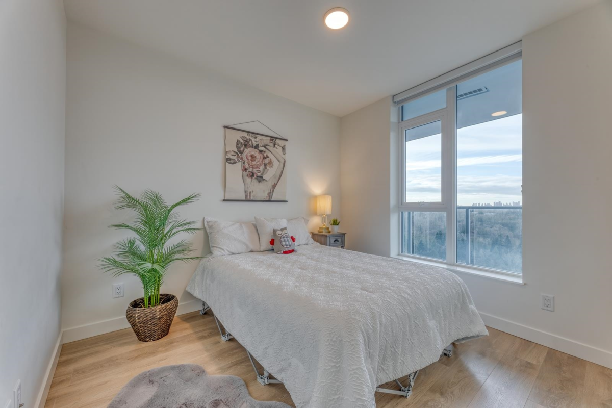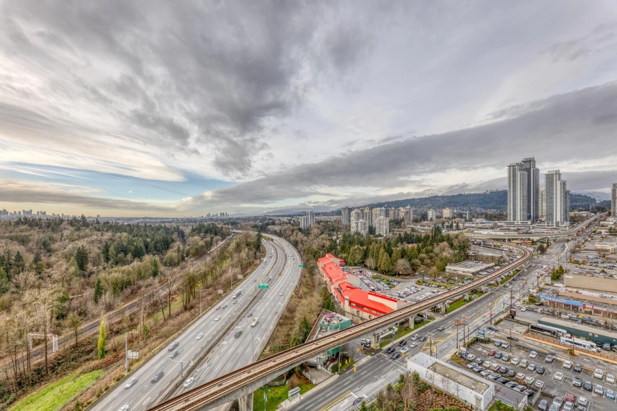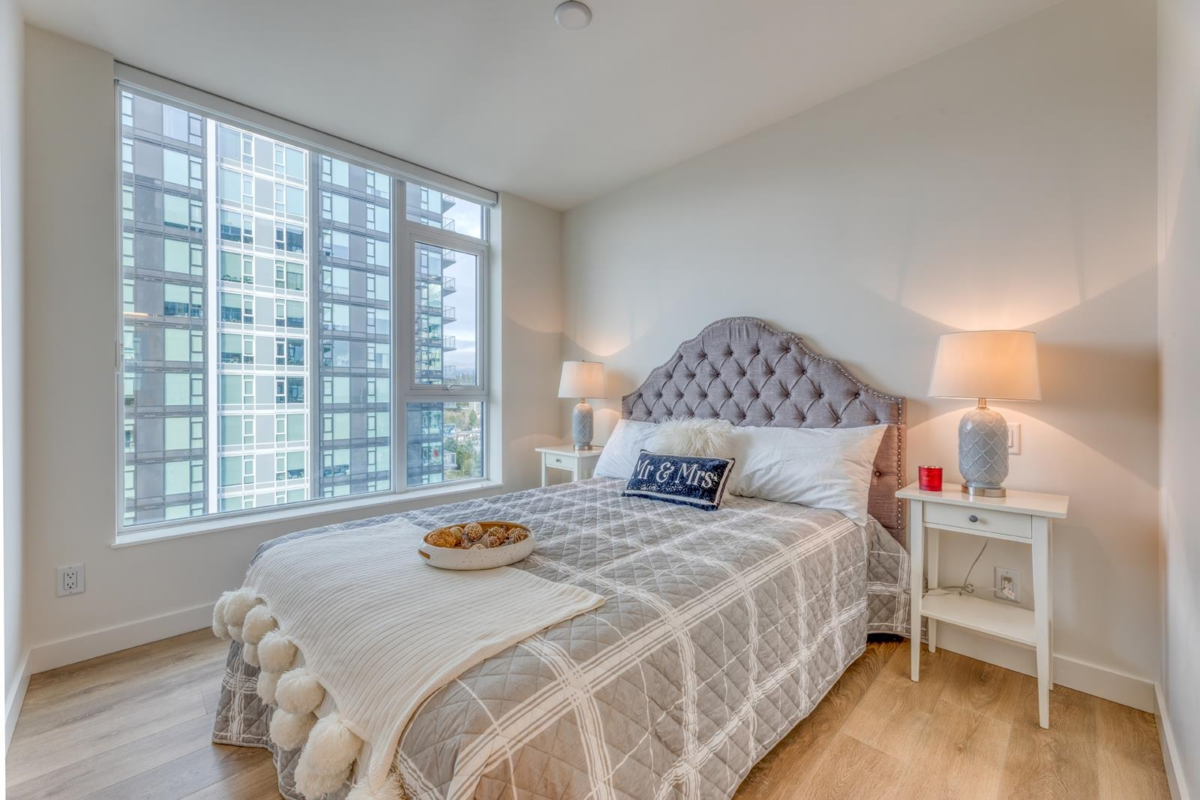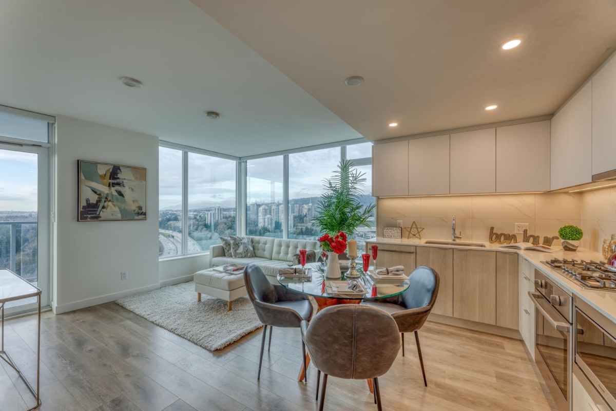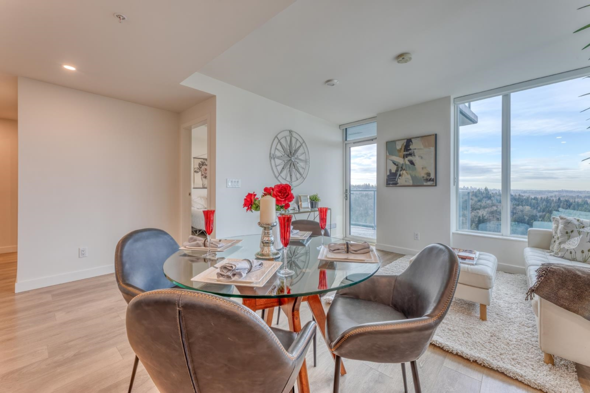 Beautiful 2 bed 2 bath 824SF NW CORNER home at SOCO by Anthem! Spacious L-Shaped Kitchen features integrated 30" Bosch and Fisher Paykel Appliances, Quartz Countertops. Bright living room with SWEEPING city and mountain view. Primary bedroom with walk-in closet and Ensuite. Good-sized 2nd bedroom and guest bathroom. Laminate flooring throughout, Air-conditioned. Spacious West facing balcony to enjoy beautiful Sunset. Comes with 1 EV ready parking and 1 locker. 43,000SF indoor and outdoor amenities includes Gym, Lounge, playground, Sports Court, BBQ area etc. Walking distance to Lougheed town centre, skytrain, H mart, restaurants and coffee shops and more. Like New and ready to move in! OPEN HOUSE SUNDAY FEB 1 2-4PM