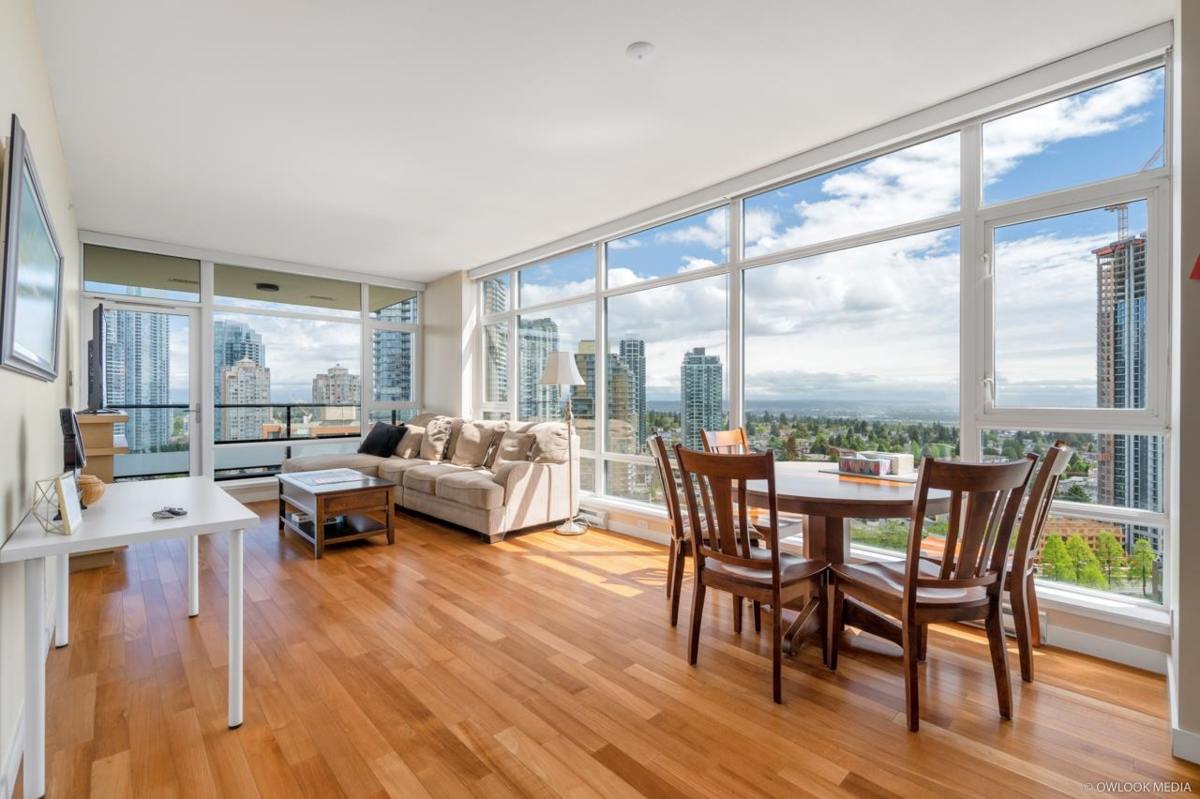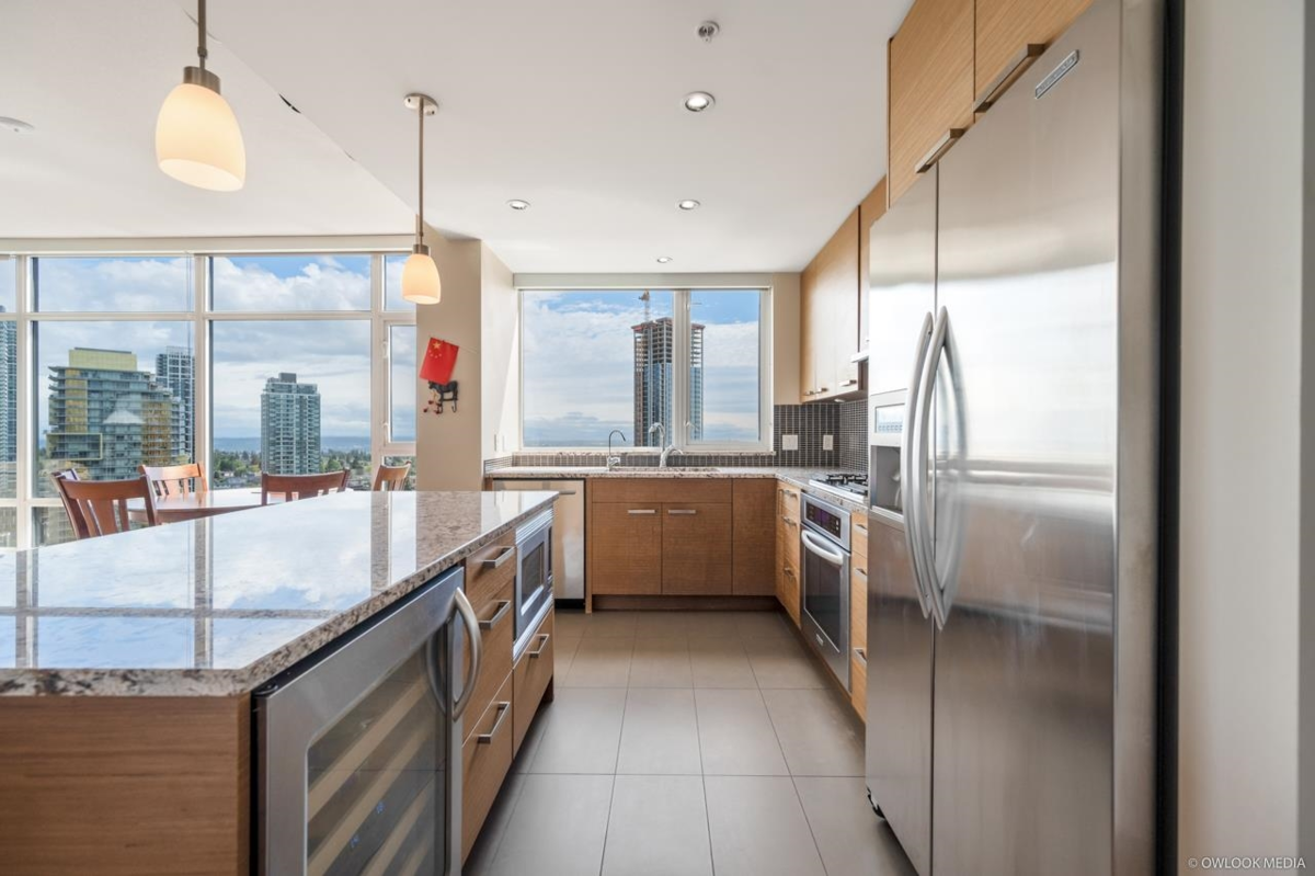 Prestigious JEWEL 1 at Metrotown by award-winning Boffo. Seize this rare opportunity to own a highly coveted SE CORNER unit. This spacious upper unit boasts 1,255 sq ft with two bedrooms plus a den, which can be converted into a 3rd bedroom. With only five units per floor, it offers a functional floor plan featuring split bedrooms and two baths, 9' high ceilings, engineered hardwood flooring, quartz countertops, a gas stove, wine cooler, stainless steel appliances, and a 176 sqft balcony. Amenities include a concierge, fitness center, hot tub, steam room, lounge, and meeting room. Just minutes from Skytrain, Crystal Mall, Metrotown Shopping Centre, library, and Central Park.