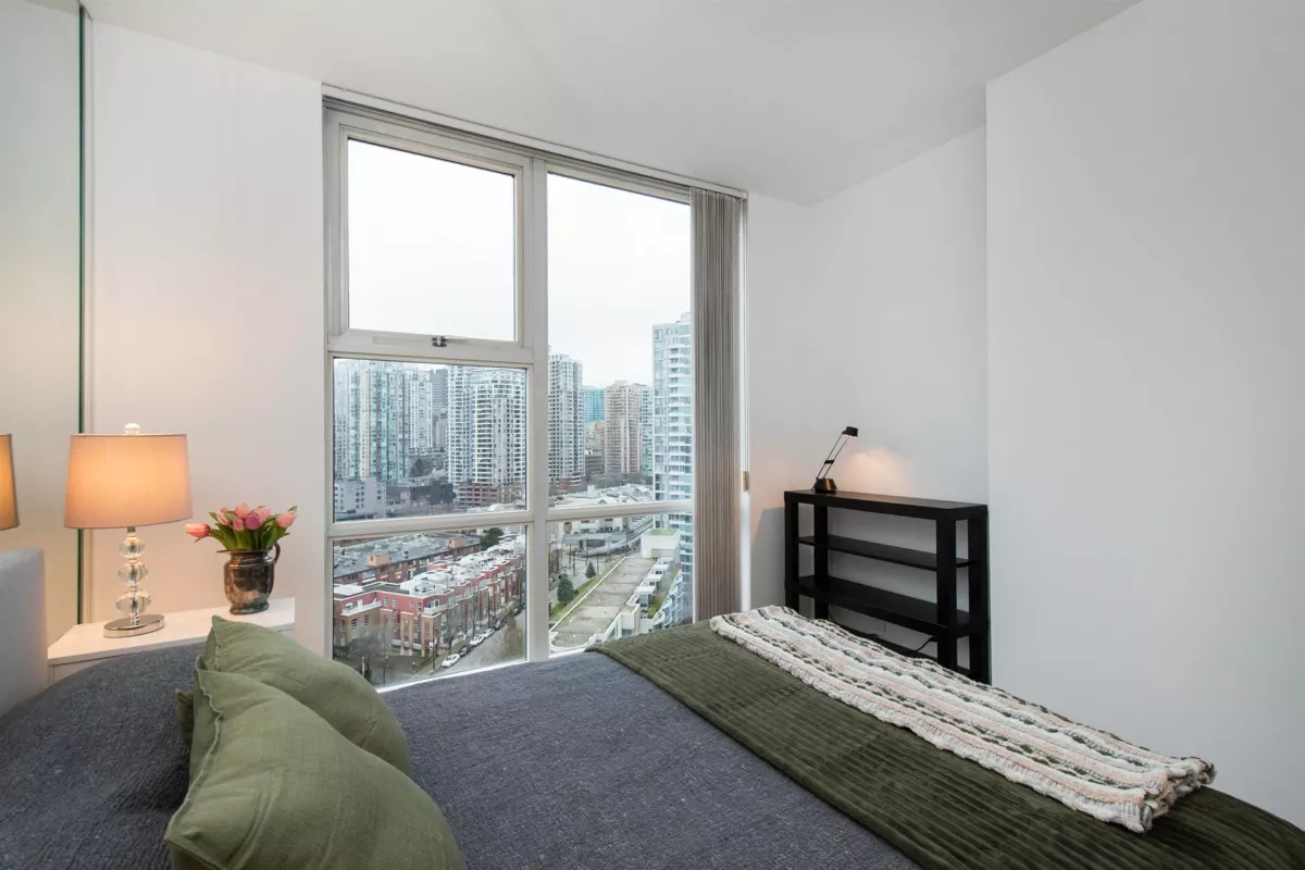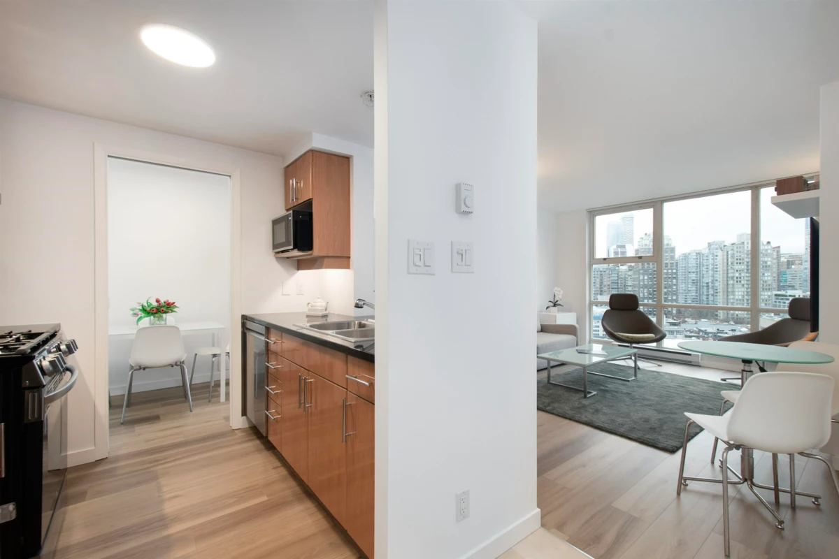 FULLY RENOVATED & well designed features brand new wide plank flooring, new backsplash, fresh paint, lighting, & spacious bathroom with brand new tiles & vanity, all appliances 3 yrs! STUNNING, PRIVATE VIEWS over Heritage Yaletown with exceptional distance and no direct sightlines back into your home! Wake up every morning to a beautiful City & Mountain view that fills the suite with light & inspiration for the day! Smart layout offers a den, office, or eating area, floor to ceiling windows & full size closets. LEVEL 2 EV in PKG SPOT. Set in an unbeatable Marinaside Resort location surrounded by the Seawall, marina, waterfront parks, & Yaletown’s vibrant dining & entertainment scene. FULL Amenities. This is your moment to relish in a rare combination of privacy, view, and lifestyle!