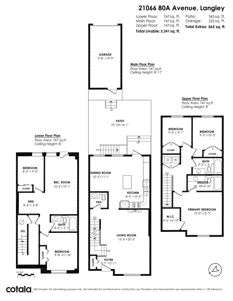 Welcome to this charming 5 bed, 4 bath row home in desirable Willoughby Heights. Offering 2,241 sq. ft. of thoughtfully designed living space, the main floor features an open layout with 8'11 ceilings, a bright living and dining area, modern kitchen, and convenient powder room. Upstairs you’ll find 3 spacious bedrooms including a primary retreat with walk-in closet and ensuite, plus a full bathroom. The lower level offers 2 additional bedrooms, a rec room, separate entrance, and easy suite potential. Enjoy outdoor living on the large patio and the convenience of a detached garage. Ideally located, this home is walking distance to Lynn Fripps Elementary and Willoughby Town Centre, with parks, shopping, and amenities nearby—perfect for families or investors alike. BONUS: NO STRATA FEES!