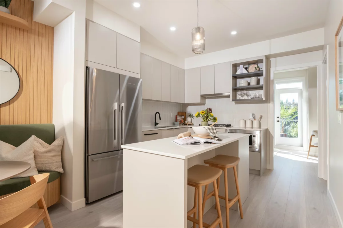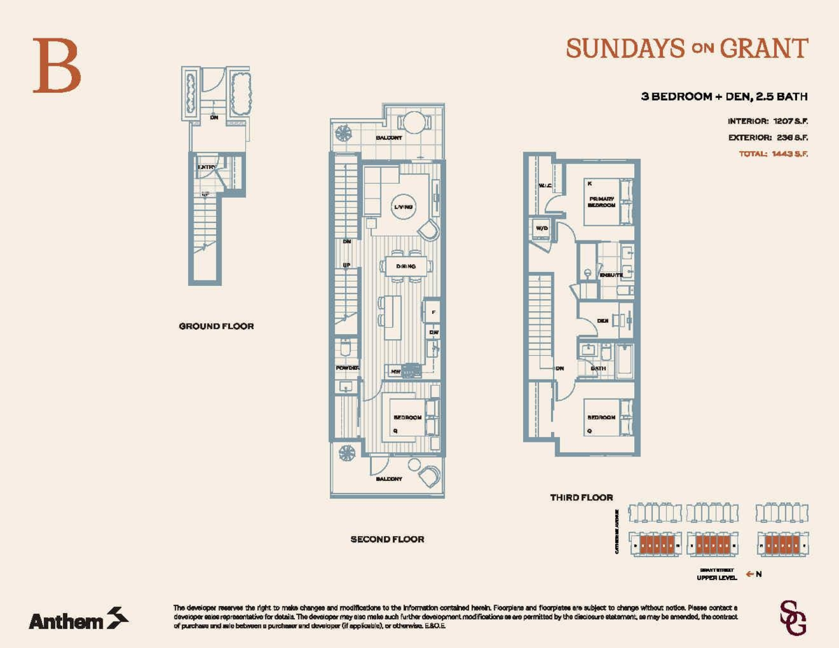Welcome home to Sundays on Grant by Anthem, a modern community in a quiet, family-friendly pocket of West Coquitlam just 5 minutes from Burquitlam SkyTrain, shops, restaurants, and the YMCA. Located a short walk from Miller Park Elementary, Banting Middle School and the trails at Chines Park. This efficient 1,207 sf 3-bedroom + den townhome features a highly functional layout with a main-level bedroom with private balcony, convenient powder room, open-concept living and dining area, contemporary kitchen with high-end appliances flowing to a second private balcony. The upper level offers a primary bedroom with a walk-in closet and double-vanity ensuite, plus a second bedroom, full bath and flexible den perfect for a home office or playroom. Open by private appointment.
