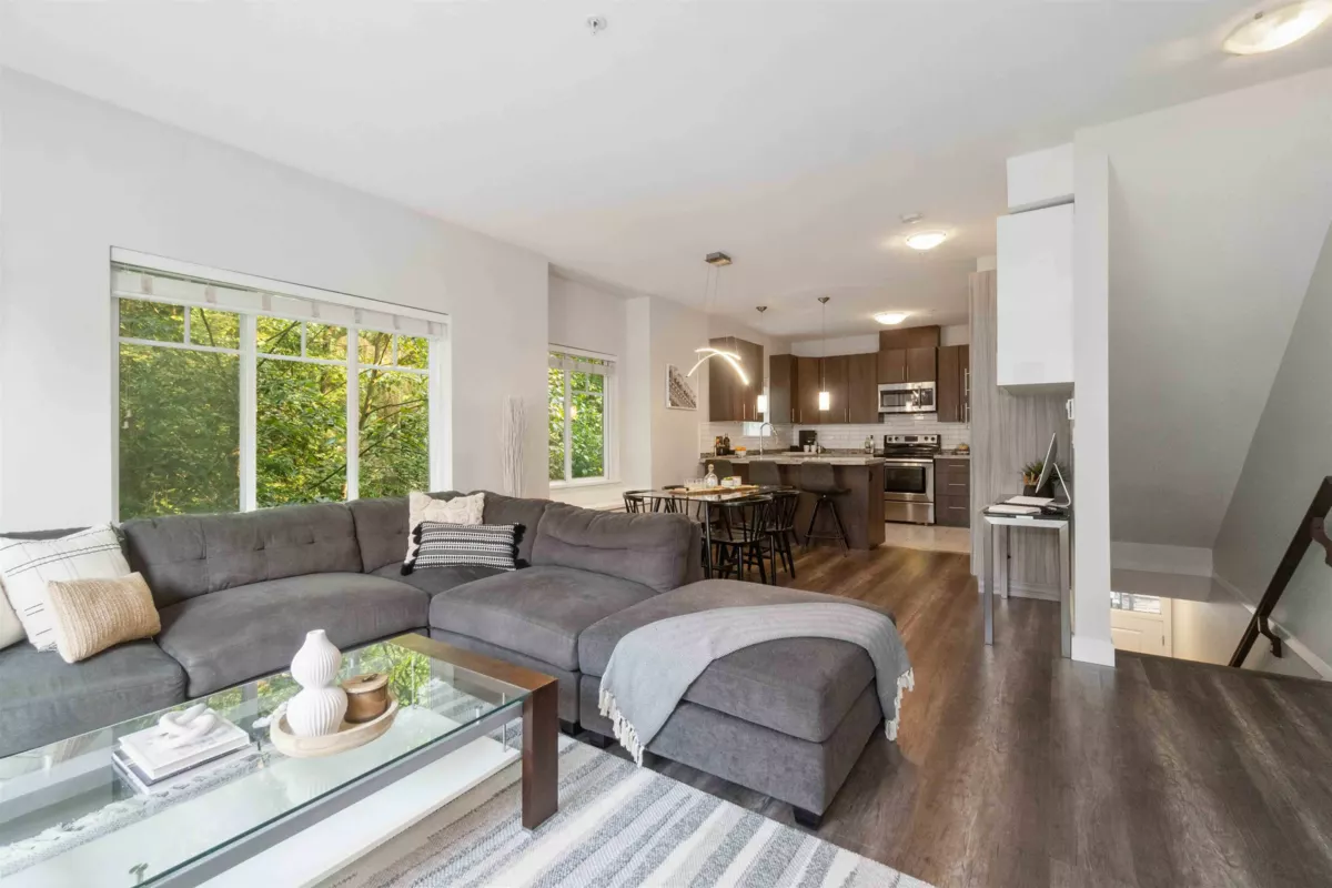 This is the ONE! Fabulous 2 bed/2 bath END UNIT townhome overlooking lush green space. Enjoy blooming dogwoods, magnolias & cherry blossoms on a peaceful cul-de-sac backing onto Broadview Park with its trails, playground & tennis courts. Centrally located just 25 min from most of the Lower Mainland! Spacious rooms easily fit house-sized furniture. Gleaming granite counters & stainless steel appliances elevate the kitchen. New floors & fresh paint make it move-in ready. Abundant natural light floods the home. Built-in office nook perfect for WFH. Pro closet organizers offer ample storage. Bonus: TWO parking & large locker included! Must See!
