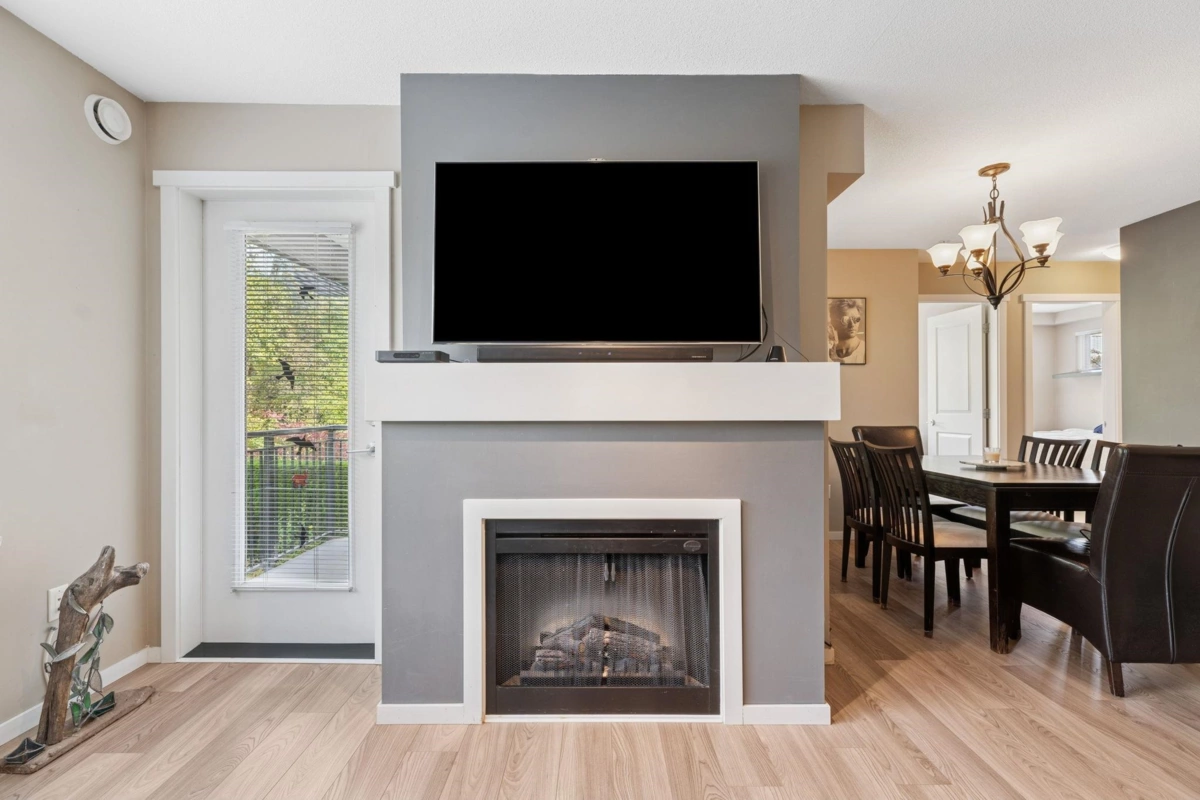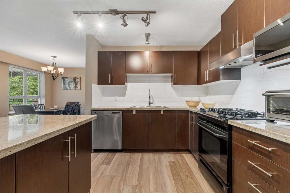 Boardwalk at Klahanie! Spacious 3 bed, 2 bath home overlooking a quiet greenbelt with a tranquil brook. Gourmet kitchen features granite counters, island with breakfast bar, plenty of cabinetry & stainless sink with garburator. Bright living room offers an electric fireplace, picture window & French doors to a covered deck—ideal for year-round BBQs. Deluxe primary suite with 2 closets & spa-like ensuite with double sinks, soaker tub & separate shower. Brand new waterproof vinyl plank floors! Strata has approves this unit for AC. Includes 2 parking stalls. Perfect location near shops, coffee, Rocky Point & Inlet Trail, Restaurants, brewery row, with easy access to Old Orchard Park, White Pine Beach, Buntzen Lake & Belcarra.