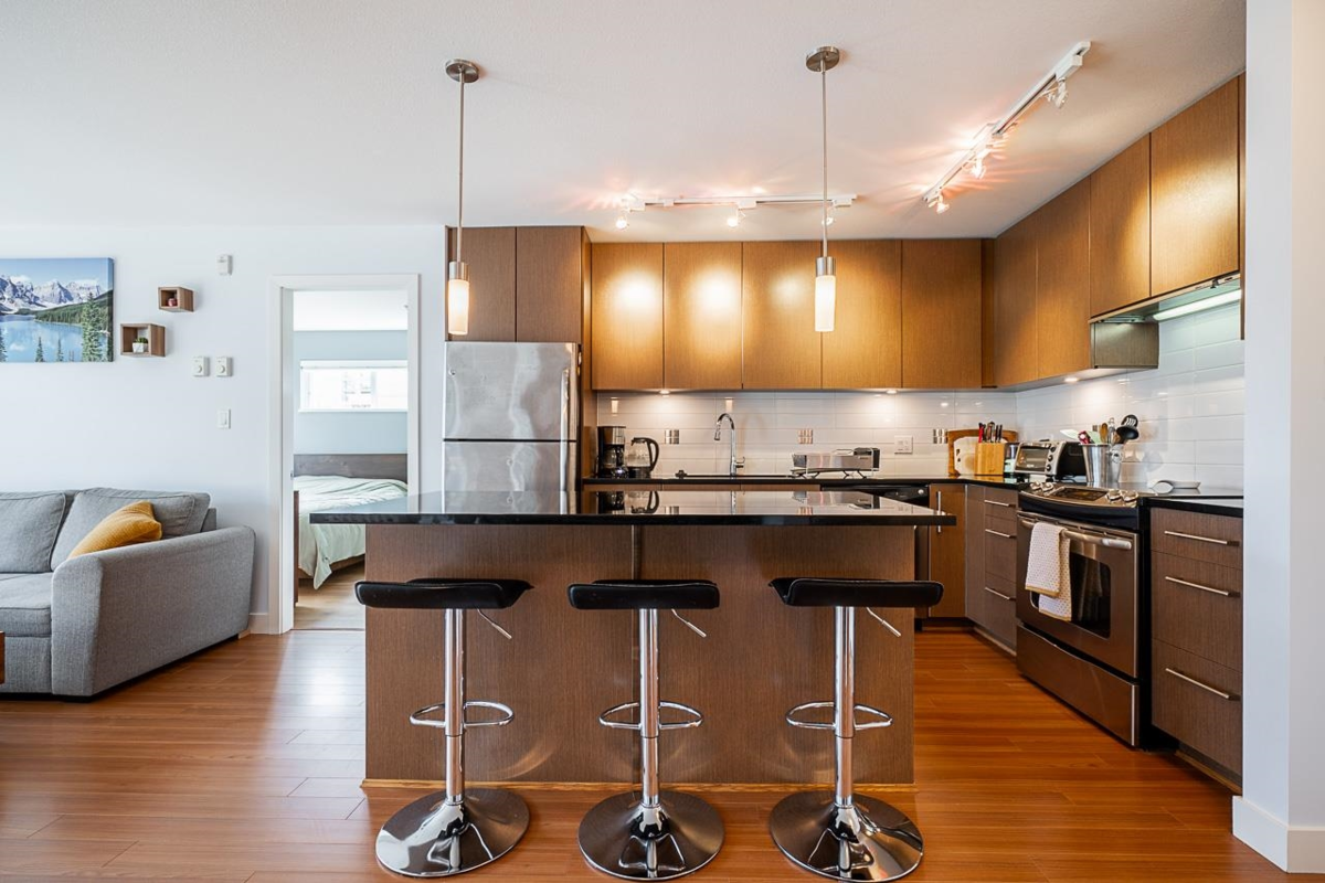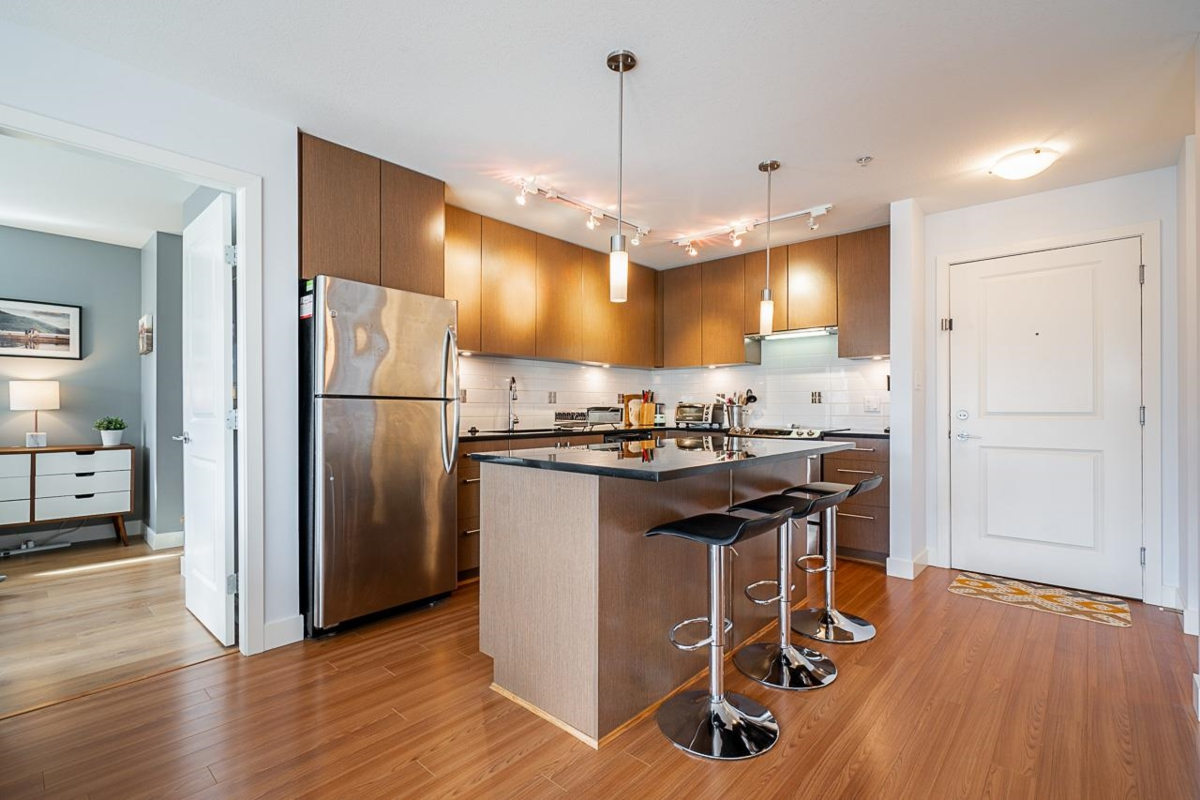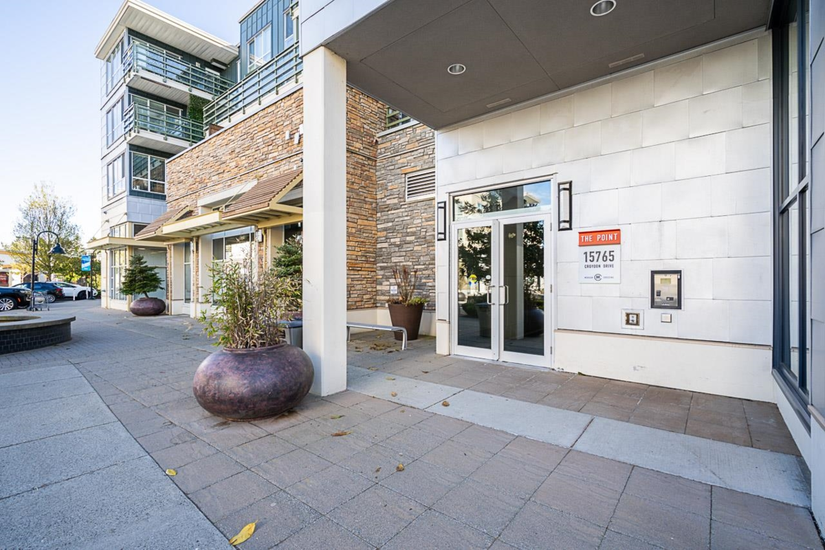 Corner unit condo at The Point. The heart of the Morgan Crossing area this bright and airy 2 bedroom apartment offers super sunny unobstructed south facing views overlooking a green roof. Almost 1,000sqft of open concept living space with picture windows and wall to wall laminate flooring. Modern kitchen with large island, sleek stainless appliances and fixtures and quartz countertops. Living area opens onto a 241sqft private sundeck perfect for entertaining, kids and pets. 1 parking stall and storage locker. Thrifty foods, shopping and dining all at your doorstep. Minutes to Grandview rec center and South Surrey / White Rock beaches and amenities. Catchment schools, Sunnyside Elementary and Grandview Heights Secondary.