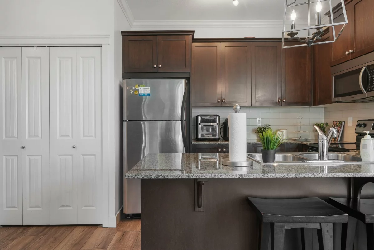 Welcome to the EMACULATE UPDATED CORNER unit. This unit perfectly blends modern living with comfort. Featuring two spacious bedrooms and two well appointed bathrooms, this home is ideal for both relaxation and entertaining. The open-concept layout maximizes natural light, showcasing a stylish kitchen and an inviting living area that flows seamlessly to a private large balcony perfect for you coffee or evening sunset. This unit also comes with 2 LOCKERS! Centrally located as its walking distance to all levels of school, transit and easy hwy access. Book your private viewing today!