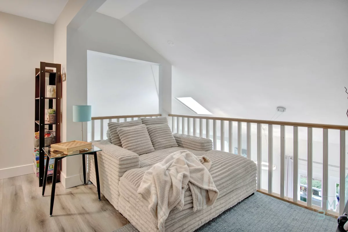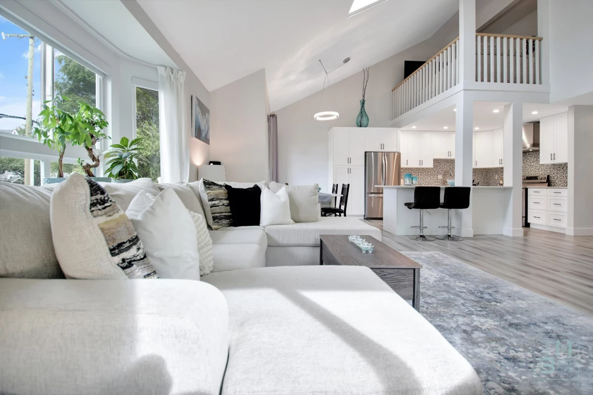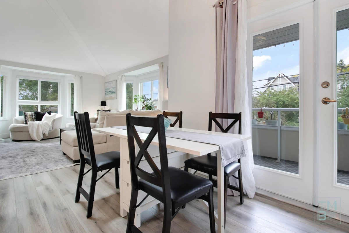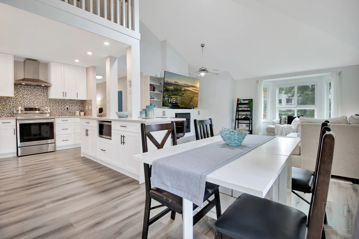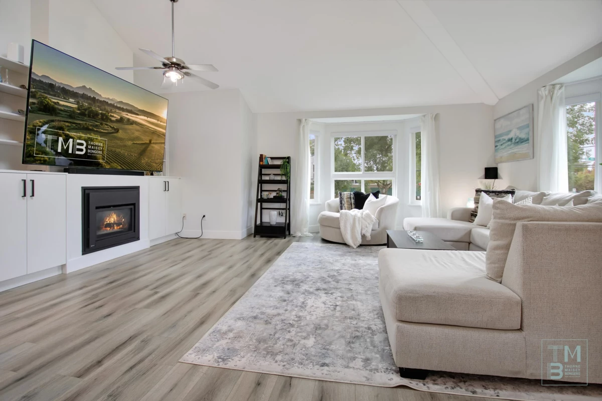 WESTSIDE ESTATES | A rare find—this stunning 2Storey TOP FLOOR CORNER UNIT is the largest in the building, offering 3BDRMS, 2BATHRMS, 2PARKING, 3DECKS + LOFT! South/West facing, filled w/ natural light, it features VAULTED ceilings & an OPEN CONCEPT layout that feels like a home w/out the upkeep. Beautifully updated throughout, enjoy a LRG bright kitchen w/ peninsula, quartz counters, SS appliances, dining & deck access perfect for BBQs. GRAND livingrm showcases 2 BAY windows, GAS fireplace & custom built-ins. MAIN FLR PBDRM includes a DRESSING rm w/ island drawers, PRIVATE deck, STEAM shower ensuite & laundry access. Upstairs offers a 2nd entrance, airy LOFT, & 2 spacious BDRMS; one w/ W.I.C, ENSUITE access & PRIVATE deck. Pets welcome! Steps to mall, amenities, schools & future Skytrain.