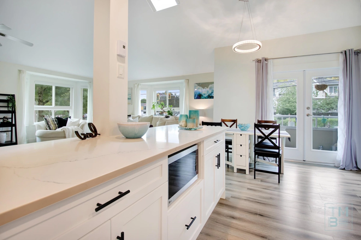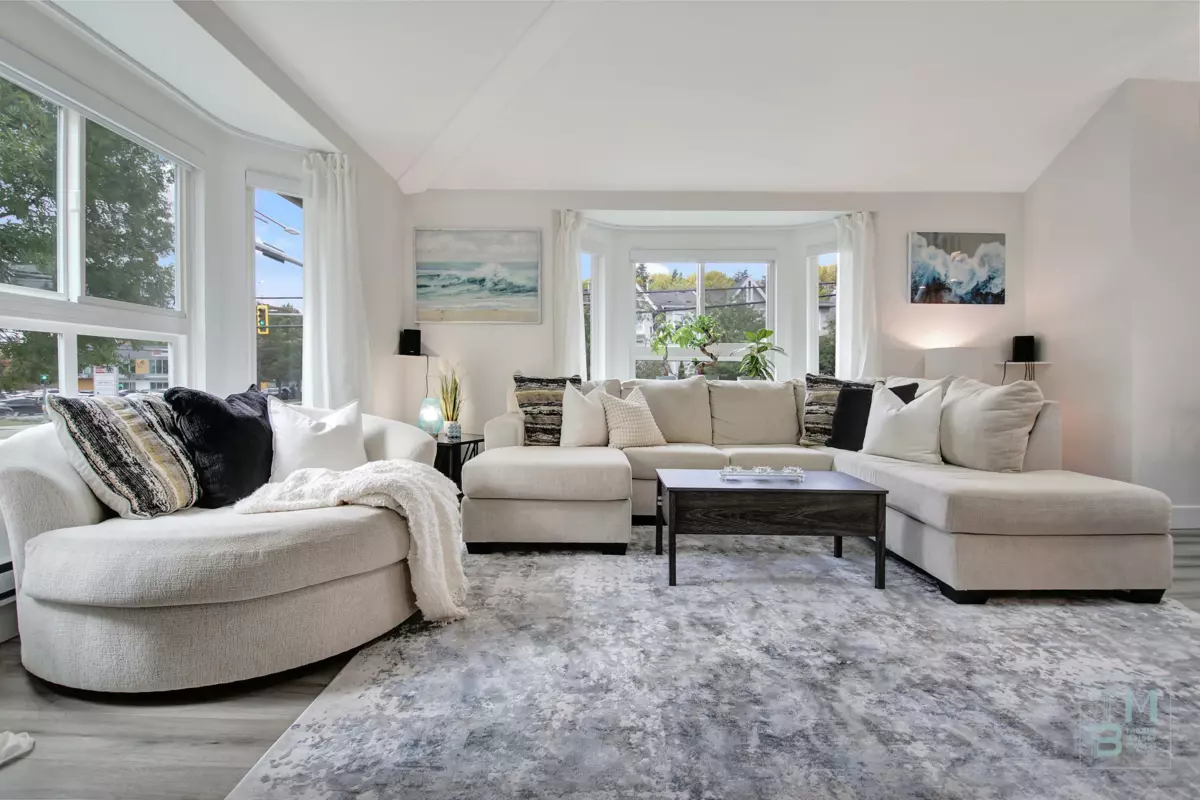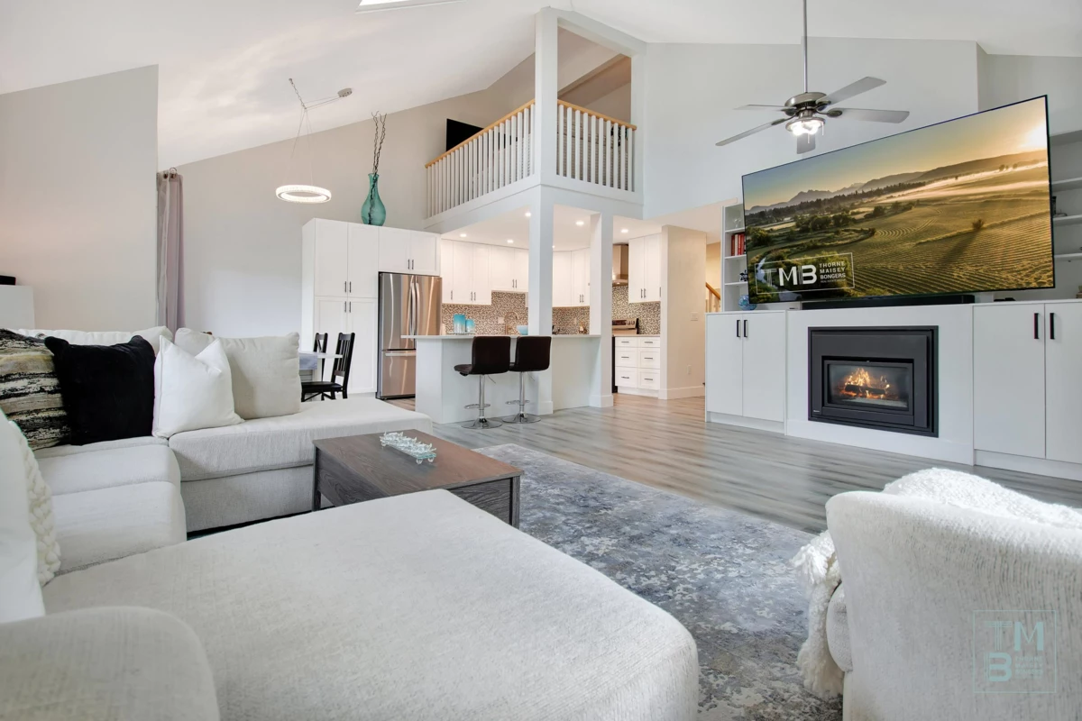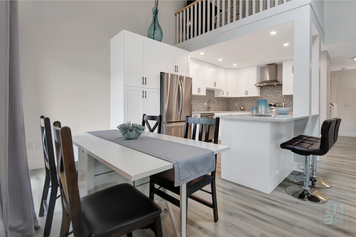 WESTSIDE ESTATES | A rare find—this stunning 2Storey TOP FLOOR CORNER UNIT is the largest in the building, offering 3BDRMS, 2BATHRMS, 2PARKING, 3DECKS + LOFT! South/West facing, filled w/ natural light, it features VAULTED ceilings & an OPEN CONCEPT layout that feels like a home w/out the upkeep. Beautifully updated throughout, enjoy a LRG bright kitchen w/ peninsula, quartz counters, SS appliances, dining & deck access perfect for BBQs. GRAND livingrm showcases 2 BAY windows, GAS fireplace & custom built-ins. MAIN FLR PBDRM includes a DRESSING rm w/ island drawers, PRIVATE deck, STEAM shower ensuite & laundry access. Upstairs offers a 2nd entrance, airy LOFT, & 2 spacious BDRMS; one w/ W.I.C, ENSUITE access & PRIVATE deck. Pets welcome! Steps to mall, amenities, schools & future Skytrain.