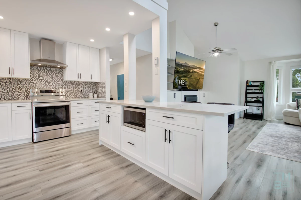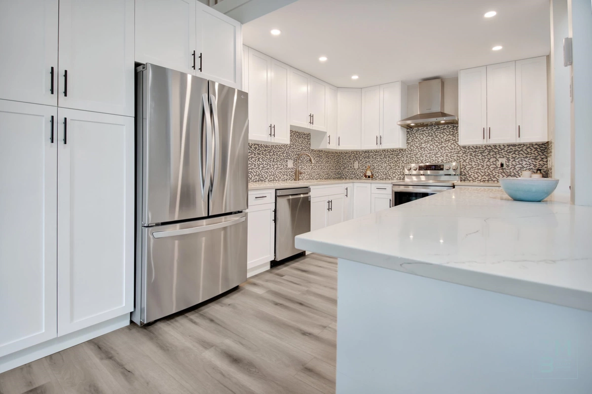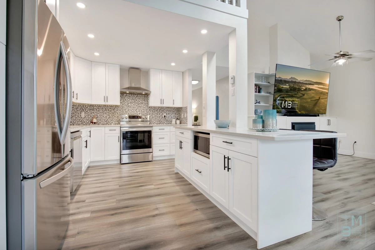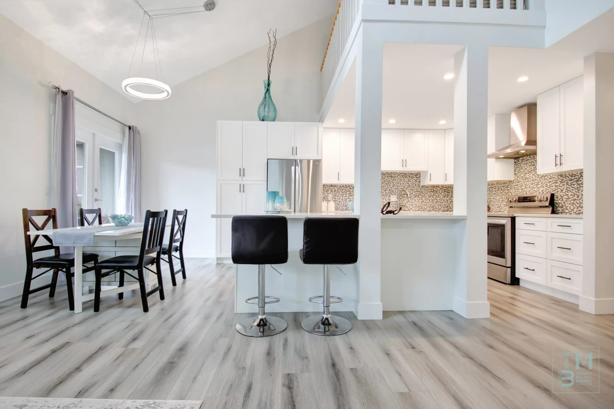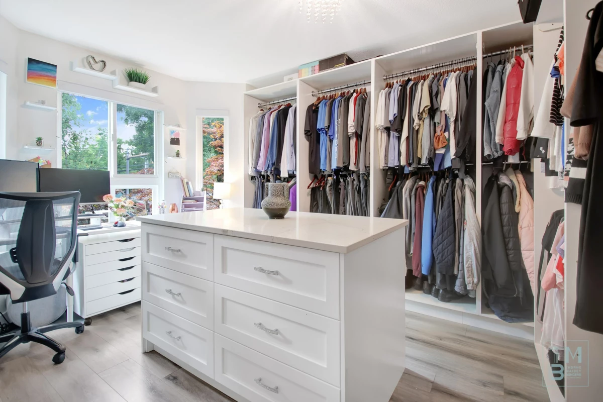 WESTSIDE ESTATES | A rare find—this stunning 2Storey TOP FLOOR CORNER UNIT is the largest in the building, offering 3BDRMS, 2BATHRMS, 2PARKING, 3DECKS + LOFT! South/West facing, filled w/ natural light, it features VAULTED ceilings & an OPEN CONCEPT layout that feels like a home w/out the upkeep. Beautifully updated throughout, enjoy a LRG bright kitchen w/ peninsula, quartz counters, SS appliances, dining & deck access perfect for BBQs. GRAND livingrm showcases 2 BAY windows, GAS fireplace & custom built-ins. MAIN FLR PBDRM includes a DRESSING rm w/ island drawers, PRIVATE deck, STEAM shower ensuite & laundry access. Upstairs offers a 2nd entrance, airy LOFT, & 2 spacious BDRMS; one w/ W.I.C, ENSUITE access & PRIVATE deck. Pets welcome! Steps to mall, amenities, schools & future Skytrain.