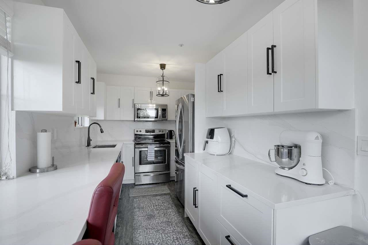Renovated Unit with Stunning Views!Discover this beautiful and bright 2-bedroom, 2-bath corner unit located on the quiet side of the building.Recent Renovations: Enjoy brand new flooring and fresh paint throughout. Modern Kitchen: The galley kitchen features a long counter, stainless steel appliances, and a door leading to a wrap-around covered balcony, offering gorgeous views of Mt. Baker and the Fraser River. Additional Balcony: Relax on the balcony off the master bedroom, Upgrades: Recent updates include new blinds, a range hood,refrigerator, kitchen and bedroom flooring, kitchen countertop, oven, screens, 2 side-by-side parking & one storage locker.Prime Location: Just minutes away from everything you need, including Lougheed Mall, Braid SkyTrain station, Hwy #1, Ikea & Superstore.