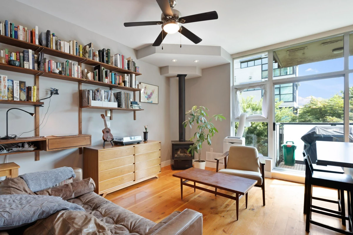 BEST PRICED junior 1-bedroom + den at RETRO in Marpole! Set in a solid concrete building, this beautiful home features soaring ceilings, rich fir floors, and tall windows that fill the space with natural light. Open kitchen shines with newer stainless steel appliances, a handy island breakfast bar, and east facing balcony for morning coffee. Cozy up by the gas fireplace, or unwind in the lush garden courtyard. Enjoy in-suite laundry, a well-equipped fitness center, bike room, parking, and storage. Pet-friendly and rental-ready—ideal for first-time buyers or savvy investors. Just steps away from cafes, shops, parks, and direct transit to YVR, downtown, and UBC! Don’t delay!