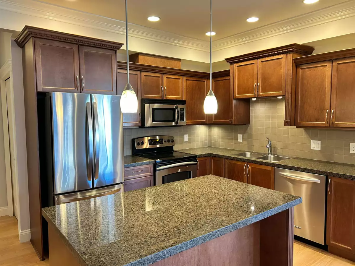 Falcon Manor’s best corner unit. This extra-large 2 bedroom, 2 full bathroom home offers over 1,130 sq ft of bright, open living on the quiet inner courtyard with northwest exposure. Features include 9’ ceilings, stainless steel appliances, granite countertops, and a true kitchen island you can actually use. Enjoy year-round BBQs on the oversized covered balcony. Spacious primary bedroom with walk-in closet and spa-inspired ensuite. Includes 1 secure underground parking stall plus a rare oversized storage locker directly behind the stall (approx. 8’ x 4’ x 8’ high). Only 58 units in this well-run complex. Ready for immediate possession. Walk to Haney Place Mall, Leisure Centre, parks, cafés, and more. Exceptional value for size, layout, and layout, and location.