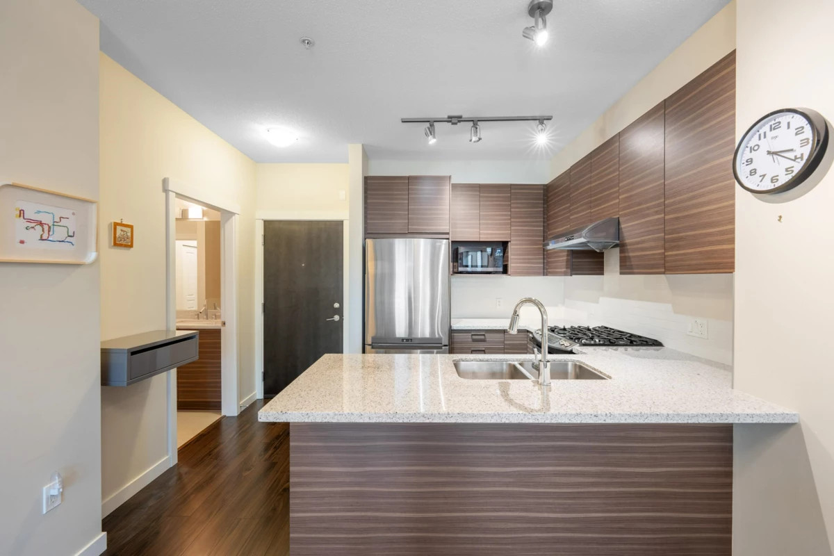 Welcome to Mayfair Place by Polygon! This well-maintained South-facing Jr. 2-bed, 773 sqft home features 9’ ceilings, A/C, an U shape kitchen with s/s appliances. Functional layout with an upgraded washer/dryer, spacious 5-piece ensuite with double sink, and a large walk-in closet. Enjoy over 10,000 SF of resort-style amenities including an outdoor pool, hot tub, gym, guest suites, lounge, theatre and more. Located in the heart of Richmond’s West Cambie area, steps to Walmart, Central at Garden City, restaurants, banks, and shops. School catchments: Tomsett Elementary & MacNeill Secondary. Openhouse: June.14 2:30-4:30pm