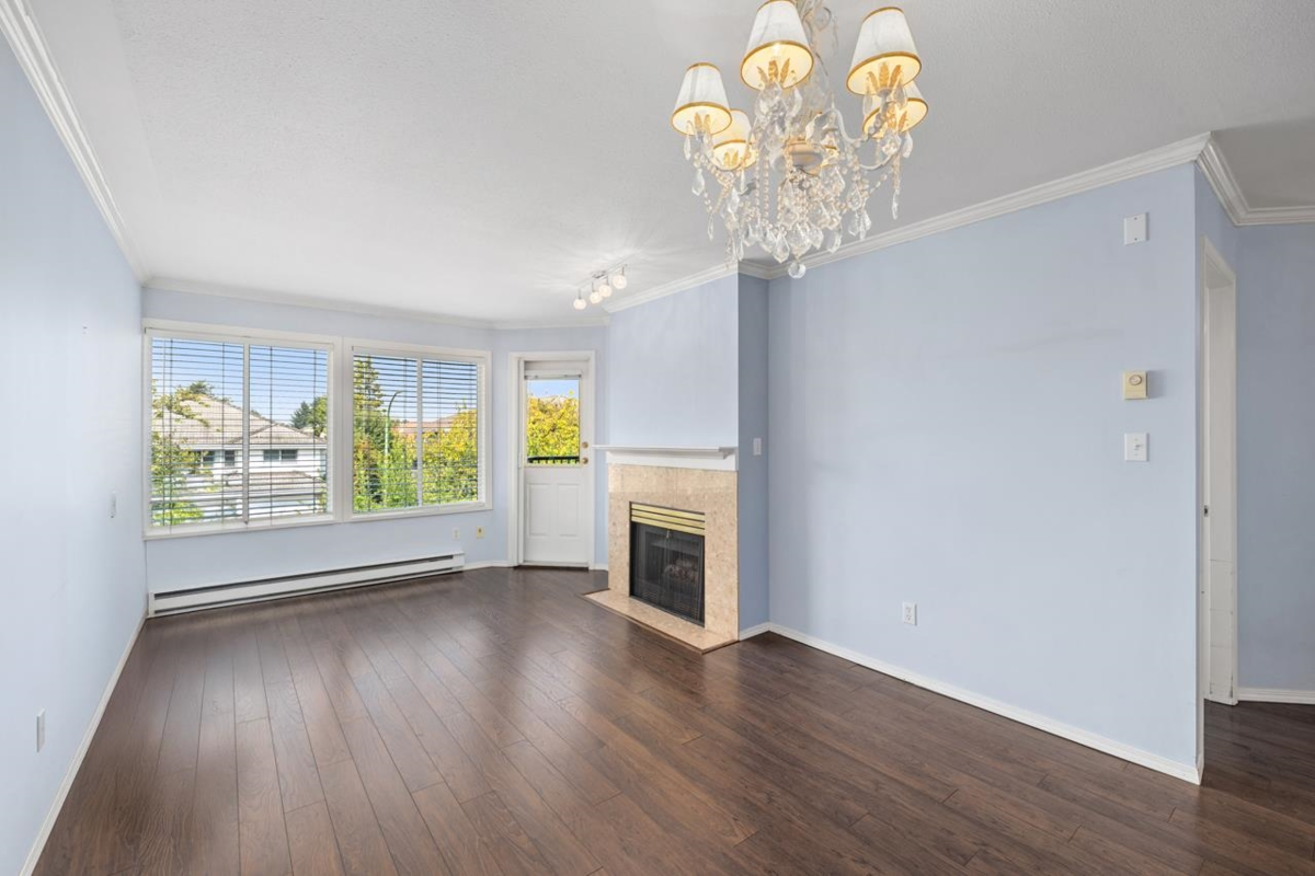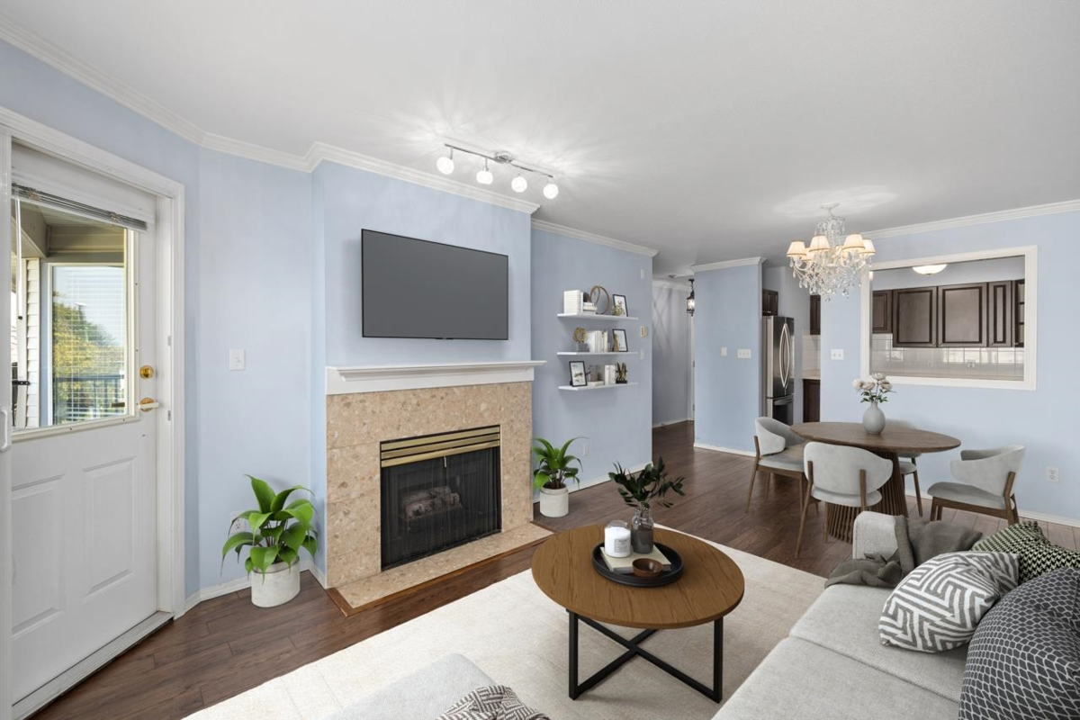 Enjoy a relaxed lifestyle in this bright, adult-oriented top-floor suite designed for easy, low-maintenance living. On the quiet North side of the building, a generous balcony frames mountain and garden views for a peaceful retreat. The comfortable layout inside includes a spacious living & dining area, two bedrooms, a large bathroom with separate tub and shower, in-suite laundry, and a cozy gas fireplace. Tastefully renovated with stone counter tops, sleek stainless appliances, wide slat blinds, and laminate floors. Pet-friendly and well-maintained, the home comes with a parking stall and storage locker, and sits close to transit, the Legion, groceries, and dining. At least one resident must be 55+.