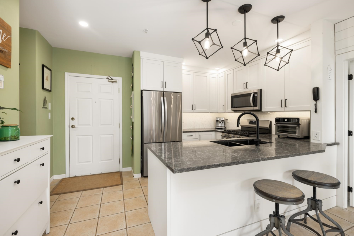 Exciting opportunity at Deerfield by the Sea! This stylishly updated 2 bdrm + glass-walled den, 2 bath home offers 961 sq/ft of bright, air-conditioned living. Enjoy renovated, open kitchen with bar seating, updated baths, gas fireplace, and large windows framing a peaceful, south-facing treed view. Bedrooms are smartly separated for privacy, and the den is perfect as an office, nursery, or guest space. One floor above ground—safe and elevator-free access! Covered balcony ideal for year-round BBQs. Walk to the beach and rec/gym facilities. In-suite laundry, 2 parking, storage locker. Rentals & pets welcome. Leasehold prepaid to 2095. Open SUN Jan 18th 11:00am-1:00pm.