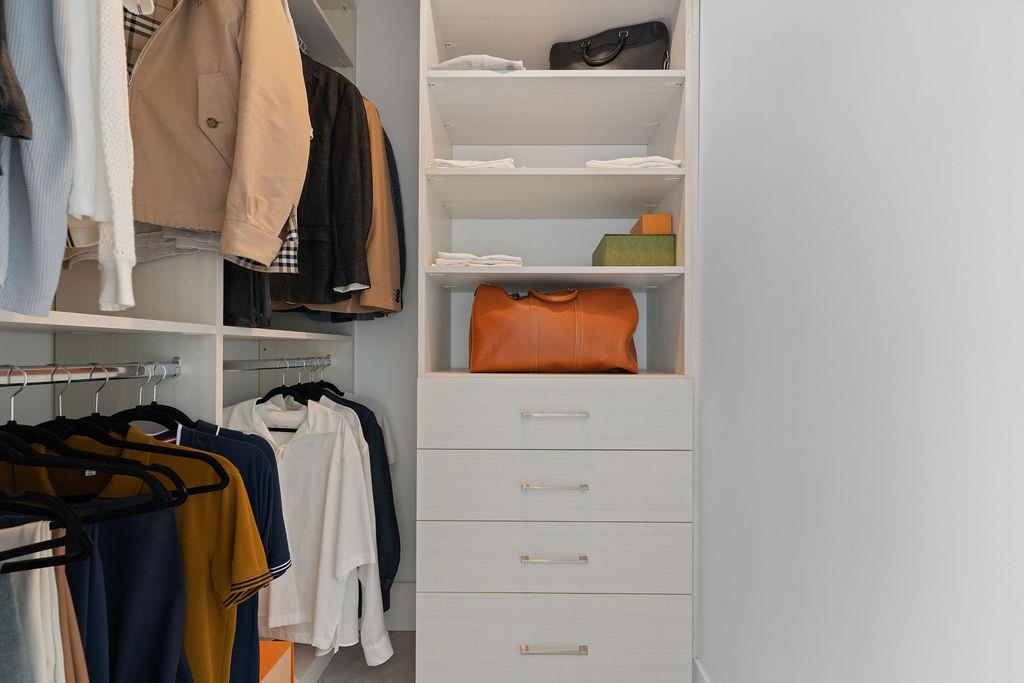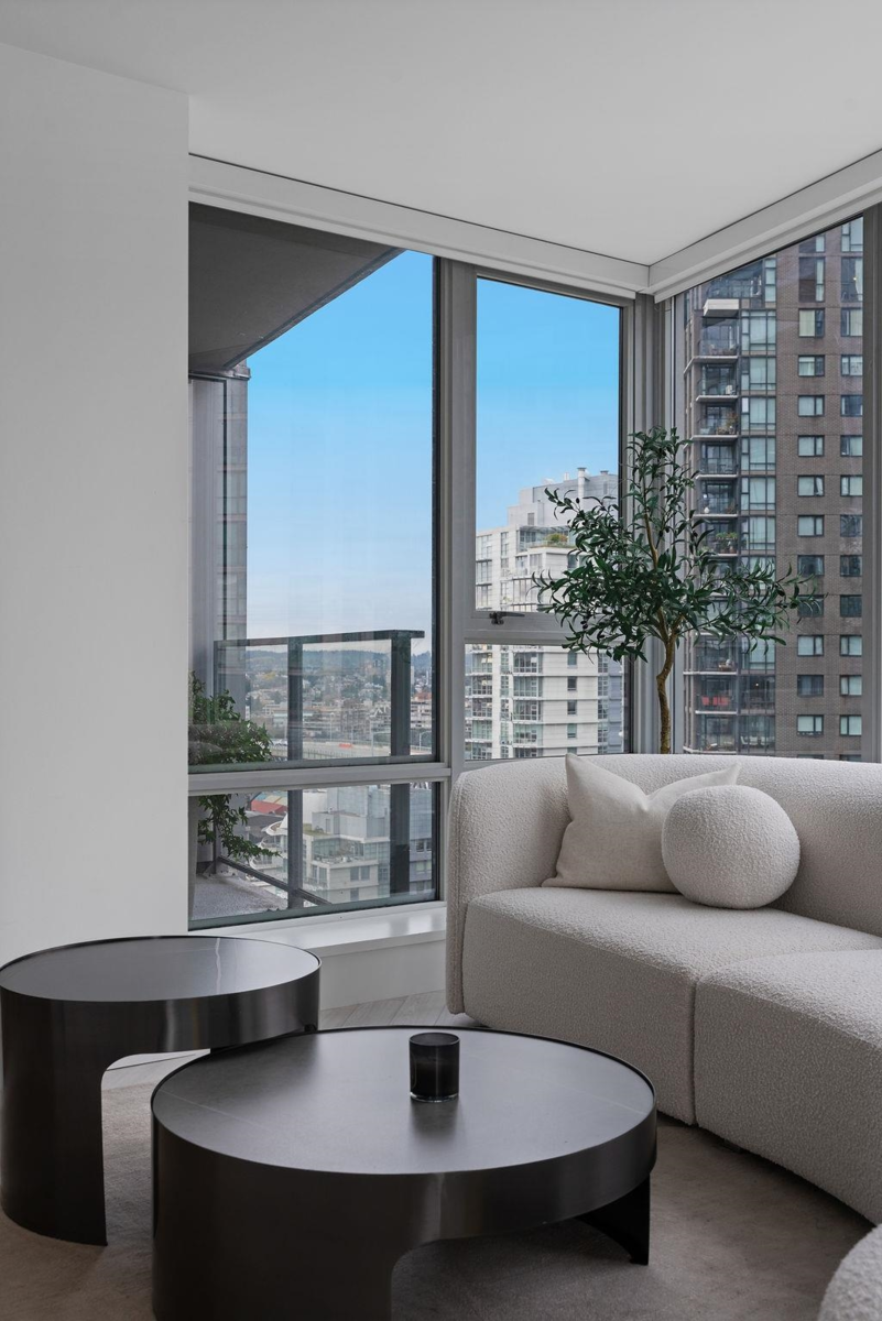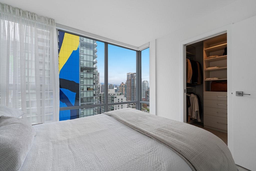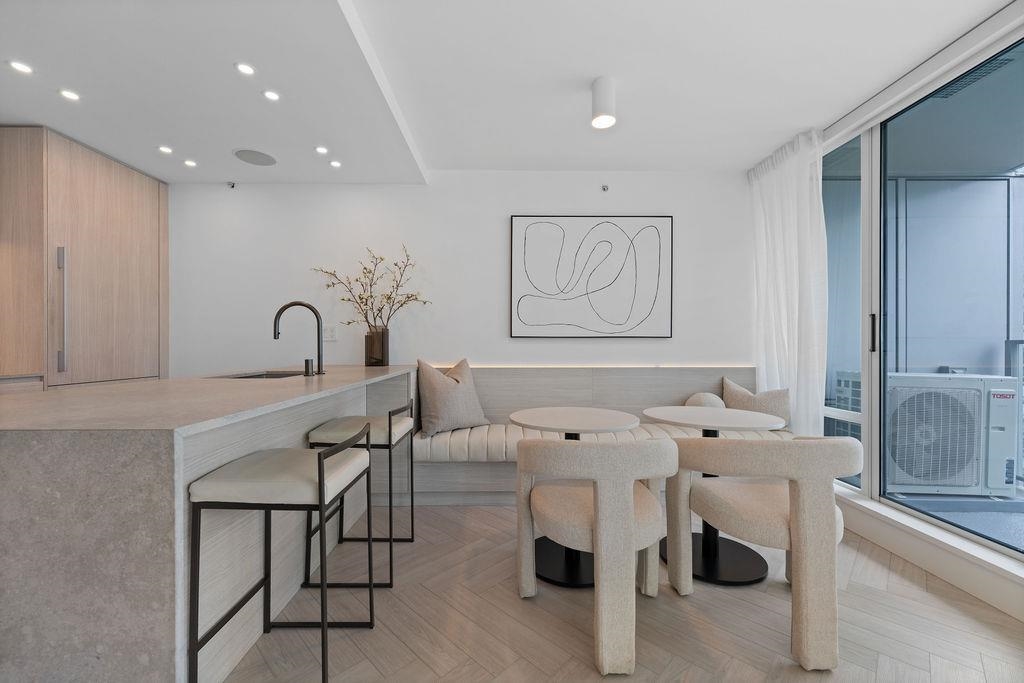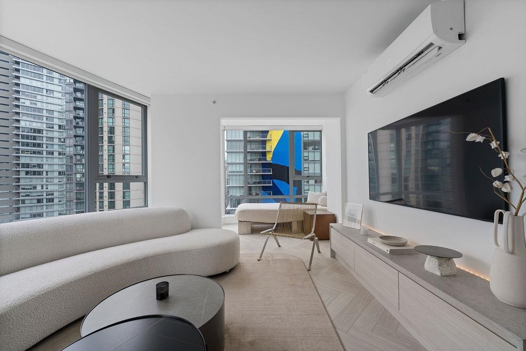 Custom renovated high-floor corner home at 'Azura 1'! Featuring permitted AC, a fantastic layout w/ flex + den, herringbone flooring, motorized blinds, & northwest exposure w/ city views. Extensive built-in millwork, ambient lighting & integrated speakers. Integrated fridge (water & ice) & dishwasher, AEG gas cooktop & oven, under counter microwave. Stone quartz counters/backsplash/waterfall & lounge-inspired banquette seating wraps into the dining area. Flex room off the kitchen is complete with built-in storage, while the stunning bathroom design features extensive wall-to-wall Italian textured tile, a walk-in shower w/ rain head & handheld, a floating vanity w/ medicine cabinet for extensive storage. The bedroom has a built-in headboard & walk-in closet. 1 Parking & tons of amenities!