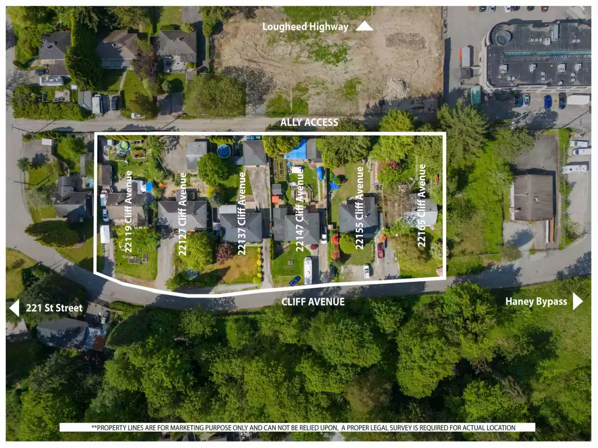 LAND ASSEMBLY in downtown Maple Ridge! Recent OCP amendment supports Low Rise Apartments 4-6 stories. Located within the Lougheed Transit Corridor and just outside the outer of the Transit Oriented Area. FSR up to 2.5 (includes bonus density) and all service at lot line or nearby. Situated on a quiet dead-end street, with lane access and the top floors will have unobstructed views of the Fraser River! Only steps from the West Coast Express, downtown Haney which includes shopping, restaurants, recreation and more! To be sold as a package with 22127, 22137, 22147, 22155 and 22165 Cliff Ave. Package price $11,999,400. Private showings only! Do NOT walk on the properties without an appointment.