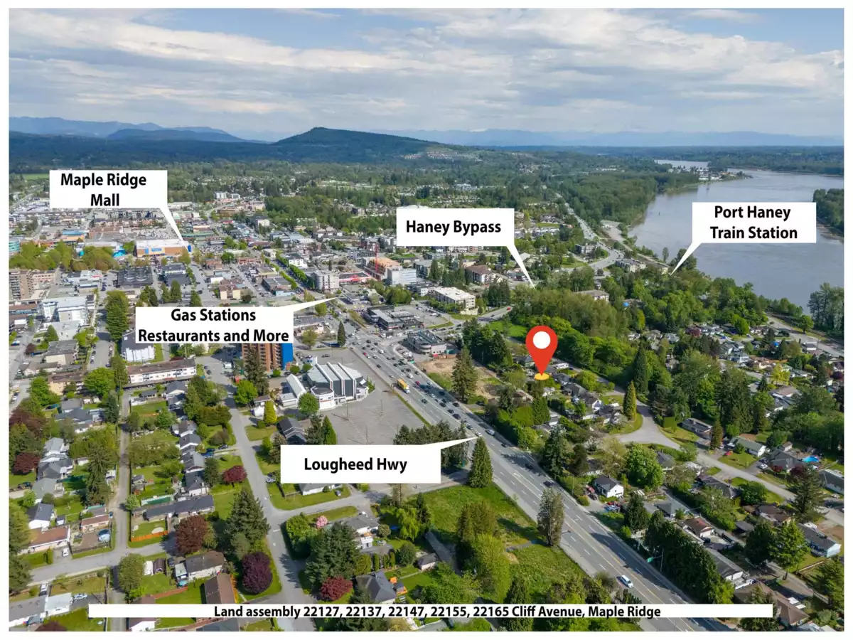 LAND ASSEMBLY in downtown Maple Ridge! Recent OCP amendment supports Low Rise Apartments 4-6 stories. Located within the Lougheed Transit Corridor and just outside the outer of the Transit Oriented Area. FSR up to 2.5 (includes bonus density) and all service at lot line or nearby. Situated on a quiet dead-end street, with lane access and the top floors will have unobstructed views of the Fraser River! Only steps from the West Coast Express, downtown Haney which includes shopping, restaurants, recreation and more! To be sold as a package with 22119, 22127, 22147, 22155 and 22165 Cliff Ave. Package price $11,999,400. Private showings only! Do NOT walk on the properties without an appointment.