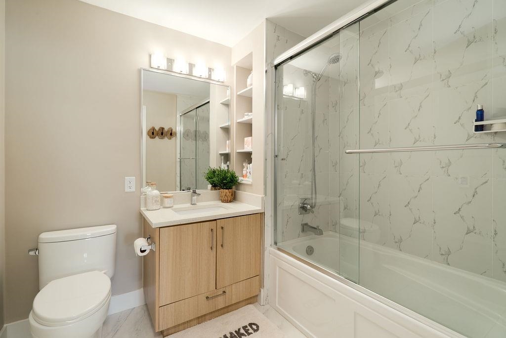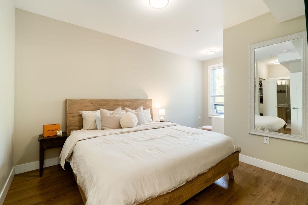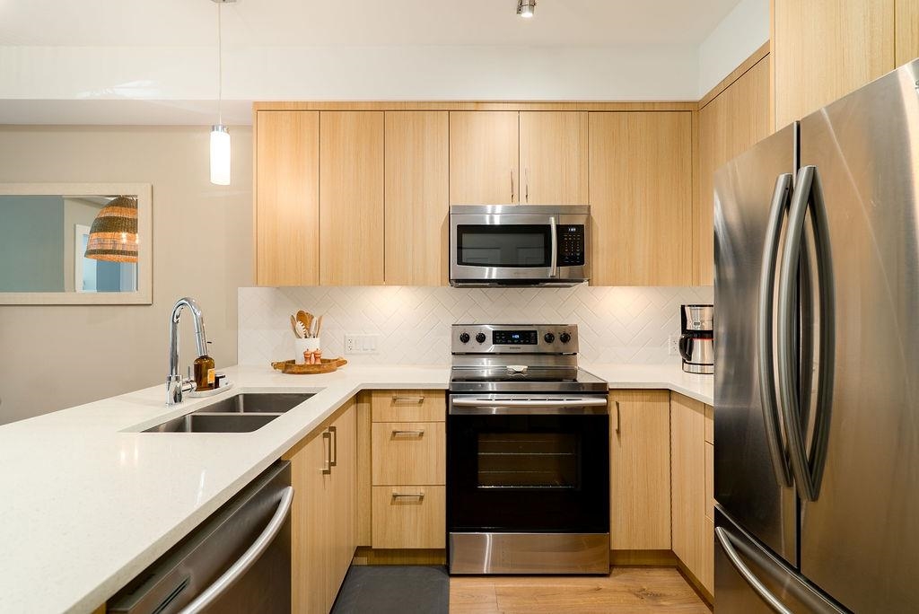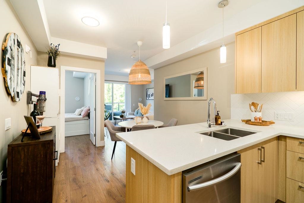 Welcome to The Orion - a sleek, West Coast development located in the heart of Pitt Meadows. Ideally situated within walking distance to amenities, transit, shopping & WCE. Commuter friendly with quick access to Langley & tri-cities. This tranquil and bright west facing unit has a covered patio for all seasons and near serene walking trails, parks, schools & childcare. Featuring high quality laminate flooring throughout, in floor heating with non slip tiles in both bathrooms, upgraded kitchen backsplash & quartz counters through out. The large primary bedroom includes extra nook space, walk in closet with built in organizer. The second bedroom has tons of natural light & extra windows. Pet friendly, 2 pets allowed, any size. Low Strata Fees with remainder of new home warranty.