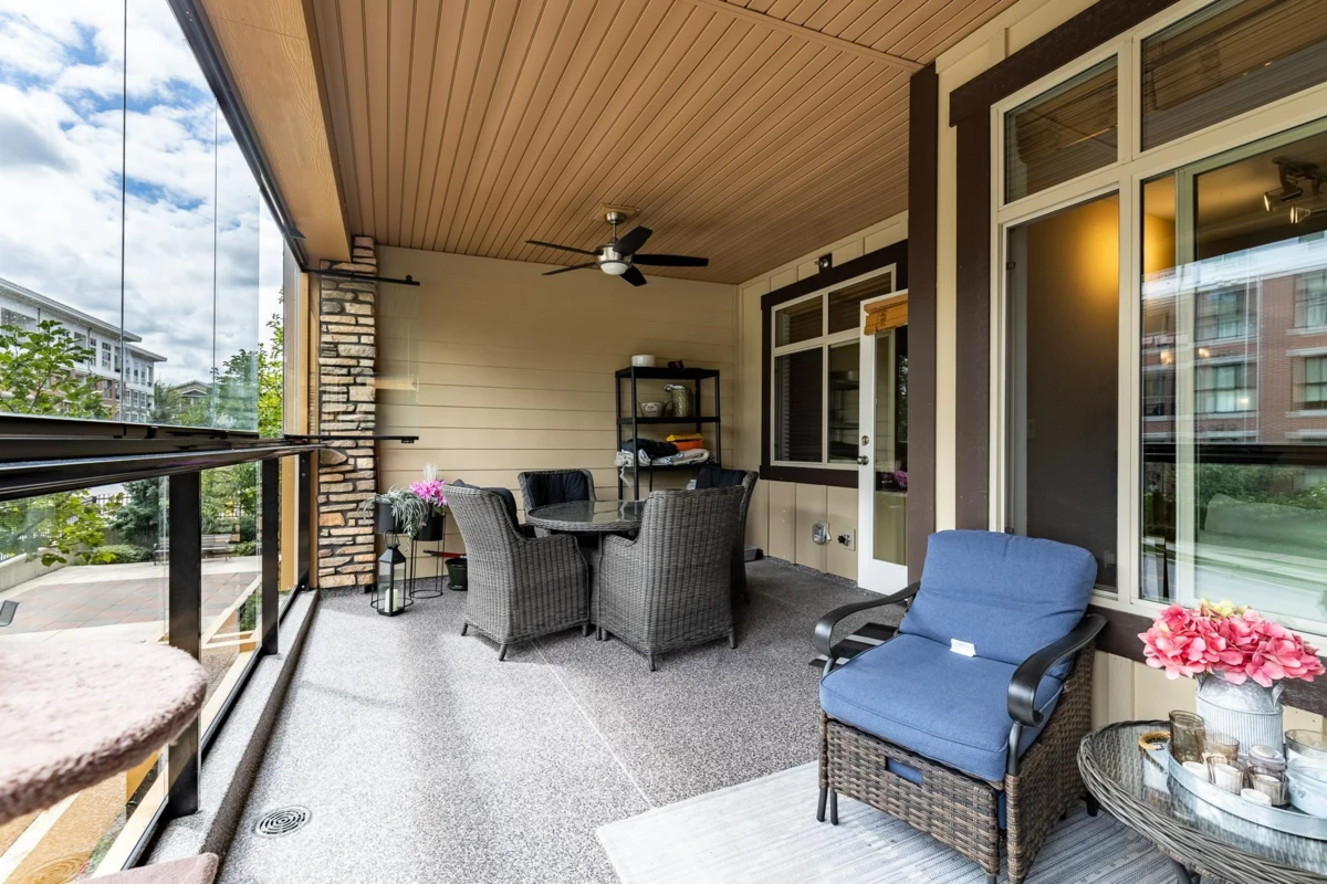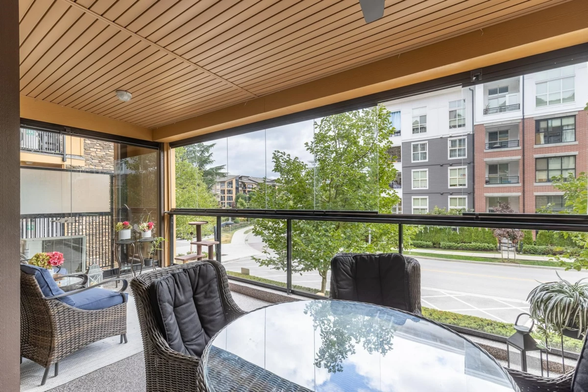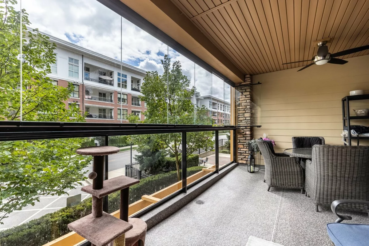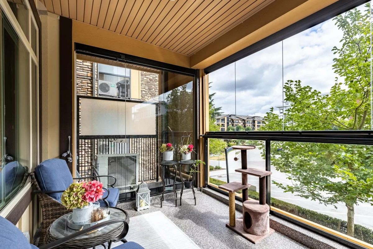 Discover Yorkson Creek living! This stunning condo features 2 bedrooms plus a flexible large den that easily works as a 3rd bedroom. Stay comfortable with AIR CONDITIONING, while bathrooms offer heated floors, heated mirrors, and a spa-like ensuite with dual sinks. The gourmet kitchen includes SS appliances, granite counters, gas range, and a very convenient pot filler. A highlight of this home is the retractable solarium—an all-season space perfect for BBQ'ing year round, relaxing or entertaining. Comes with 2 parking and a large storage unit. Extremely well run Strata with many happy owners and residents. Steps to schools, parks, soccer fields and baseball diamonds, Willoughby Town Centre, banks, restaurants and more. Contact your Realtor to make your viewing appointment. Vacant