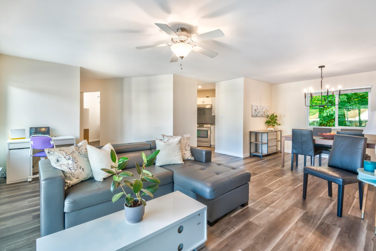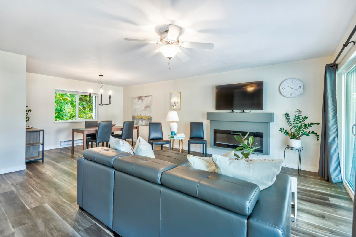 The Beautiful & Sought after HILLSIDE at Fraserview Village! Featuring this completely renovated 2 Bed, 2 Bath townhome located in the most desirable adult community! Updates include Vinyl & Tile flooring, kitchen w/quartz counters, Updated doors and designer lighting. Both bathrooms updated with vanities, mirrors, hardware & showers. Large and spacious rooms throughout. Living room includes a cozy fireplace that expands out through patio doors to a huge SOUTH facing covered sundeck. Surrounded by GREENBELT, the setting is peaceful and scenic. BONUS: Power for an EV charger in the garage! Strata fee includes the use of the amenities building, indoor pool, exercise equipment & club house. Pet friendly! Book your showing today!