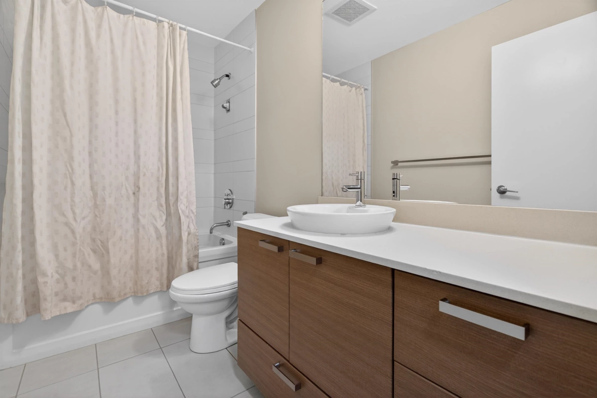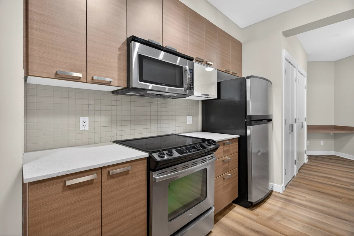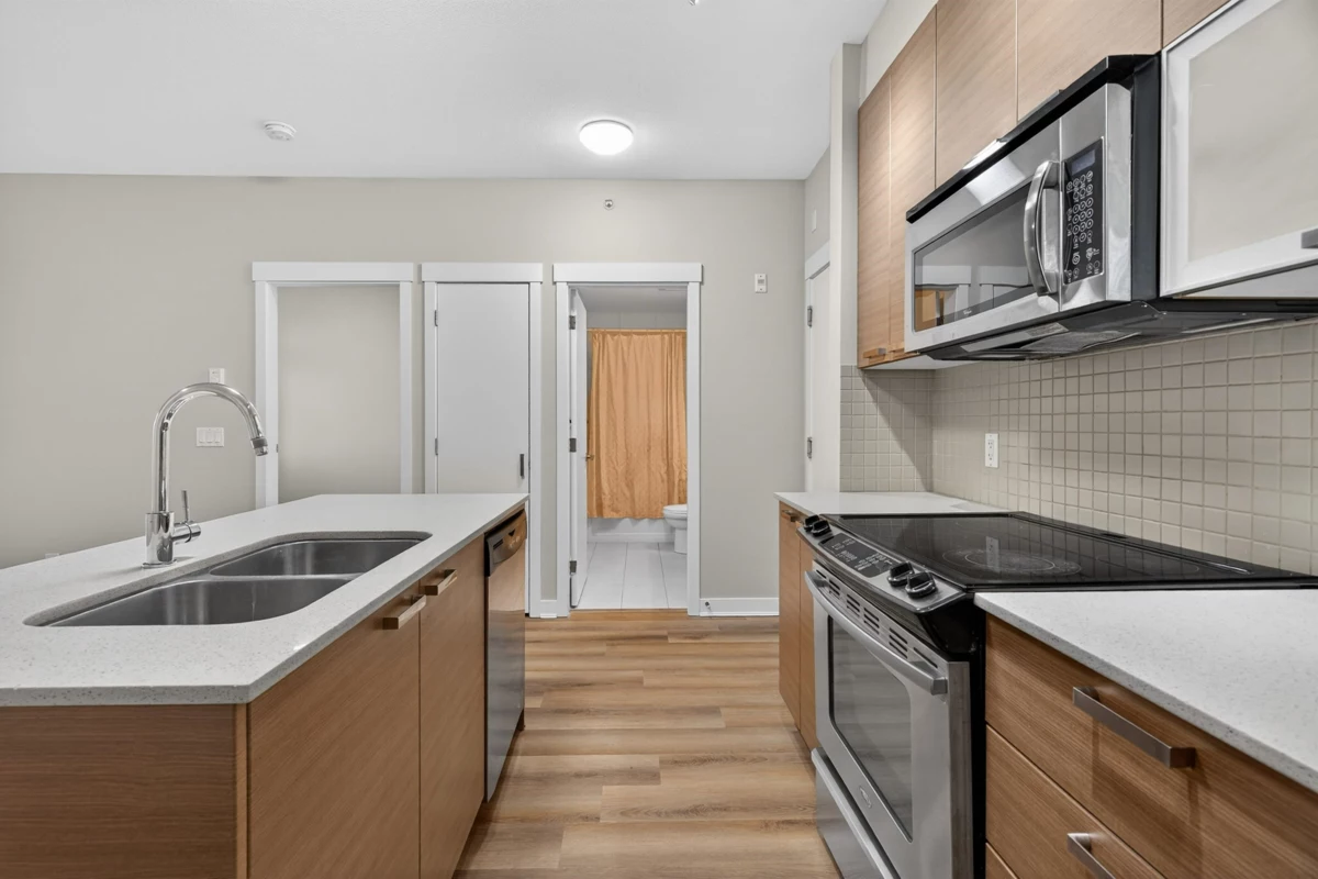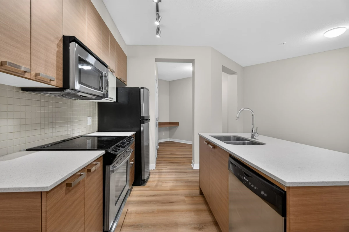 Welcome to Urban Living at Calera, where comfort meets convenience in the heart of Clayton Heights. This bright and spacious home offers an open-concept layout with a generous nook ideal for a home office or flex space. The modern kitchen anchors the home with quartz countertops, stainless steel appliances, wood-grain cabinetry, and a large island perfect for everyday living. The well-appointed bedroom provides a quiet retreat, while sliding doors lead to a deep, covered patio overlooking the inner courtyard—offering the feel of a private backyard with no road noise. Complete with underground parking, storage, and access to a gym and games/party room, all within walking distance to shops, dining, transit, and the future SkyTrain. Buy this home and enjoy 1-Year Buyer Satisfaction Guarantee!