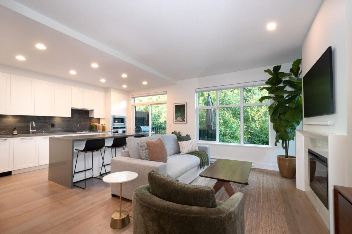 FABULOUS, DUPLEX STYLE TOWNHOME IN COVETED HADLEIGH ON THE PARK!! This immaculate home boasts privacy and serenity as it's nestled against the greenbelt...walk out to trails from your own fenced yard! Upscale, Tudor inspired complex boasts a great location across from Pioneer Park. Main level features eng. white oak flooring, gorgeous Chef's kitchen with entertaining island, stone counters, custom white cabinetry, and upscale, panelled appliances. Oversized windows bring in abundant natural light and lovely greenbelt views! Up are 3 generous bedrooms, each with an ensuite. Primary has a huge walk-in closet and a gorgeous ensuite. Lower level is bright and offers large Rec Room, a large bedroom w/walk-in closets and full bath. Walk out to your private yard, enhanced with artificial turf!