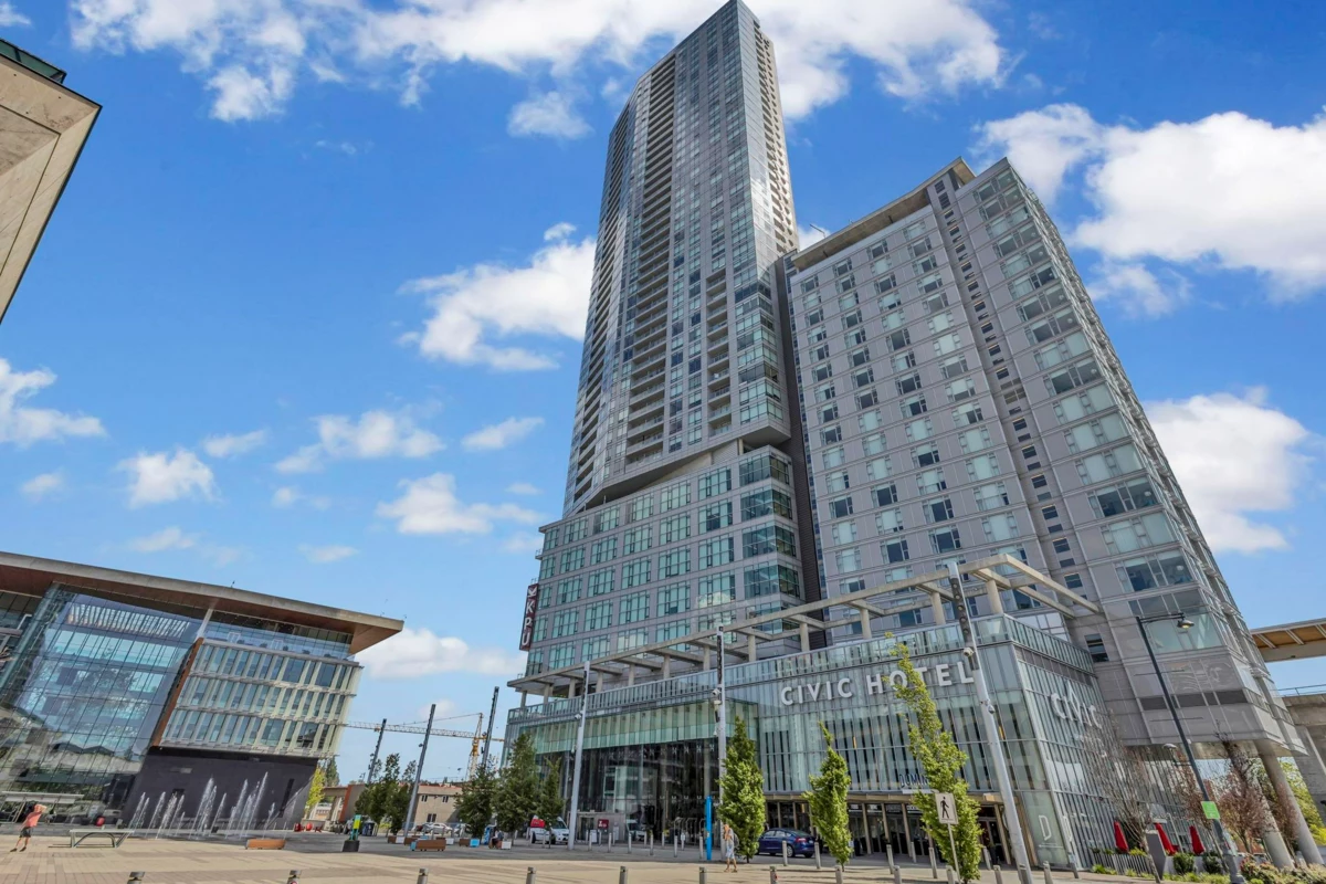 The Landmark in Central! Come to enjoy surrey's new metropolitan lifestyle at 3 Civic Plaza. Surrounded by central library, recreation center, city hall, universities and hundreds of restaurants. One stop shopping mall nearby plus sky train and bus station steps away from your home. This unit is over looking west panoramic views from south to North shore mountains. Good size 2 bedrooms/2 bathrooms with your in-suite laundry. Over-height ceilings, floor-to-ceiling windows, covered balcony, s/s appliances, quartz counters. Tenanted and nice tenants would like to stay. 1 parking and 1 storage locker allocated to the unit. Don't miss out and call for your private viewing.