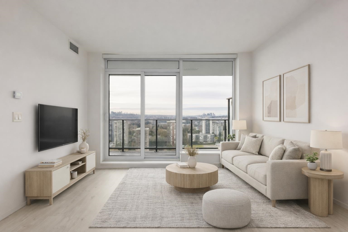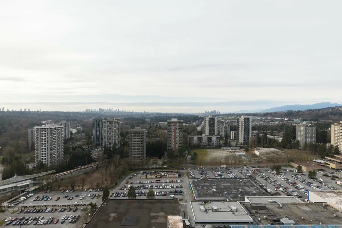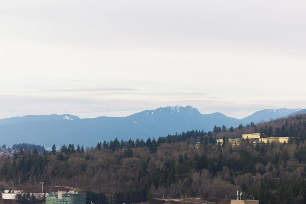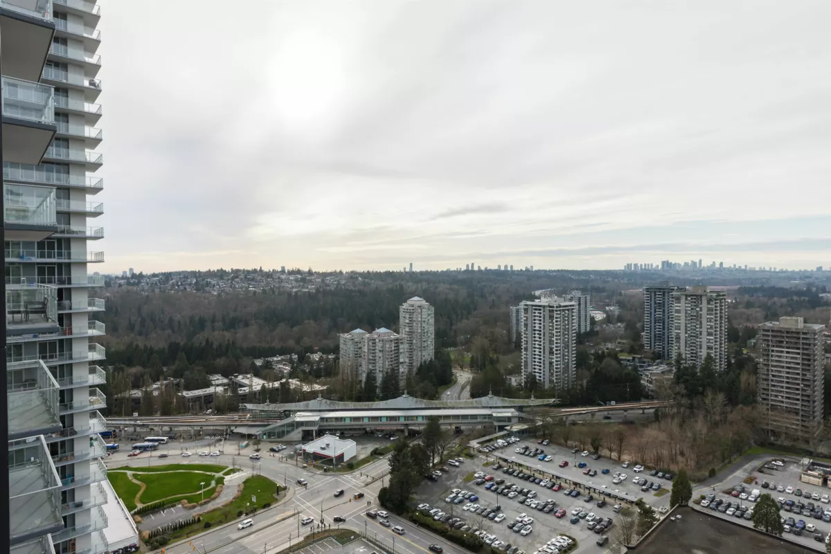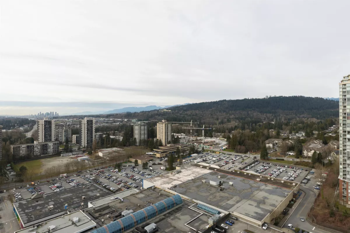 Welcome to this bright west-facing home, offering unobstructed mountain & city views through expansive floor-to-ceiling windows. The efficient rectangular layout maximizes every square foot with no wasted space. A modern kitchen anchors the home with Bosch appliances, a large island, & seamless flow into the living area, ideal for daily living & entertaining. Enjoy year-round comfort with air conditioning & extend your living space outdoors on the large patio. This master-planned community features a full-service clubhouse with gym, yoga studio, games room, study rooms, kids’ play area, and rooftop patio with BBQs. Includes 24-hour concierge, shared EV charging, 1 parking stall, and storage locker. Steps to shops, restaurants, Lougheed Mall, and just a 3-minute walk to Lougheed Skytrain.